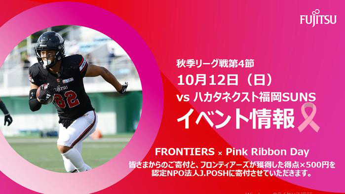 富士通フロンティアーズは、ピンクリボン運動(乳がんの正しい知識を広め、乳がん検診の早期受診を推進する運動)に賛同いたします。その証として推進月間に当たる10月の試合では、募金活動を実施いたします。