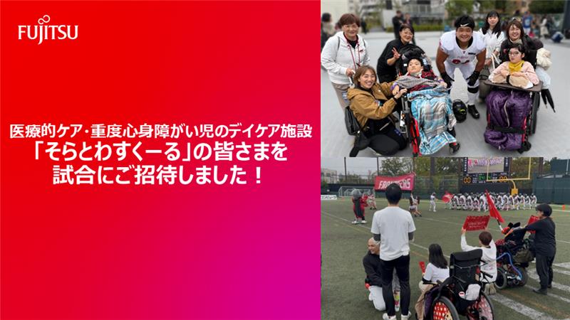 富士通スタジアム川崎で開催された、富士通フロンティアーズ vs IBM BIG BLUE戦にて、川崎市中原区を拠点としている、医療的ケア・重度心身障がい児の放課後等デイサービス「そらとわすくーる」のお子様とご家族、スタッフの皆さまをご招待しました。