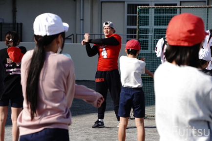 「どうやったらマッチョになれますか?」「どうやったらキャッチ上手くなれますか?」など選手の体作りや競技に関する質問が多くありました。「ご飯をたくさん食べてたくさんトレーニングしています!」筋肉を見せたり、ボールのキャッチのコツを実演したりしました。
