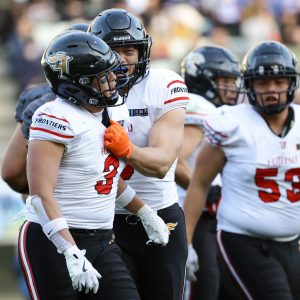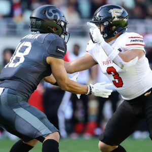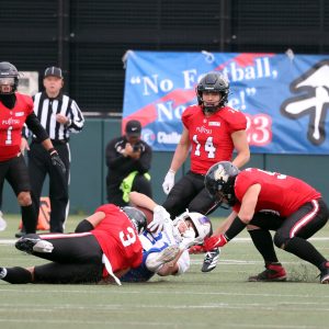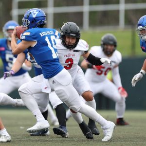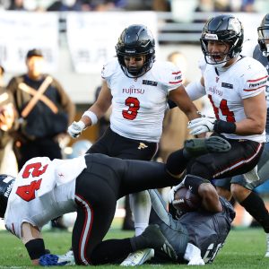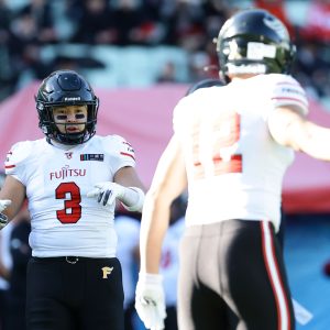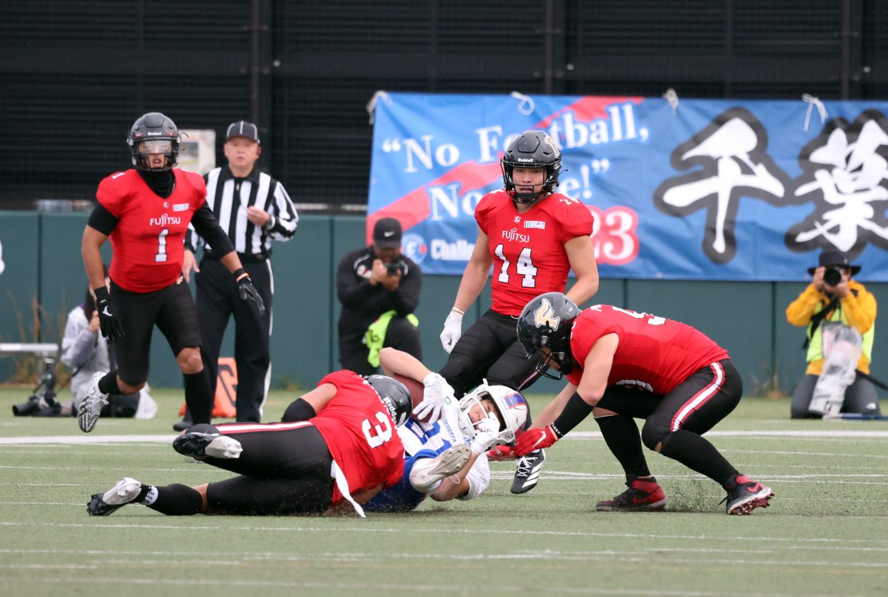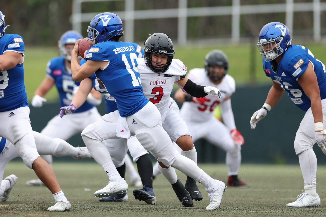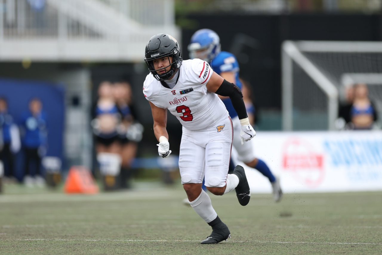 両チームの強力なオフェンスが点の取り合いを演じ、今季も2時間40分超えの熱戦となったビッグブルー戦。序盤から相手QBにプレッシャーを与え続けたのが、フロンティア…