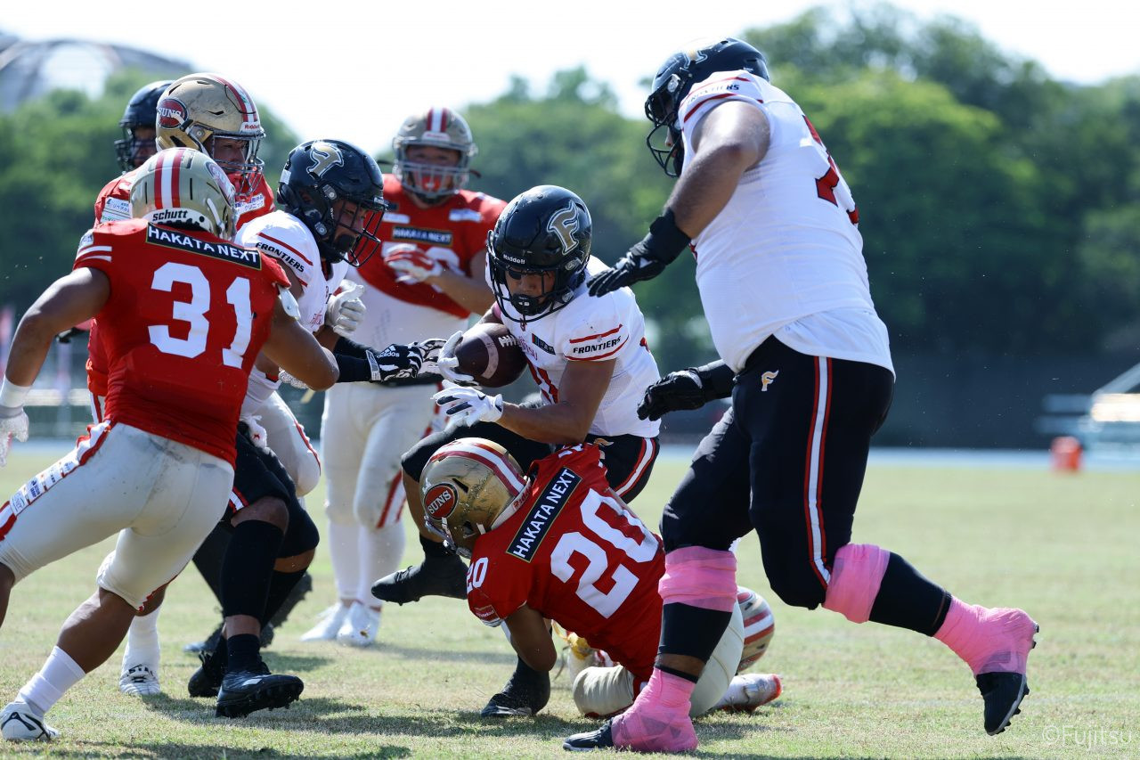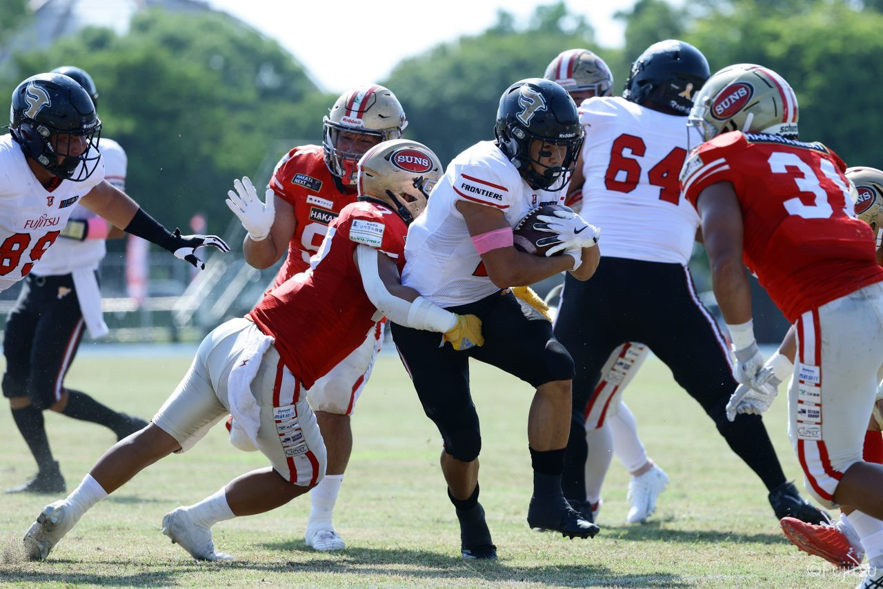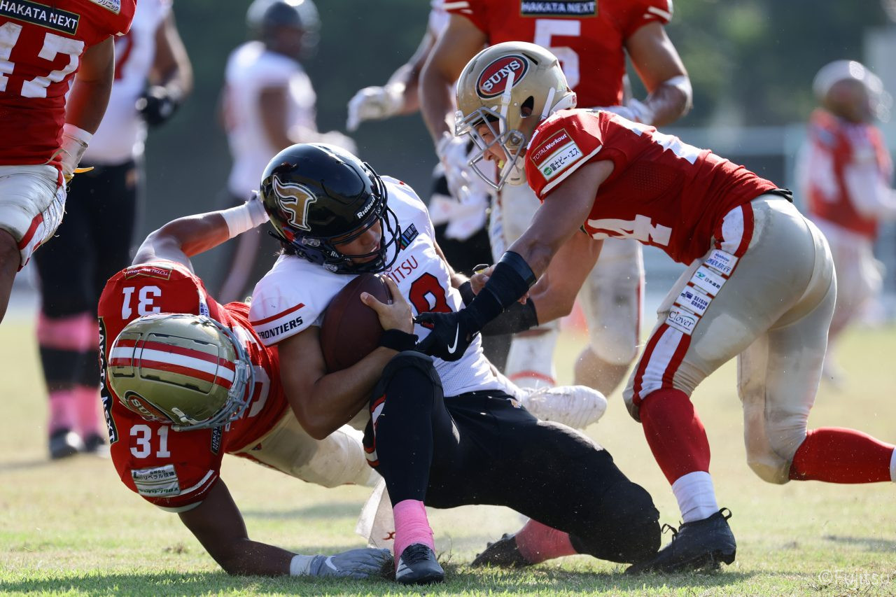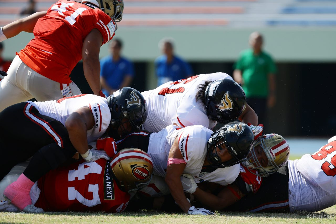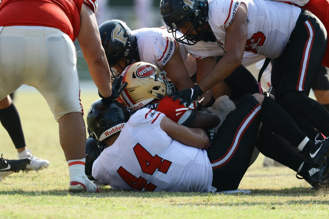 1Qから続いたSUNSのオフェンスシリーズだが、この日のディフェンス陣は好調。DB(ディフェンスバック)#29林のパスカットや、怪我から復調のDL(ディフェンスライン)#97水谷の活躍で4thダウンまで追い込むと、SUNSオフェンスはパントではなくプレーを選択しギャンブルを仕掛けてくる。しかし、放たれたパスをDB#29林が再びパスカットをしてみせ、ここを抑える。その後のオフェンスシリーズは反則で罰退するなど一時不調もあったがWR#16今中の16yパスキャッチなどを繋ぎ、最後はRB#4山嵜が30yを駆け上がりタッチダウン。28-0とさらに突き放す。その後のオフェンスシリーズもWR#10サマジーへのタッチダウンパスが通り35-0。試合開始から5シリーズを率いたQB#18高木は、全シリーズでタッチダウンを演出しこの日はここで退く。SUNSオフェンスも4thダウンギャンブルやパント体型からの意表を突くランプレーなどを展開し、これ以上突き放されまいとするものの、フロンティアーズディフェンス陣の高い壁が跳ね返す。その後、敵陣18yの好機から自身最初のシリーズを任されたQB#19鎌田は、WR#83柴田へタッチダウンパスを通し、わずか1プレーでタッチダウンを演出し42-0とさらに突き放す。K(キッカー)#5納所は前半全てのポイントアフターのキックを決め退いた。