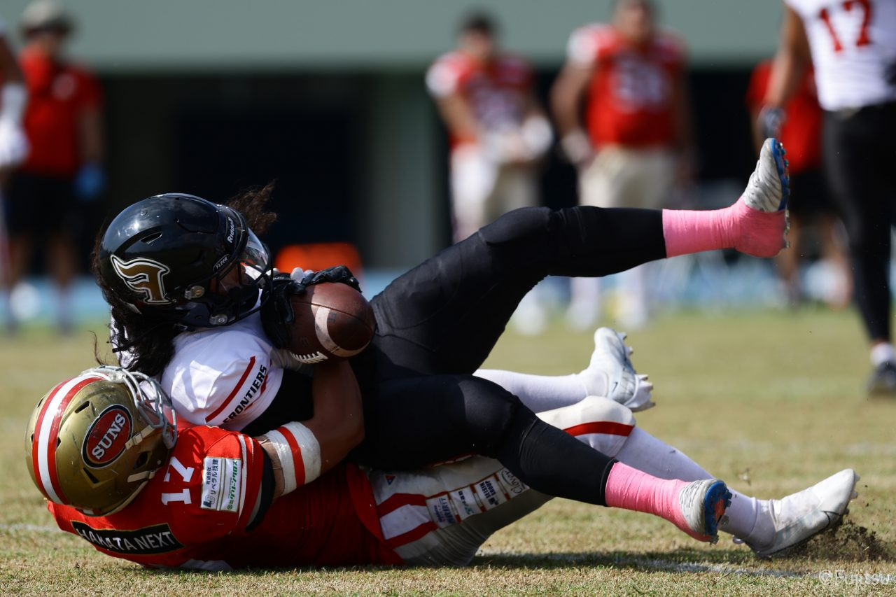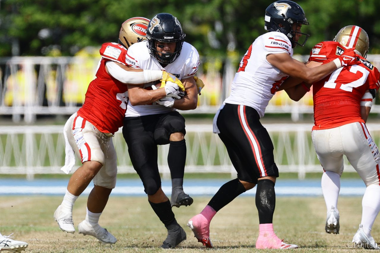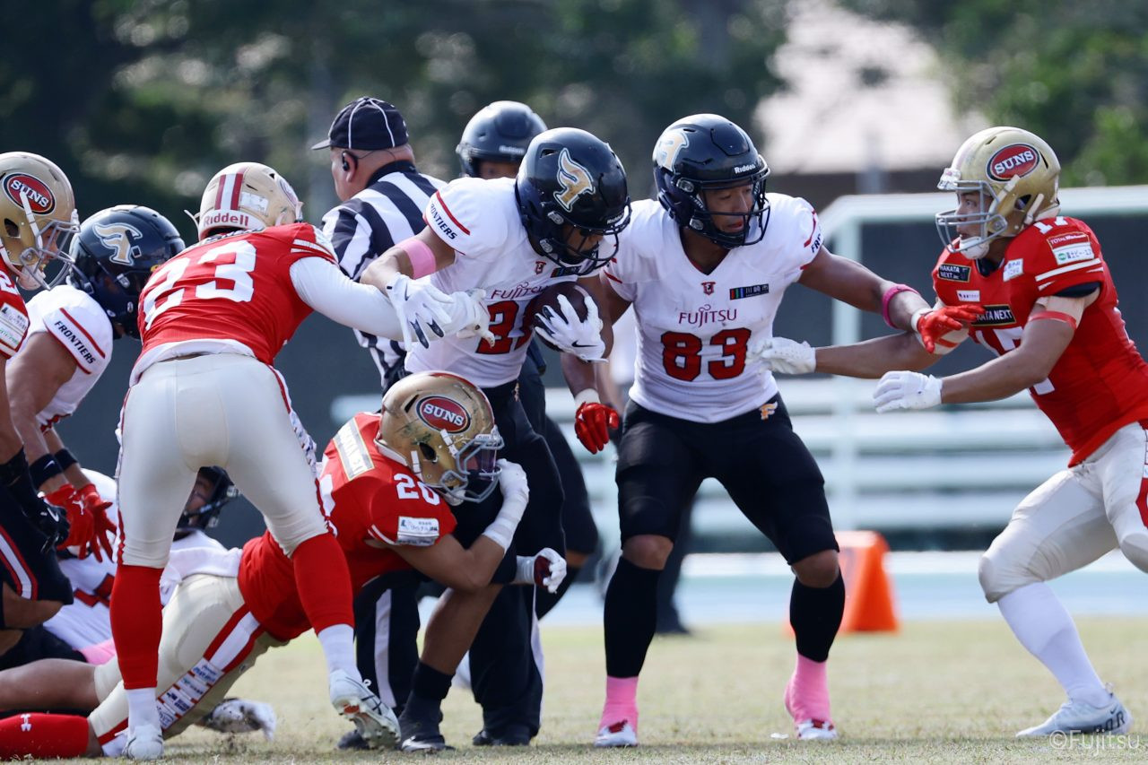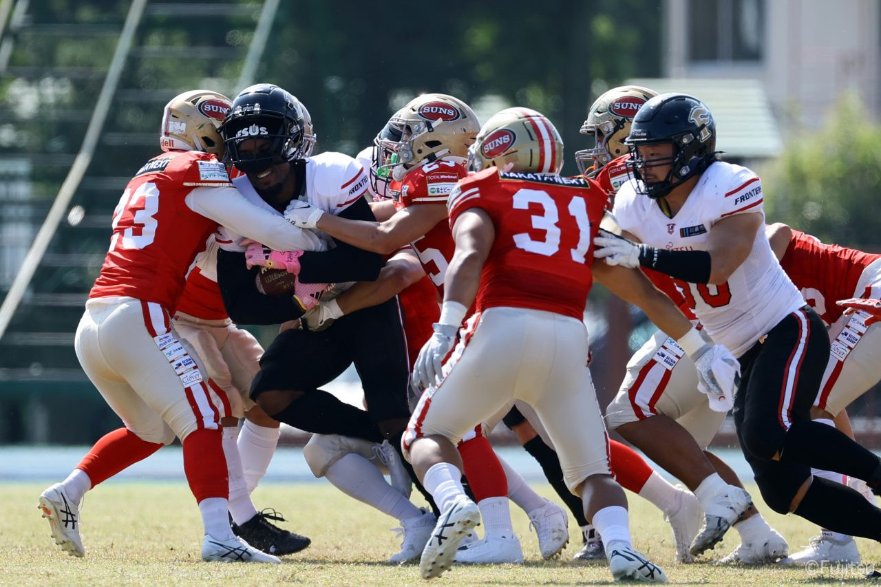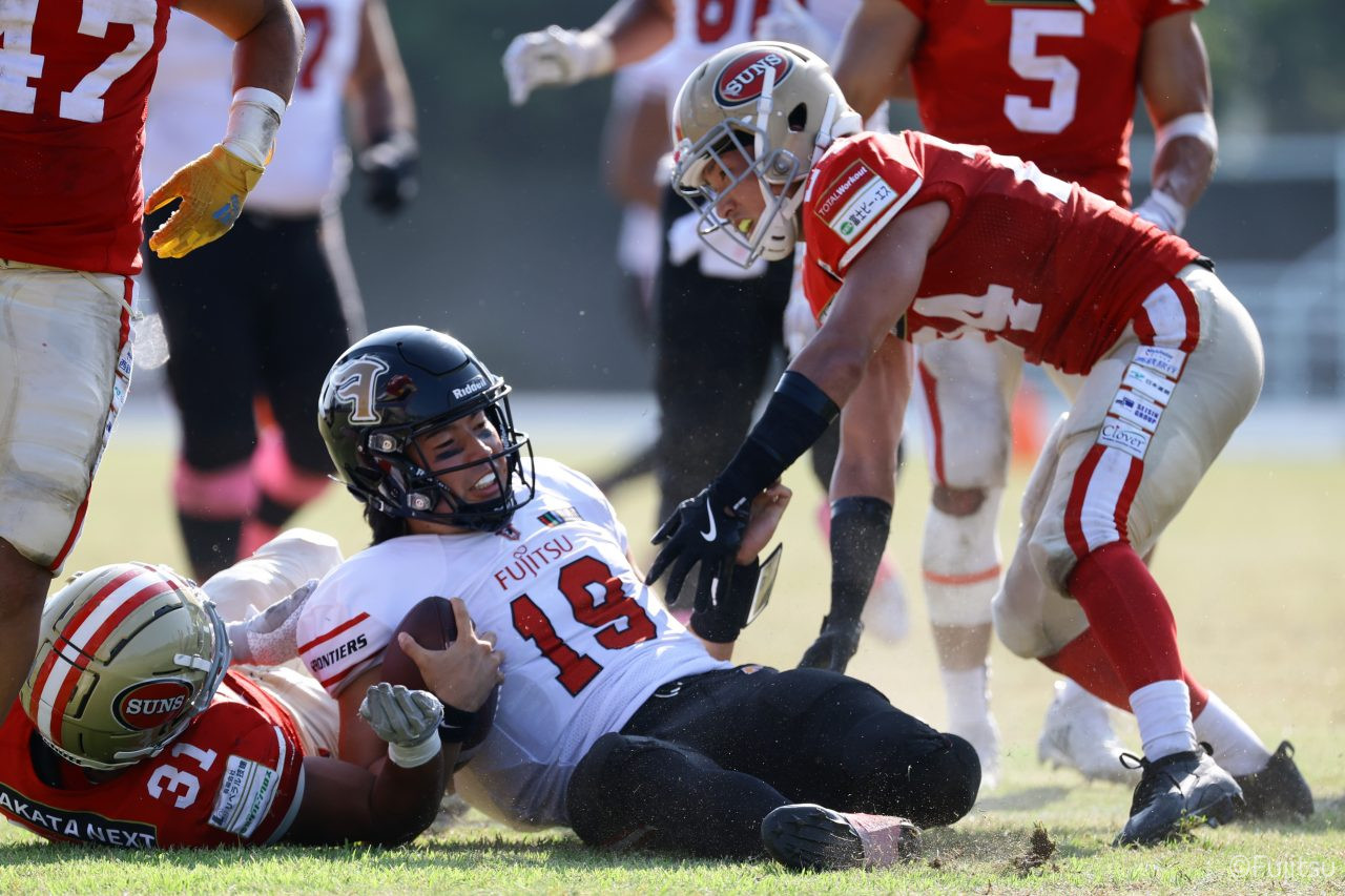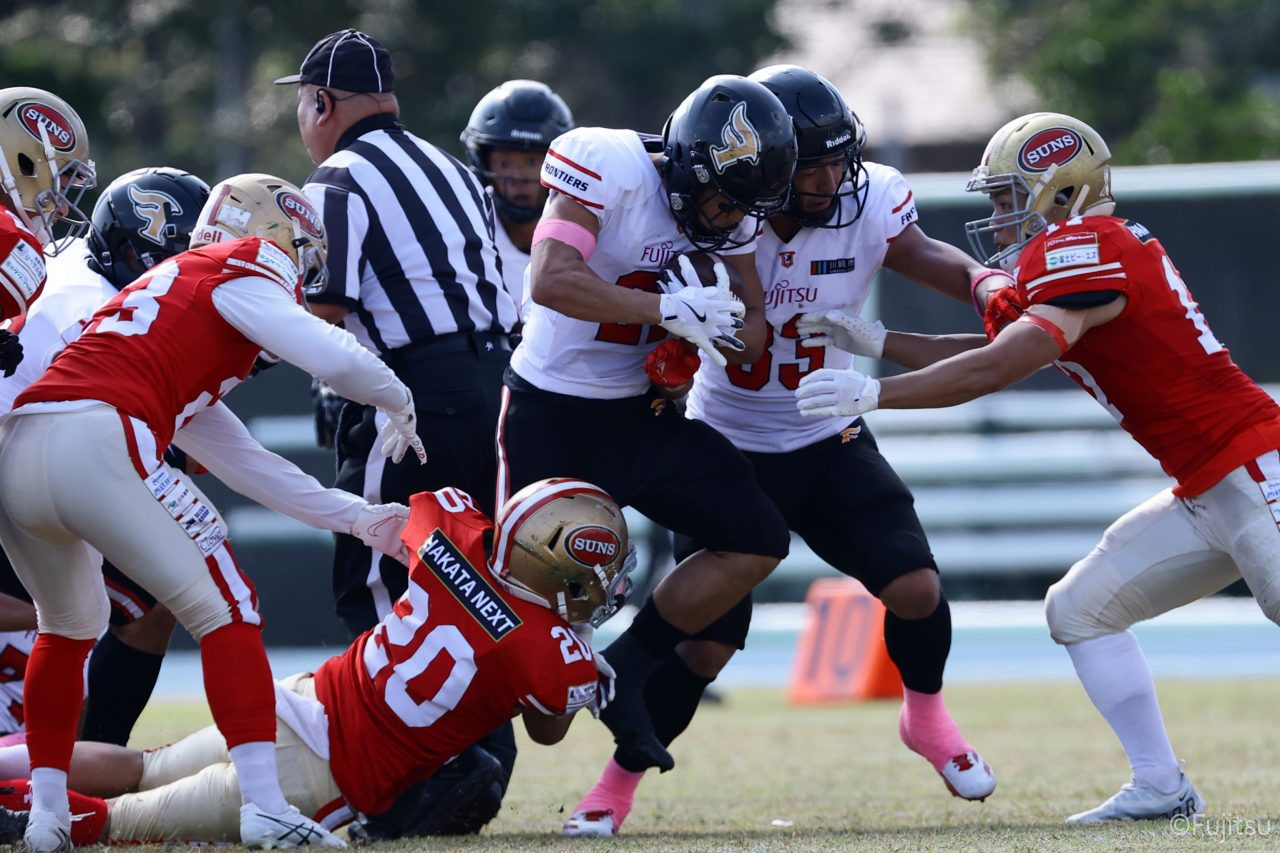 1Qから続いたSUNSのオフェンスシリーズだが、この日のディフェンス陣は好調。DB(ディフェンスバック)#29林のパスカットや、怪我から復調のDL(ディフェンスライン)#97水谷の活躍で4thダウンまで追い込むと、SUNSオフェンスはパントではなくプレーを選択しギャンブルを仕掛けてくる。しかし、放たれたパスをDB#29林が再びパスカットをしてみせ、ここを抑える。その後のオフェンスシリーズは反則で罰退するなど一時不調もあったがWR#16今中の16yパスキャッチなどを繋ぎ、最後はRB#4山嵜が30yを駆け上がりタッチダウン。28-0とさらに突き放す。その後のオフェンスシリーズもWR#10サマジーへのタッチダウンパスが通り35-0。試合開始から5シリーズを率いたQB#18高木は、全シリーズでタッチダウンを演出しこの日はここで退く。SUNSオフェンスも4thダウンギャンブルやパント体型からの意表を突くランプレーなどを展開し、これ以上突き放されまいとするものの、フロンティアーズディフェンス陣の高い壁が跳ね返す。その後、敵陣18yの好機から自身最初のシリーズを任されたQB#19鎌田は、WR#83柴田へタッチダウンパスを通し、わずか1プレーでタッチダウンを演出し42-0とさらに突き放す。K(キッカー)#5納所は前半全てのポイントアフターのキックを決め退いた。