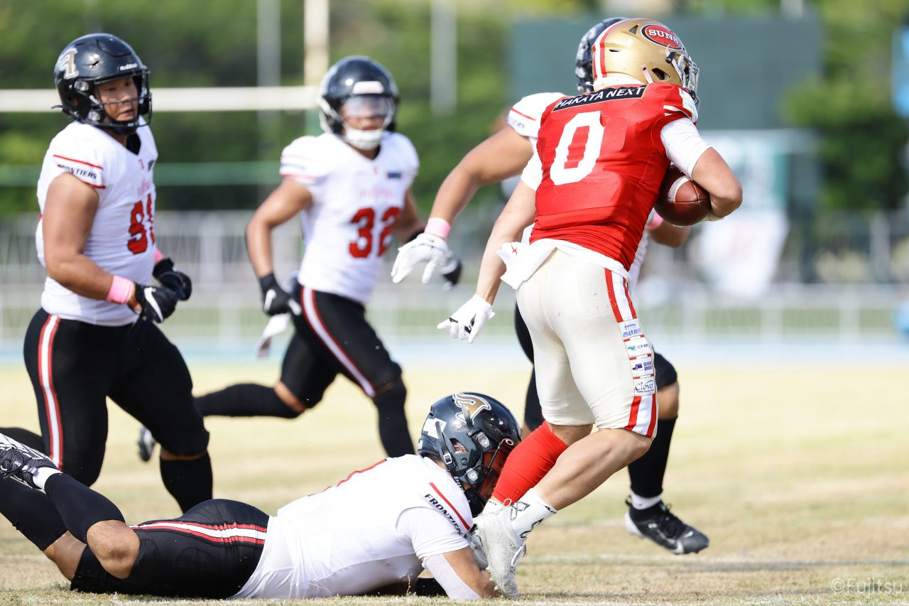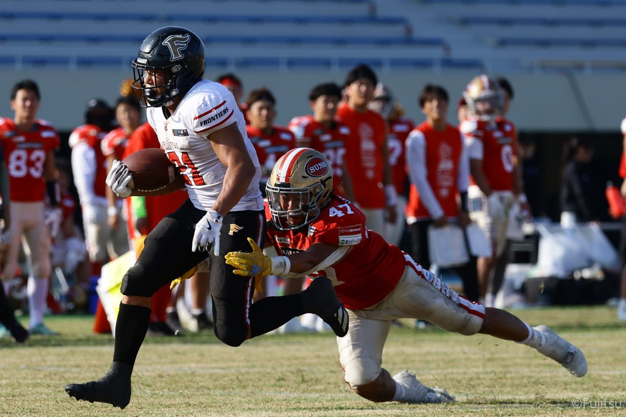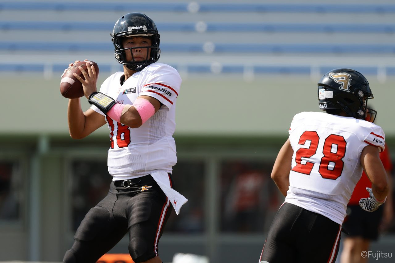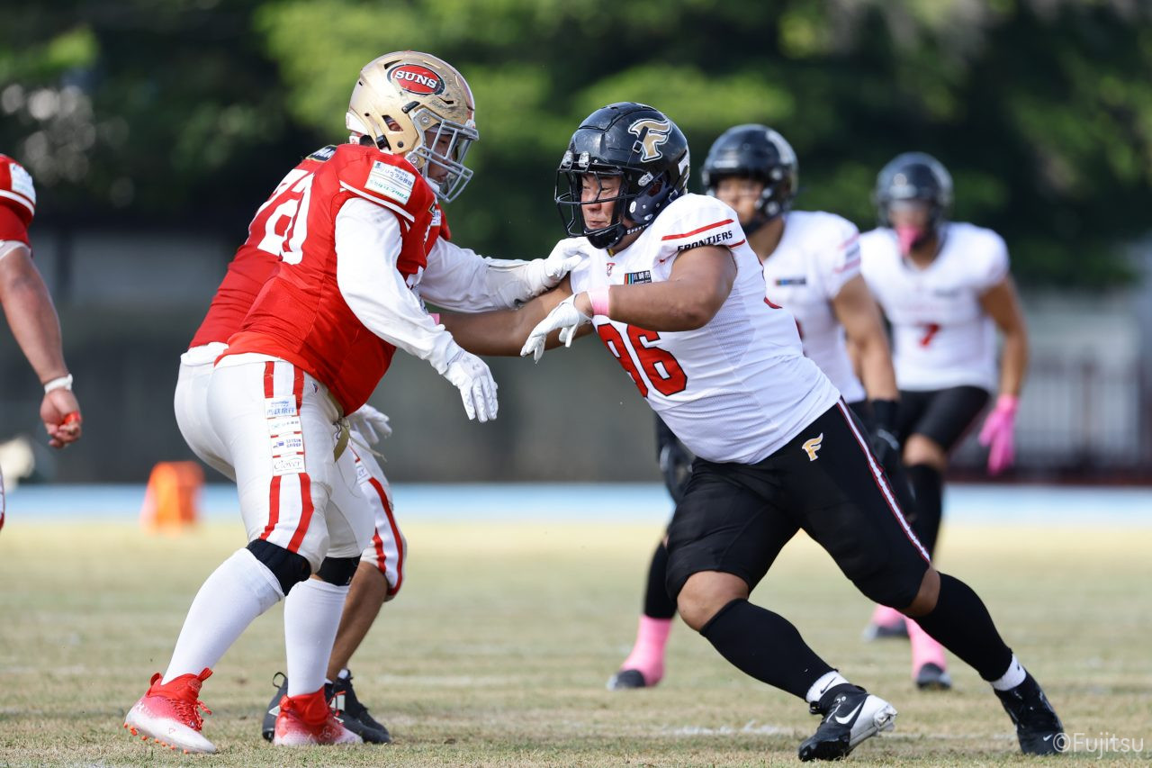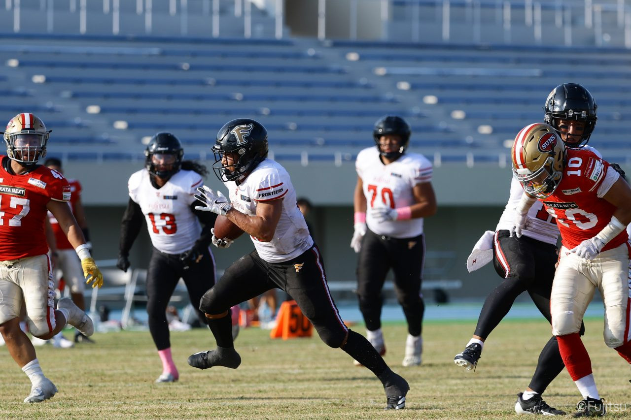 1Qから続いたSUNSのオフェンスシリーズだが、この日のディフェンス陣は好調。DB(ディフェンスバック)#29林のパスカットや、怪我から復調のDL(ディフェンスライン)#97水谷の活躍で4thダウンまで追い込むと、SUNSオフェンスはパントではなくプレーを選択しギャンブルを仕掛けてくる。しかし、放たれたパスをDB#29林が再びパスカットをしてみせ、ここを抑える。その後のオフェンスシリーズは反則で罰退するなど一時不調もあったがWR#16今中の16yパスキャッチなどを繋ぎ、最後はRB#4山嵜が30yを駆け上がりタッチダウン。28-0とさらに突き放す。その後のオフェンスシリーズもWR#10サマジーへのタッチダウンパスが通り35-0。試合開始から5シリーズを率いたQB#18高木は、全シリーズでタッチダウンを演出しこの日はここで退く。SUNSオフェンスも4thダウンギャンブルやパント体型からの意表を突くランプレーなどを展開し、これ以上突き放されまいとするものの、フロンティアーズディフェンス陣の高い壁が跳ね返す。その後、敵陣18yの好機から自身最初のシリーズを任されたQB#19鎌田は、WR#83柴田へタッチダウンパスを通し、わずか1プレーでタッチダウンを演出し42-0とさらに突き放す。K(キッカー)#5納所は前半全てのポイントアフターのキックを決め退いた。