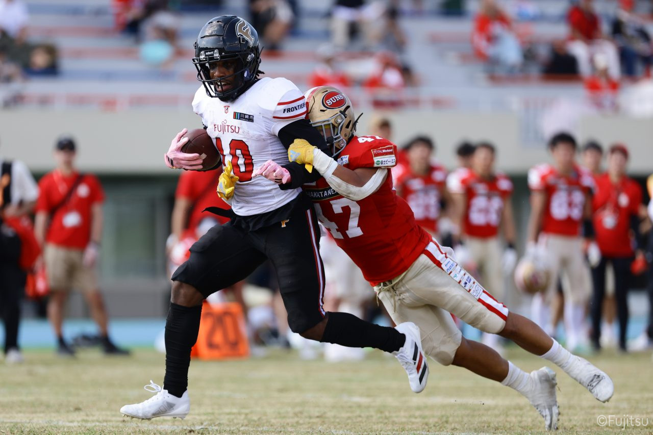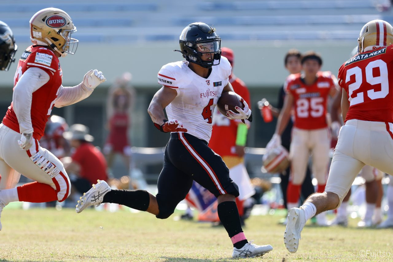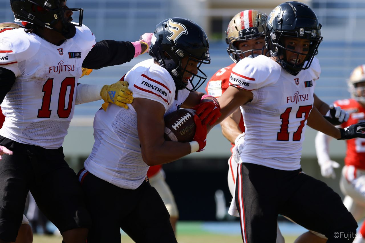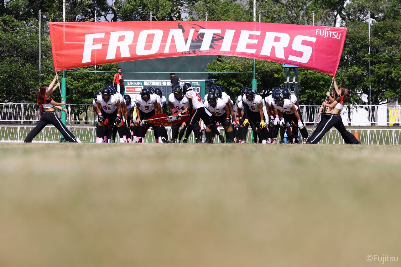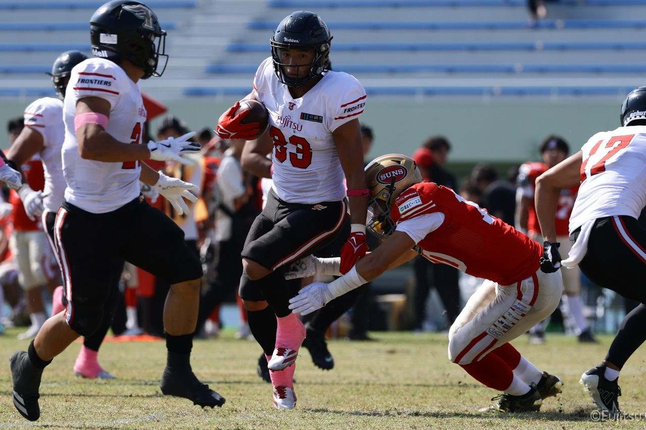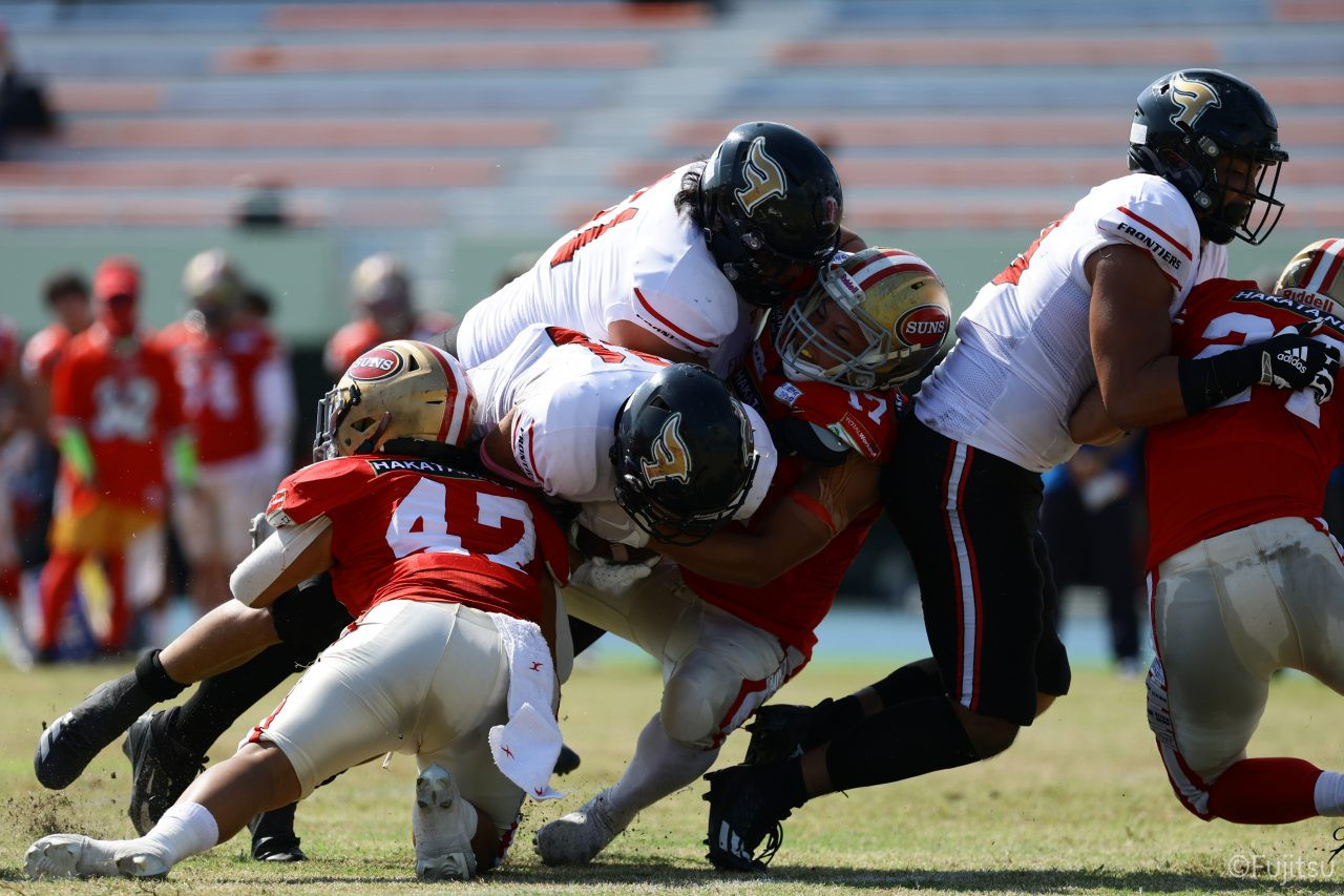 1Qから続いたSUNSのオフェンスシリーズだが、この日のディフェンス陣は好調。DB(ディフェンスバック)#29林のパスカットや、怪我から復調のDL(ディフェンスライン)#97水谷の活躍で4thダウンまで追い込むと、SUNSオフェンスはパントではなくプレーを選択しギャンブルを仕掛けてくる。しかし、放たれたパスをDB#29林が再びパスカットをしてみせ、ここを抑える。その後のオフェンスシリーズは反則で罰退するなど一時不調もあったがWR#16今中の16yパスキャッチなどを繋ぎ、最後はRB#4山嵜が30yを駆け上がりタッチダウン。28-0とさらに突き放す。その後のオフェンスシリーズもWR#10サマジーへのタッチダウンパスが通り35-0。試合開始から5シリーズを率いたQB#18高木は、全シリーズでタッチダウンを演出しこの日はここで退く。SUNSオフェンスも4thダウンギャンブルやパント体型からの意表を突くランプレーなどを展開し、これ以上突き放されまいとするものの、フロンティアーズディフェンス陣の高い壁が跳ね返す。その後、敵陣18yの好機から自身最初のシリーズを任されたQB#19鎌田は、WR#83柴田へタッチダウンパスを通し、わずか1プレーでタッチダウンを演出し42-0とさらに突き放す。K(キッカー)#5納所は前半全てのポイントアフターのキックを決め退いた。