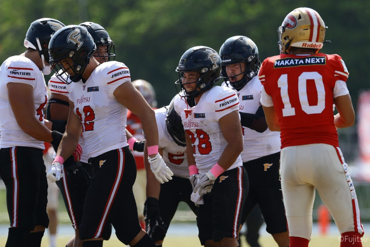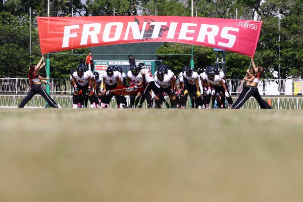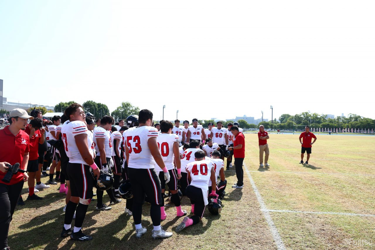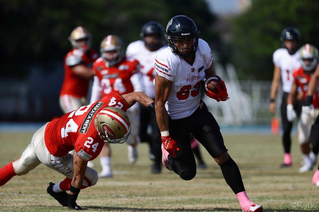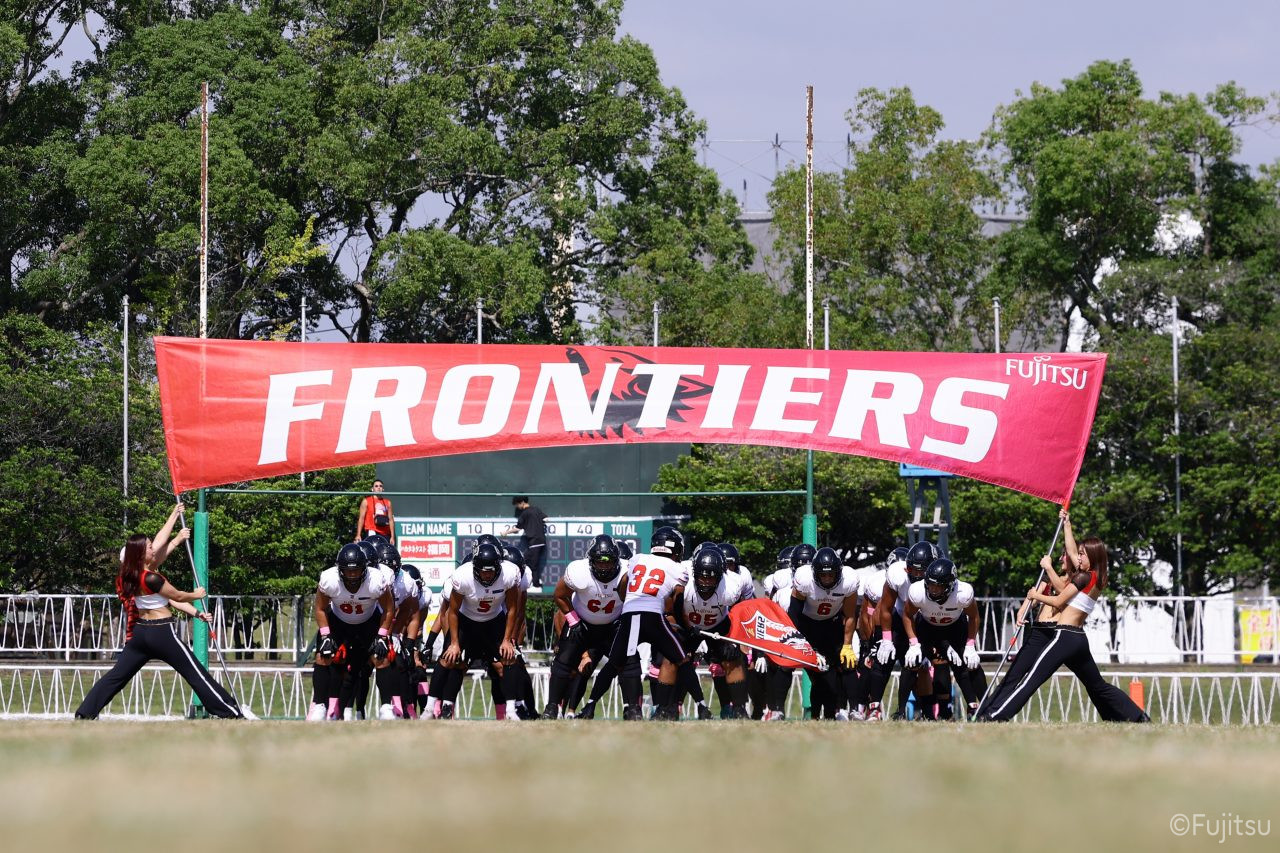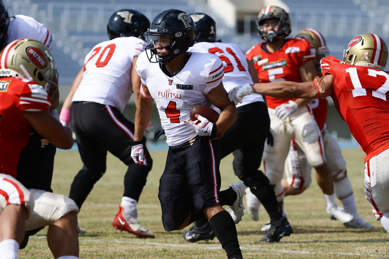 1Qから続いたSUNSのオフェンスシリーズだが、この日のディフェンス陣は好調。DB(ディフェンスバック)#29林のパスカットや、怪我から復調のDL(ディフェンスライン)#97水谷の活躍で4thダウンまで追い込むと、SUNSオフェンスはパントではなくプレーを選択しギャンブルを仕掛けてくる。しかし、放たれたパスをDB#29林が再びパスカットをしてみせ、ここを抑える。その後のオフェンスシリーズは反則で罰退するなど一時不調もあったがWR#16今中の16yパスキャッチなどを繋ぎ、最後はRB#4山嵜が30yを駆け上がりタッチダウン。28-0とさらに突き放す。その後のオフェンスシリーズもWR#10サマジーへのタッチダウンパスが通り35-0。試合開始から5シリーズを率いたQB#18高木は、全シリーズでタッチダウンを演出しこの日はここで退く。SUNSオフェンスも4thダウンギャンブルやパント体型からの意表を突くランプレーなどを展開し、これ以上突き放されまいとするものの、フロンティアーズディフェンス陣の高い壁が跳ね返す。その後、敵陣18yの好機から自身最初のシリーズを任されたQB#19鎌田は、WR#83柴田へタッチダウンパスを通し、わずか1プレーでタッチダウンを演出し42-0とさらに突き放す。K(キッカー)#5納所は前半全てのポイントアフターのキックを決め退いた。