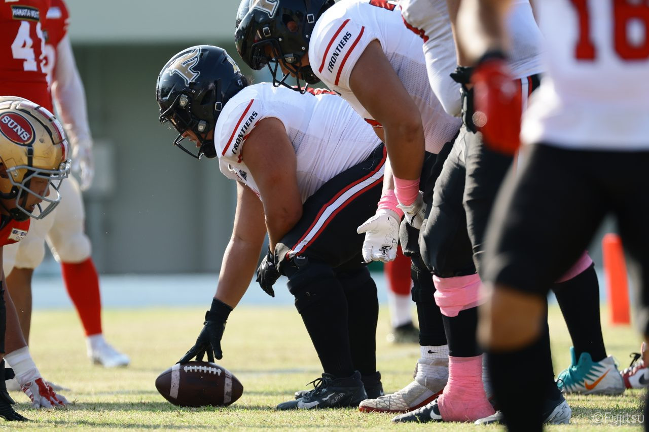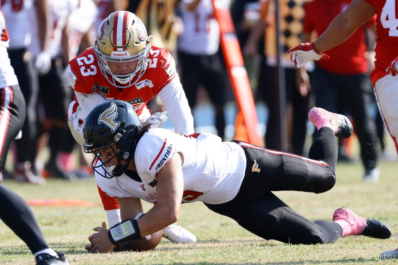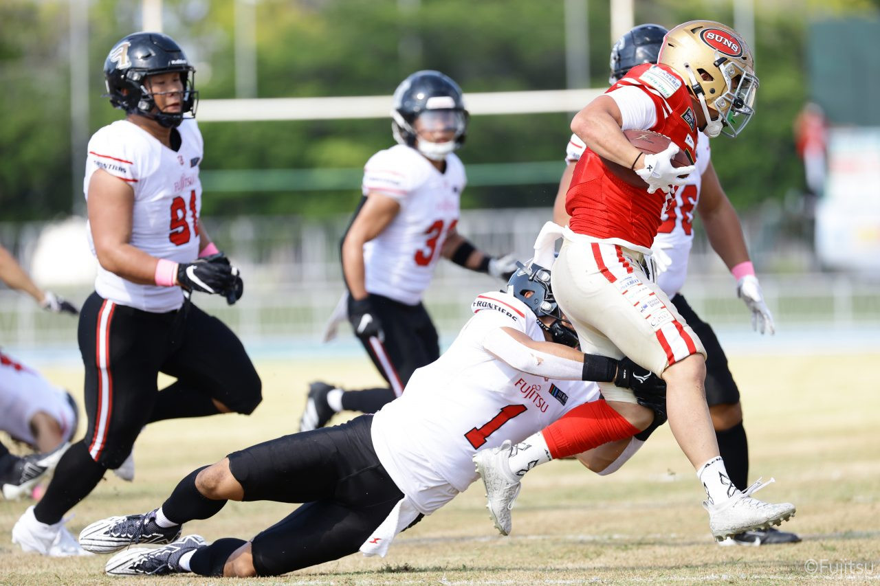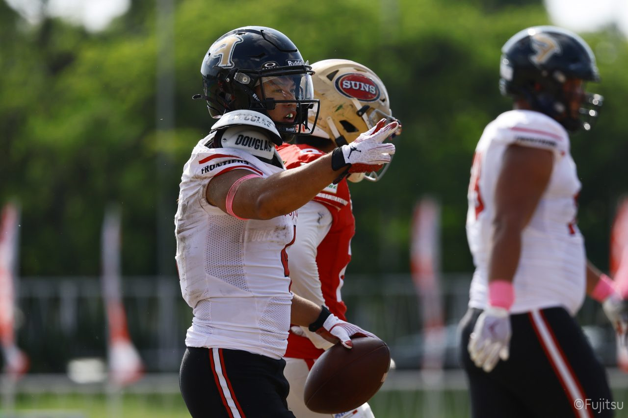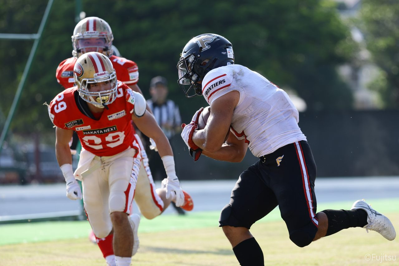 1Qから続いたSUNSのオフェンスシリーズだが、この日のディフェンス陣は好調。DB(ディフェンスバック)#29林のパスカットや、怪我から復調のDL(ディフェンスライン)#97水谷の活躍で4thダウンまで追い込むと、SUNSオフェンスはパントではなくプレーを選択しギャンブルを仕掛けてくる。しかし、放たれたパスをDB#29林が再びパスカットをしてみせ、ここを抑える。その後のオフェンスシリーズは反則で罰退するなど一時不調もあったがWR#16今中の16yパスキャッチなどを繋ぎ、最後はRB#4山嵜が30yを駆け上がりタッチダウン。28-0とさらに突き放す。その後のオフェンスシリーズもWR#10サマジーへのタッチダウンパスが通り35-0。試合開始から5シリーズを率いたQB#18高木は、全シリーズでタッチダウンを演出しこの日はここで退く。SUNSオフェンスも4thダウンギャンブルやパント体型からの意表を突くランプレーなどを展開し、これ以上突き放されまいとするものの、フロンティアーズディフェンス陣の高い壁が跳ね返す。その後、敵陣18yの好機から自身最初のシリーズを任されたQB#19鎌田は、WR#83柴田へタッチダウンパスを通し、わずか1プレーでタッチダウンを演出し42-0とさらに突き放す。K(キッカー)#5納所は前半全てのポイントアフターのキックを決め退いた。