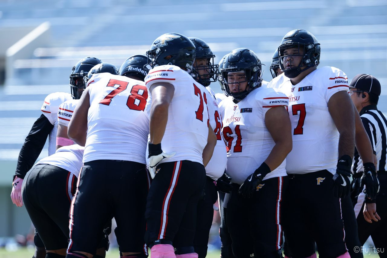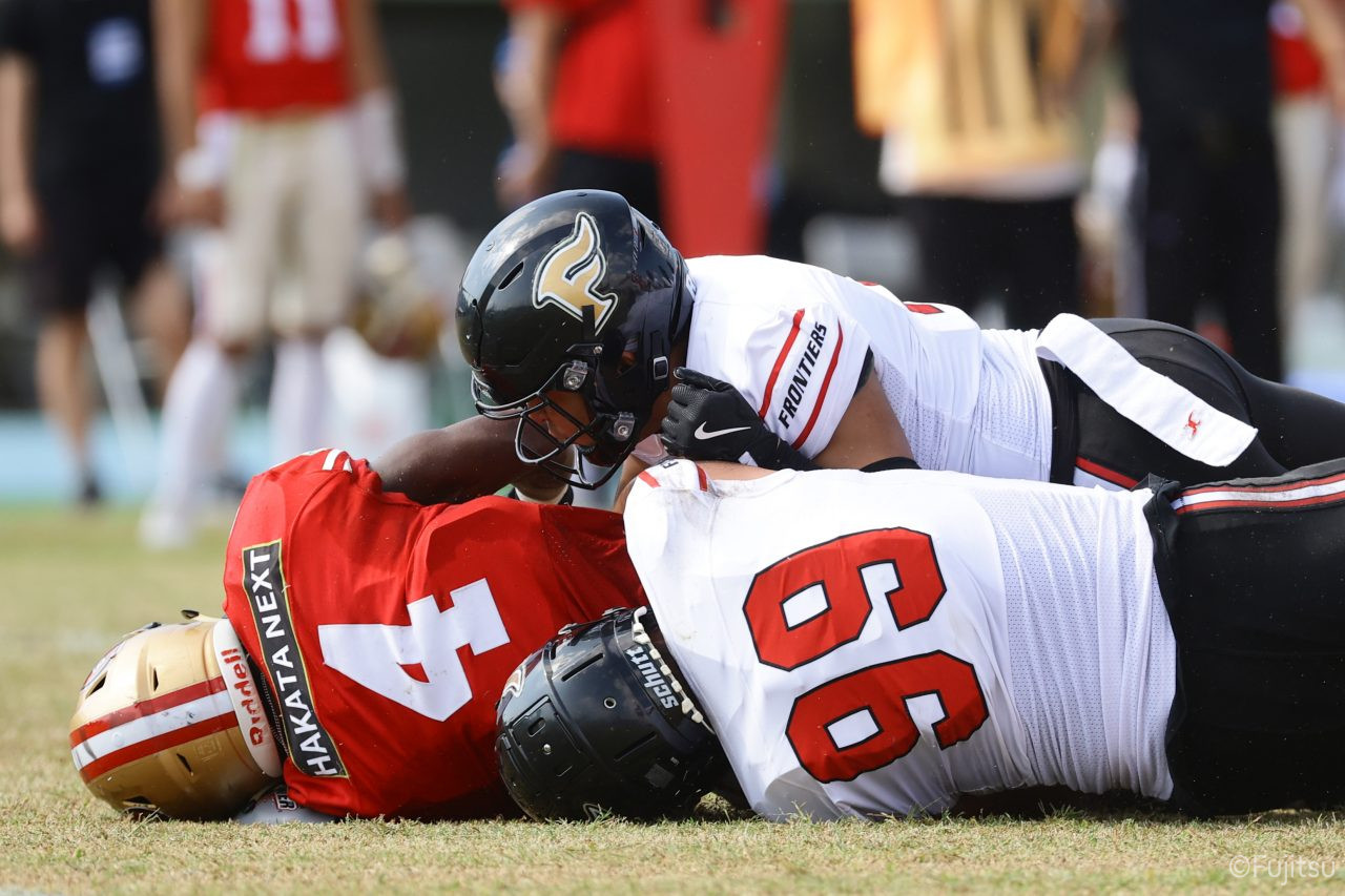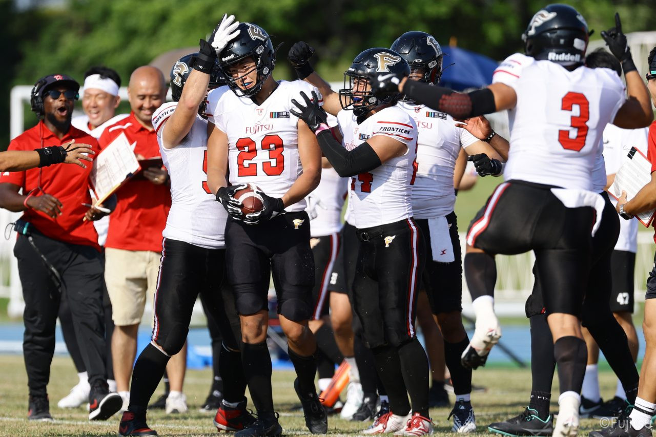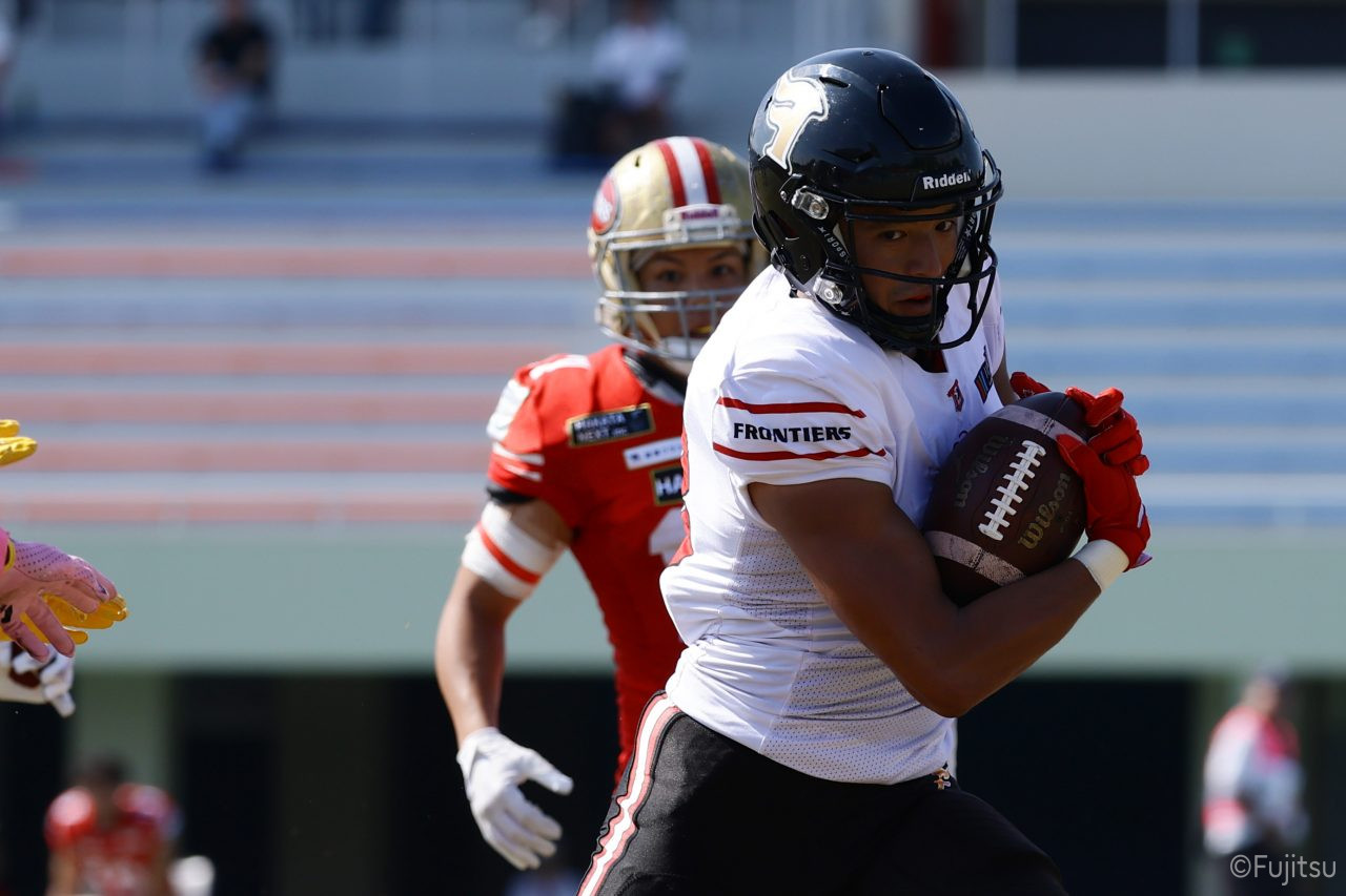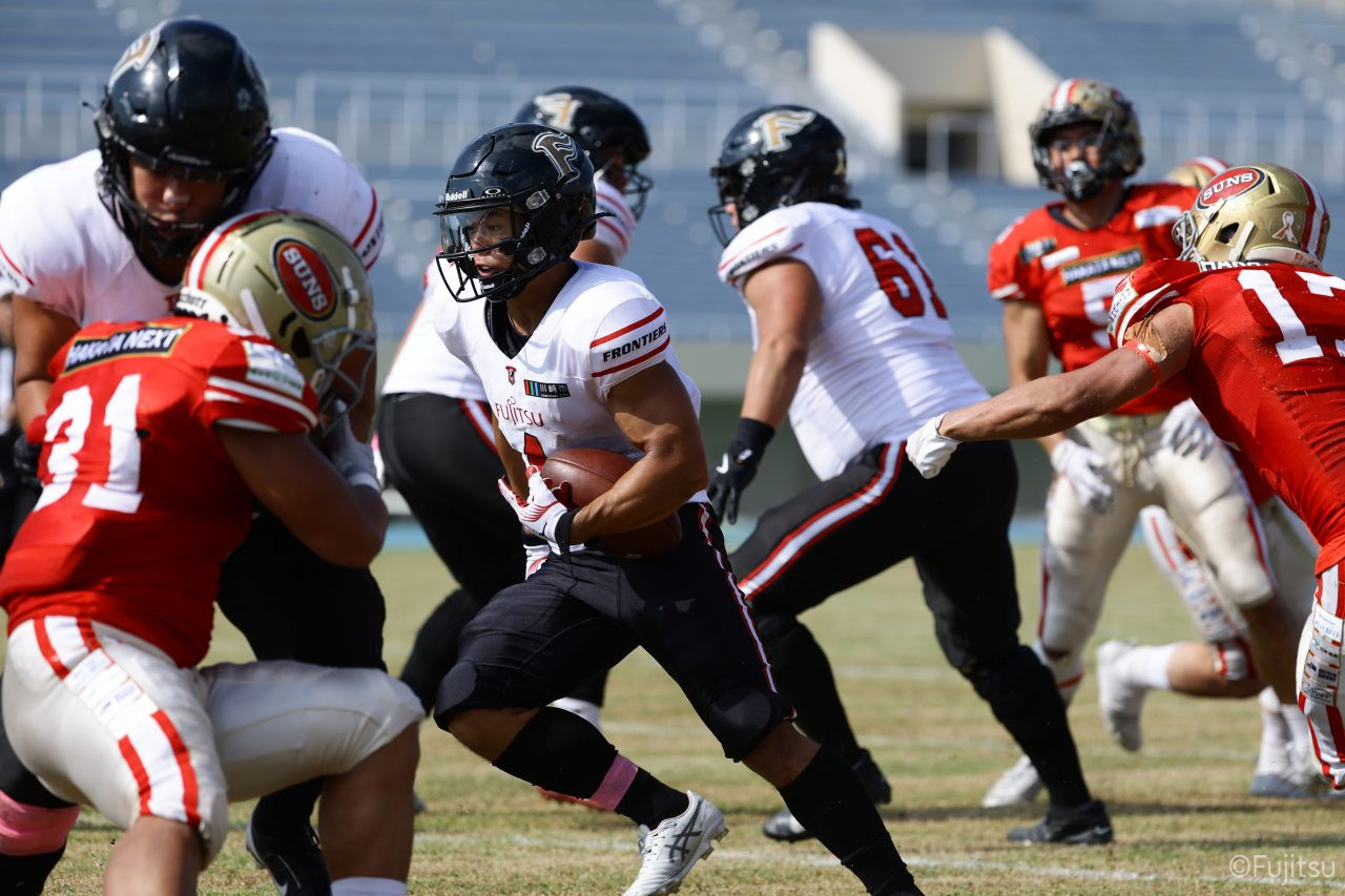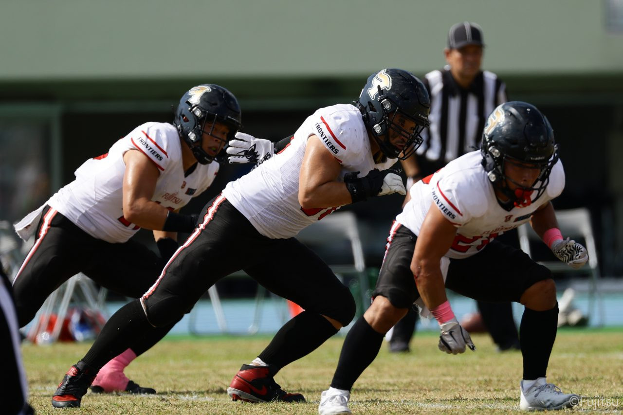 1Qから続いたSUNSのオフェンスシリーズだが、この日のディフェンス陣は好調。DB(ディフェンスバック)#29林のパスカットや、怪我から復調のDL(ディフェンスライン)#97水谷の活躍で4thダウンまで追い込むと、SUNSオフェンスはパントではなくプレーを選択しギャンブルを仕掛けてくる。しかし、放たれたパスをDB#29林が再びパスカットをしてみせ、ここを抑える。その後のオフェンスシリーズは反則で罰退するなど一時不調もあったがWR#16今中の16yパスキャッチなどを繋ぎ、最後はRB#4山嵜が30yを駆け上がりタッチダウン。28-0とさらに突き放す。その後のオフェンスシリーズもWR#10サマジーへのタッチダウンパスが通り35-0。試合開始から5シリーズを率いたQB#18高木は、全シリーズでタッチダウンを演出しこの日はここで退く。SUNSオフェンスも4thダウンギャンブルやパント体型からの意表を突くランプレーなどを展開し、これ以上突き放されまいとするものの、フロンティアーズディフェンス陣の高い壁が跳ね返す。その後、敵陣18yの好機から自身最初のシリーズを任されたQB#19鎌田は、WR#83柴田へタッチダウンパスを通し、わずか1プレーでタッチダウンを演出し42-0とさらに突き放す。K(キッカー)#5納所は前半全てのポイントアフターのキックを決め退いた。