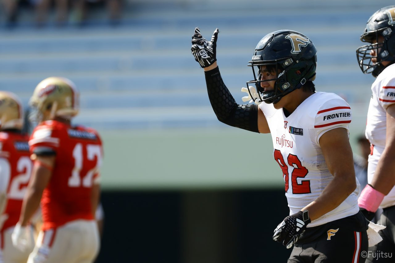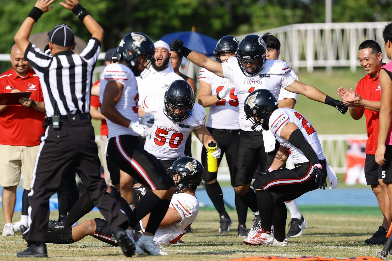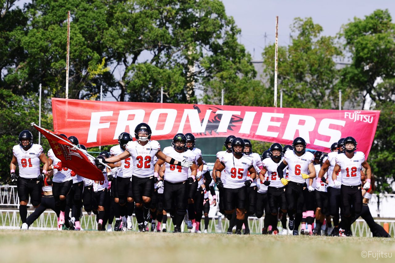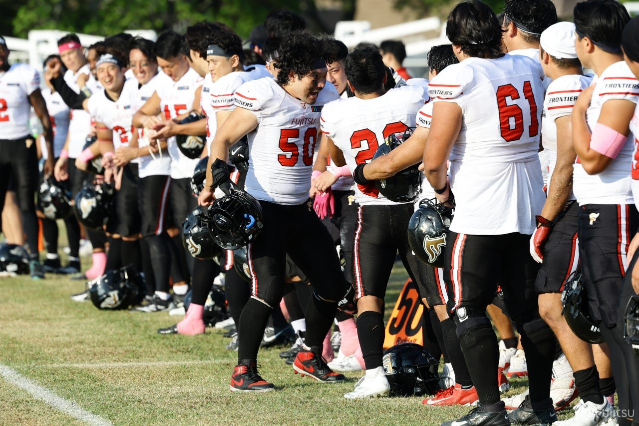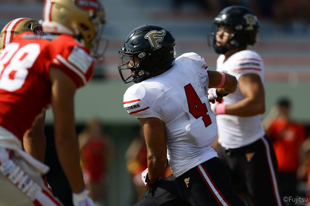1Qから続いたSUNSのオフェンスシリーズだが、この日のディフェンス陣は好調。DB(ディフェンスバック)#29林のパスカットや、怪我から復調のDL(ディフェンスライン)#97水谷の活躍で4thダウンまで追い込むと、SUNSオフェンスはパントではなくプレーを選択しギャンブルを仕掛けてくる。しかし、放たれたパスをDB#29林が再びパスカットをしてみせ、ここを抑える。その後のオフェンスシリーズは反則で罰退するなど一時不調もあったがWR#16今中の16yパスキャッチなどを繋ぎ、最後はRB#4山嵜が30yを駆け上がりタッチダウン。28-0とさらに突き放す。その後のオフェンスシリーズもWR#10サマジーへのタッチダウンパスが通り35-0。試合開始から5シリーズを率いたQB#18高木は、全シリーズでタッチダウンを演出しこの日はここで退く。SUNSオフェンスも4thダウンギャンブルやパント体型からの意表を突くランプレーなどを展開し、これ以上突き放されまいとするものの、フロンティアーズディフェンス陣の高い壁が跳ね返す。その後、敵陣18yの好機から自身最初のシリーズを任されたQB#19鎌田は、WR#83柴田へタッチダウンパスを通し、わずか1プレーでタッチダウンを演出し42-0とさらに突き放す。K(キッカー)#5納所は前半全てのポイントアフターのキックを決め退いた。
