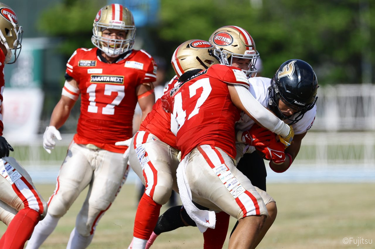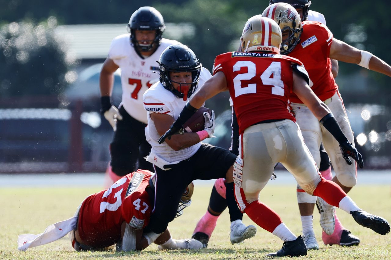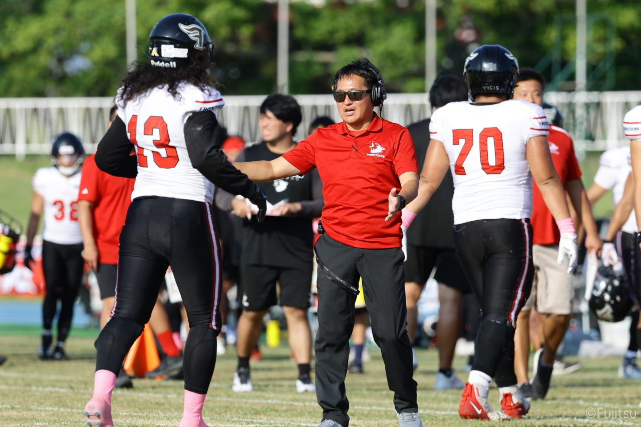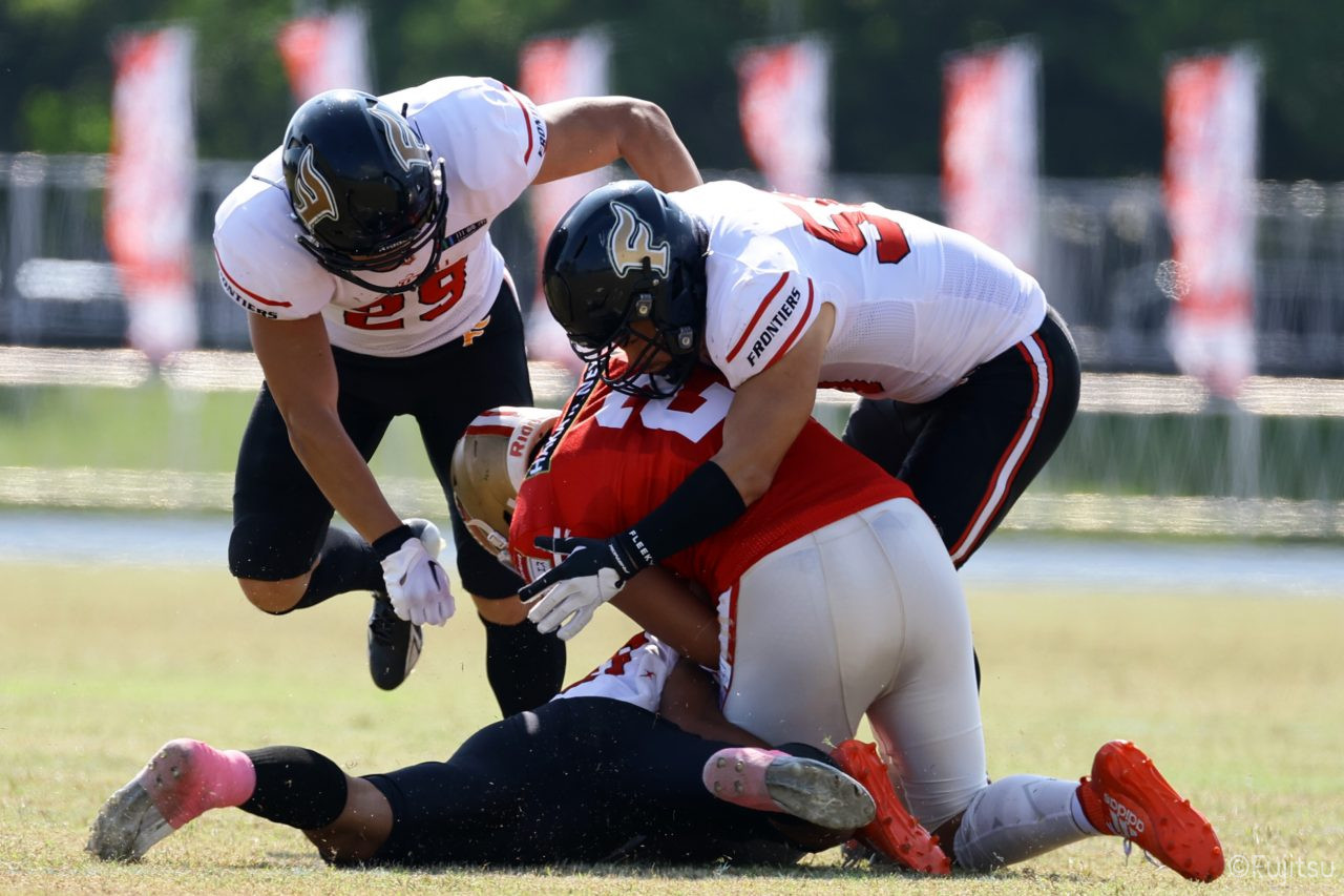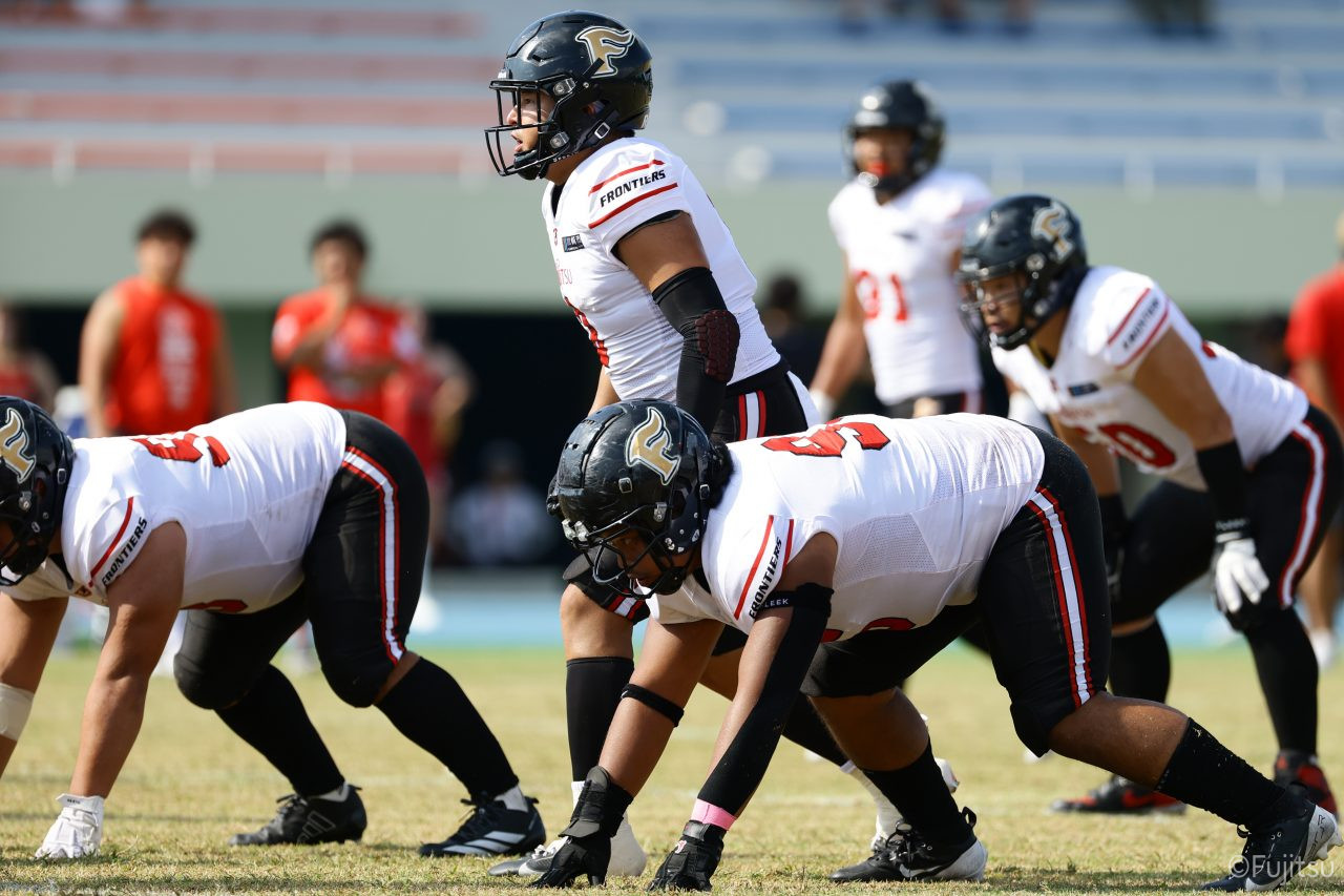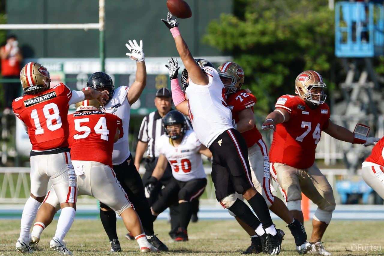 1Qから続いたSUNSのオフェンスシリーズだが、この日のディフェンス陣は好調。DB(ディフェンスバック)#29林のパスカットや、怪我から復調のDL(ディフェンスライン)#97水谷の活躍で4thダウンまで追い込むと、SUNSオフェンスはパントではなくプレーを選択しギャンブルを仕掛けてくる。しかし、放たれたパスをDB#29林が再びパスカットをしてみせ、ここを抑える。その後のオフェンスシリーズは反則で罰退するなど一時不調もあったがWR#16今中の16yパスキャッチなどを繋ぎ、最後はRB#4山嵜が30yを駆け上がりタッチダウン。28-0とさらに突き放す。その後のオフェンスシリーズもWR#10サマジーへのタッチダウンパスが通り35-0。試合開始から5シリーズを率いたQB#18高木は、全シリーズでタッチダウンを演出しこの日はここで退く。SUNSオフェンスも4thダウンギャンブルやパント体型からの意表を突くランプレーなどを展開し、これ以上突き放されまいとするものの、フロンティアーズディフェンス陣の高い壁が跳ね返す。その後、敵陣18yの好機から自身最初のシリーズを任されたQB#19鎌田は、WR#83柴田へタッチダウンパスを通し、わずか1プレーでタッチダウンを演出し42-0とさらに突き放す。K(キッカー)#5納所は前半全てのポイントアフターのキックを決め退いた。