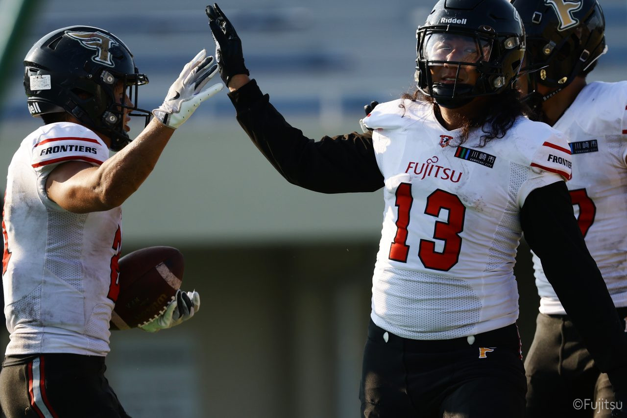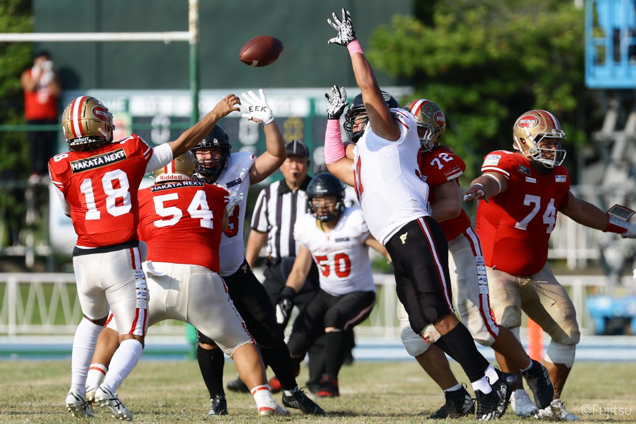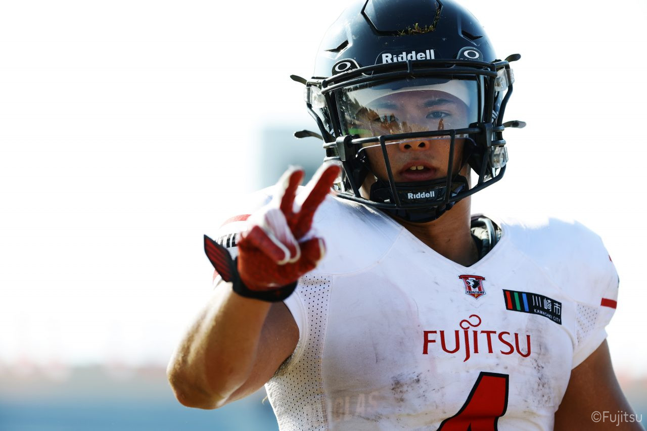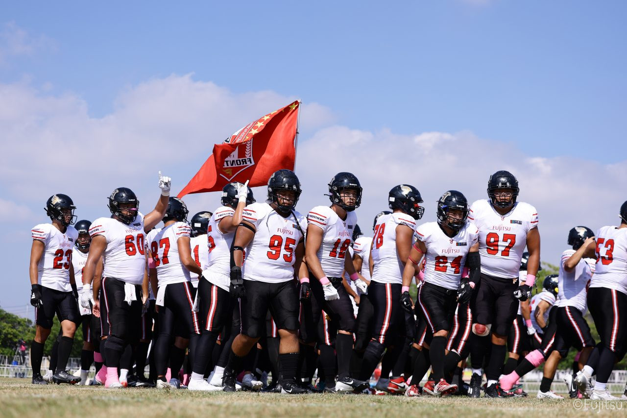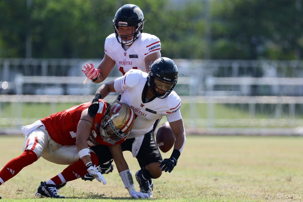 1Qから続いたSUNSのオフェンスシリーズだが、この日のディフェンス陣は好調。DB(ディフェンスバック)#29林のパスカットや、怪我から復調のDL(ディフェンスライン)#97水谷の活躍で4thダウンまで追い込むと、SUNSオフェンスはパントではなくプレーを選択しギャンブルを仕掛けてくる。しかし、放たれたパスをDB#29林が再びパスカットをしてみせ、ここを抑える。その後のオフェンスシリーズは反則で罰退するなど一時不調もあったがWR#16今中の16yパスキャッチなどを繋ぎ、最後はRB#4山嵜が30yを駆け上がりタッチダウン。28-0とさらに突き放す。その後のオフェンスシリーズもWR#10サマジーへのタッチダウンパスが通り35-0。試合開始から5シリーズを率いたQB#18高木は、全シリーズでタッチダウンを演出しこの日はここで退く。SUNSオフェンスも4thダウンギャンブルやパント体型からの意表を突くランプレーなどを展開し、これ以上突き放されまいとするものの、フロンティアーズディフェンス陣の高い壁が跳ね返す。その後、敵陣18yの好機から自身最初のシリーズを任されたQB#19鎌田は、WR#83柴田へタッチダウンパスを通し、わずか1プレーでタッチダウンを演出し42-0とさらに突き放す。K(キッカー)#5納所は前半全てのポイントアフターのキックを決め退いた。