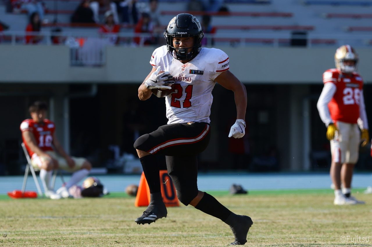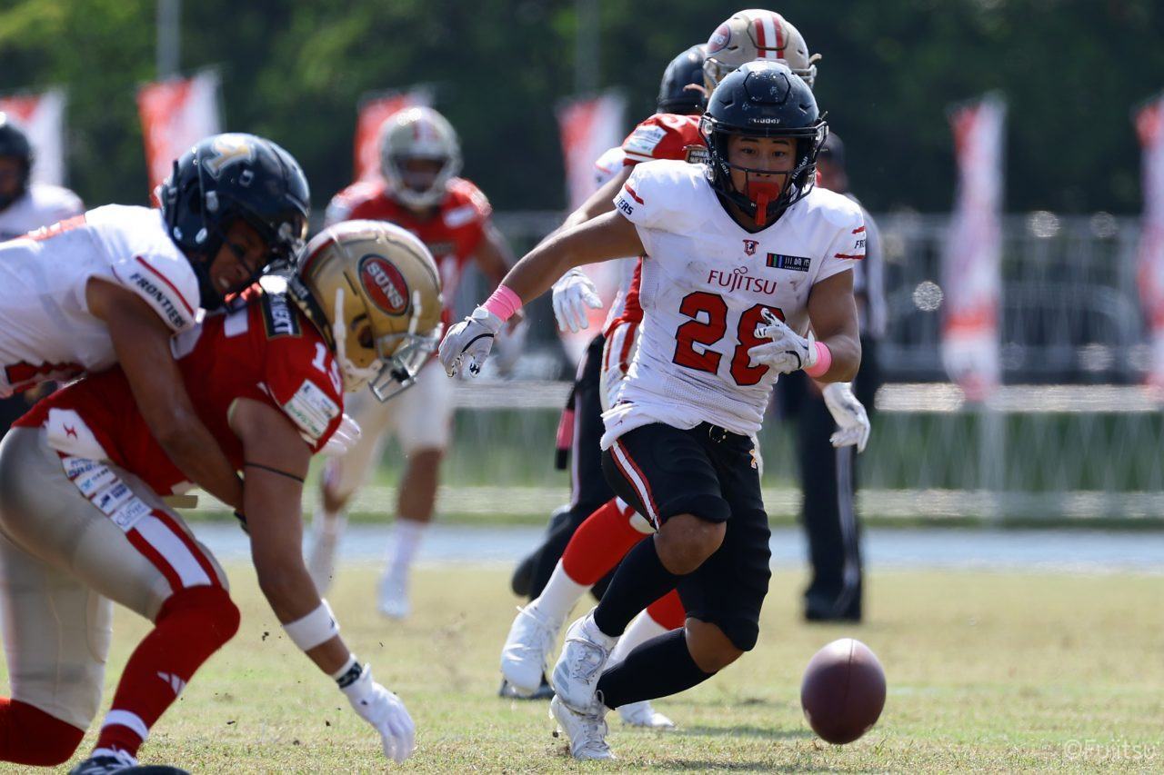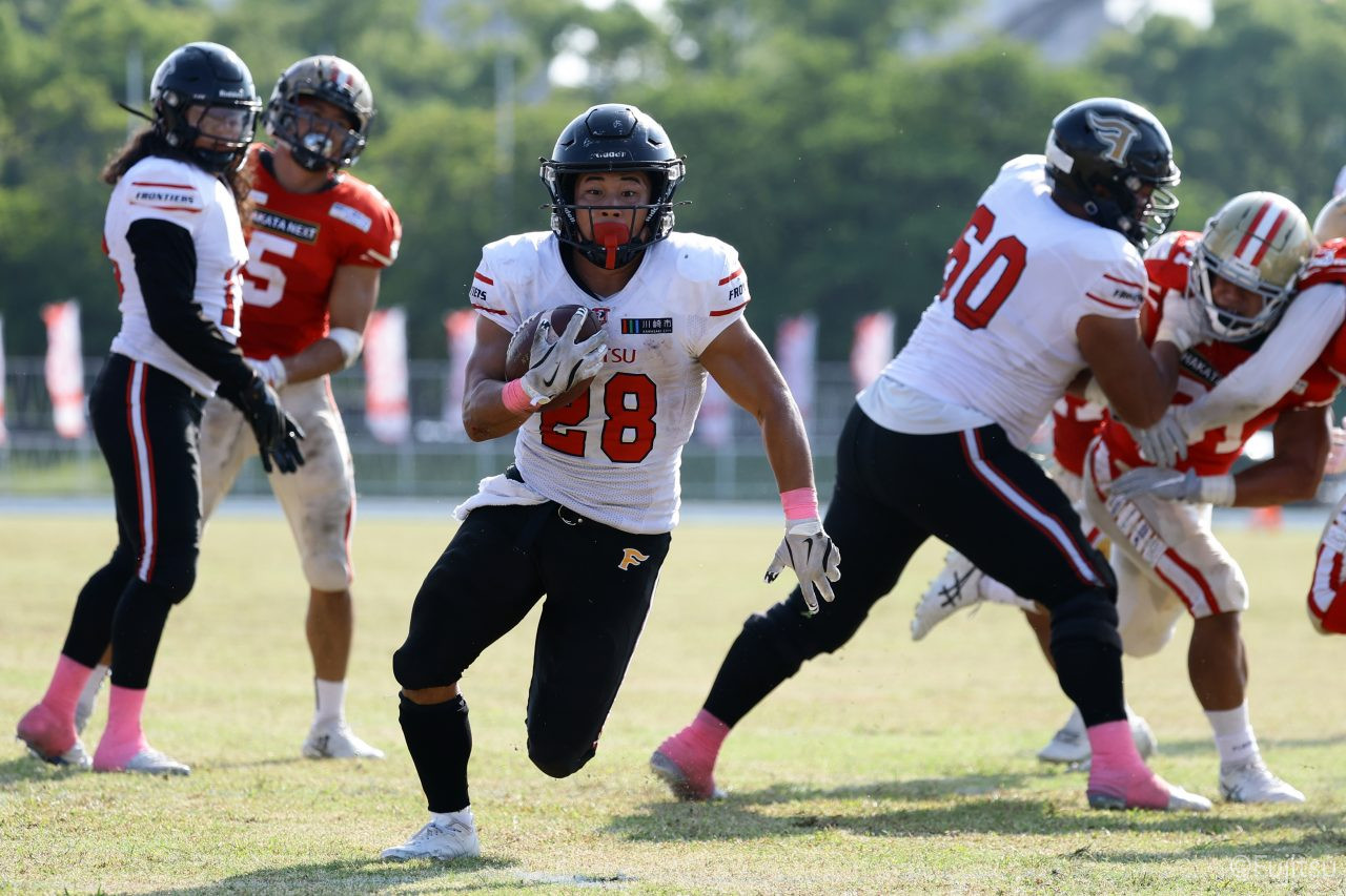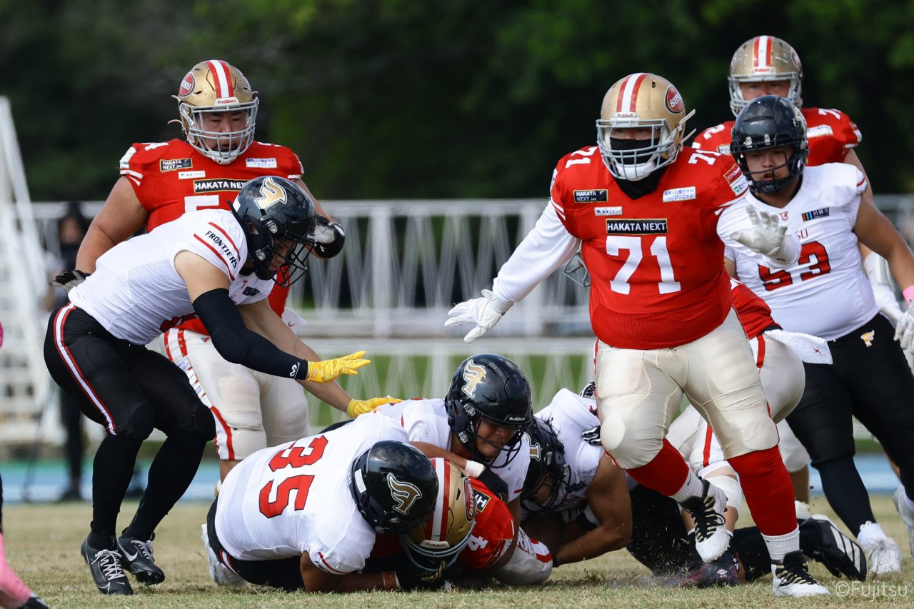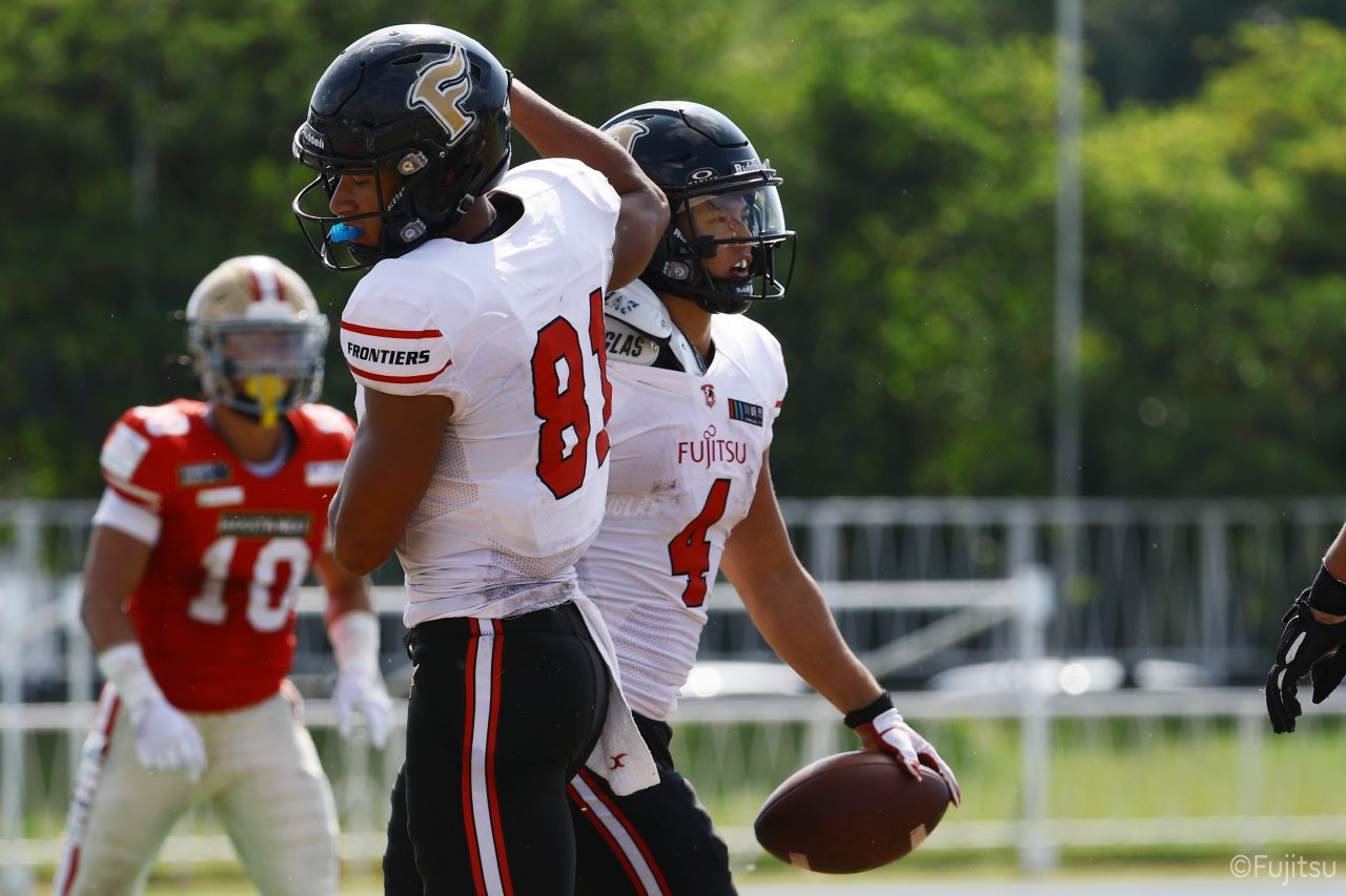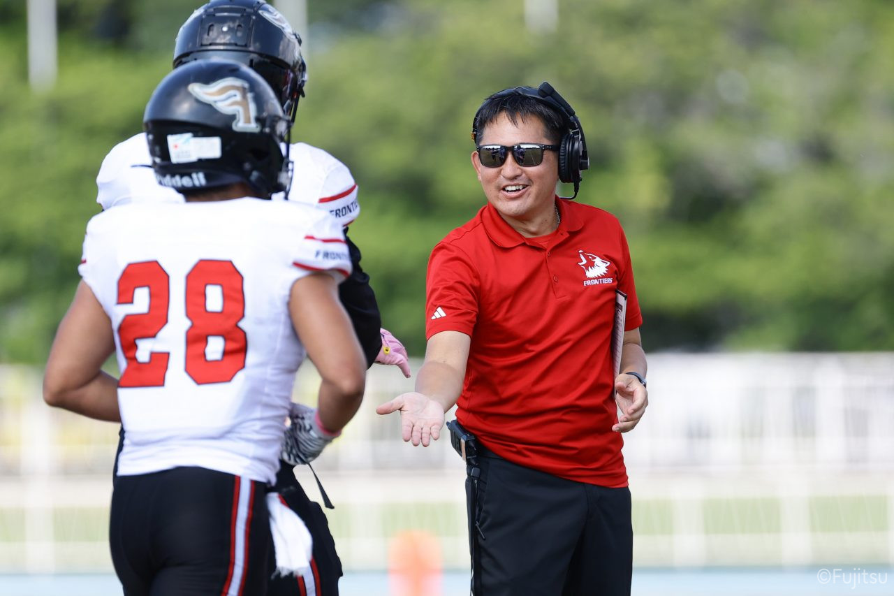 1Qから続いたSUNSのオフェンスシリーズだが、この日のディフェンス陣は好調。DB(ディフェンスバック)#29林のパスカットや、怪我から復調のDL(ディフェンスライン)#97水谷の活躍で4thダウンまで追い込むと、SUNSオフェンスはパントではなくプレーを選択しギャンブルを仕掛けてくる。しかし、放たれたパスをDB#29林が再びパスカットをしてみせ、ここを抑える。その後のオフェンスシリーズは反則で罰退するなど一時不調もあったがWR#16今中の16yパスキャッチなどを繋ぎ、最後はRB#4山嵜が30yを駆け上がりタッチダウン。28-0とさらに突き放す。その後のオフェンスシリーズもWR#10サマジーへのタッチダウンパスが通り35-0。試合開始から5シリーズを率いたQB#18高木は、全シリーズでタッチダウンを演出しこの日はここで退く。SUNSオフェンスも4thダウンギャンブルやパント体型からの意表を突くランプレーなどを展開し、これ以上突き放されまいとするものの、フロンティアーズディフェンス陣の高い壁が跳ね返す。その後、敵陣18yの好機から自身最初のシリーズを任されたQB#19鎌田は、WR#83柴田へタッチダウンパスを通し、わずか1プレーでタッチダウンを演出し42-0とさらに突き放す。K(キッカー)#5納所は前半全てのポイントアフターのキックを決め退いた。