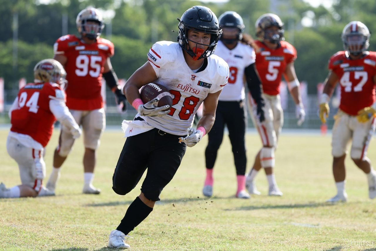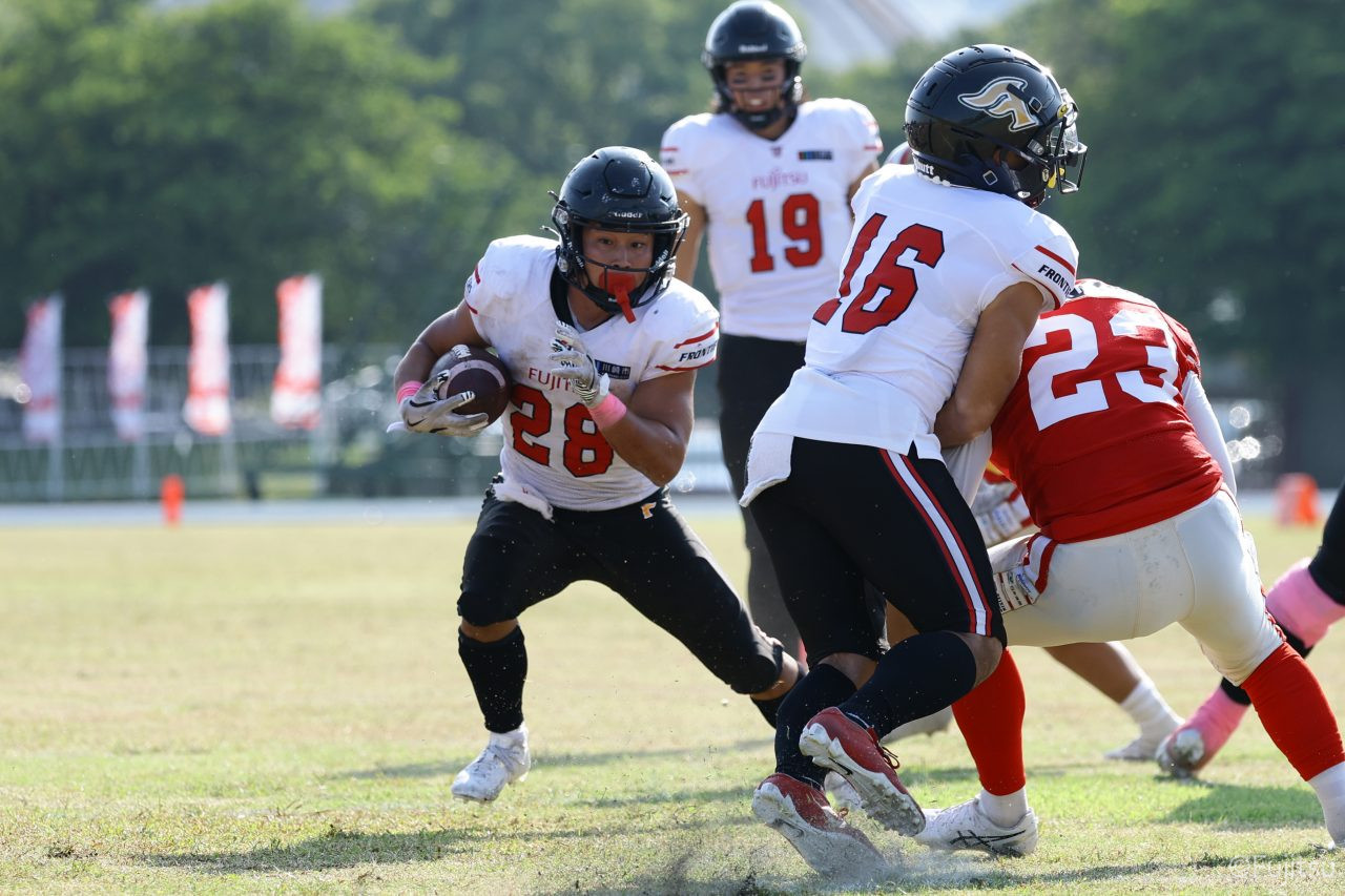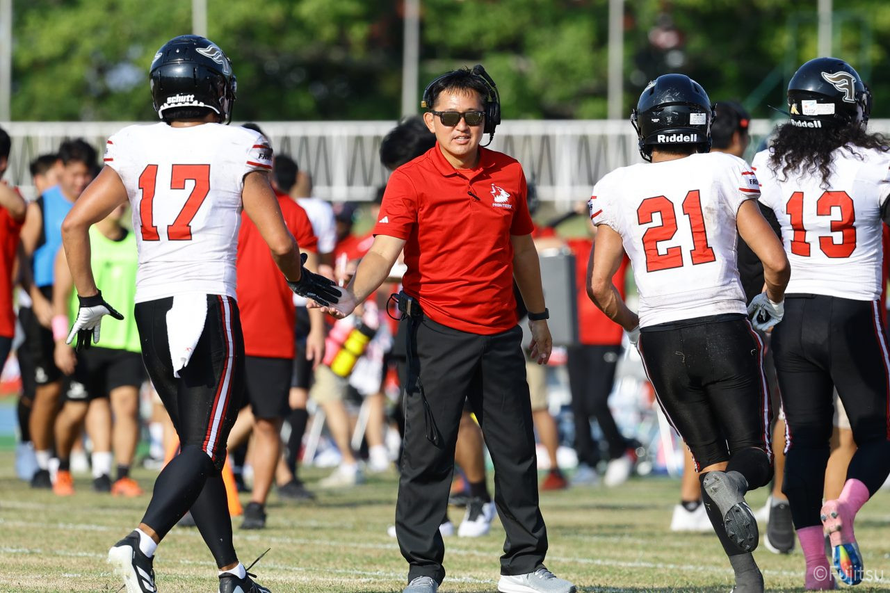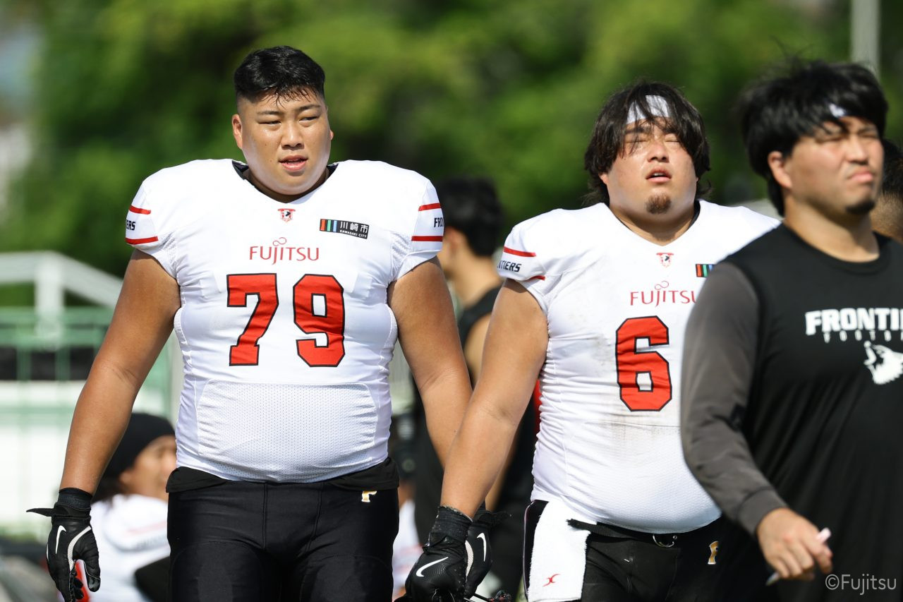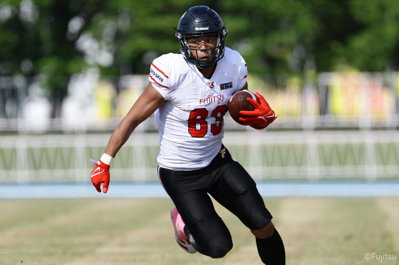 1Qから続いたSUNSのオフェンスシリーズだが、この日のディフェンス陣は好調。DB(ディフェンスバック)#29林のパスカットや、怪我から復調のDL(ディフェンスライン)#97水谷の活躍で4thダウンまで追い込むと、SUNSオフェンスはパントではなくプレーを選択しギャンブルを仕掛けてくる。しかし、放たれたパスをDB#29林が再びパスカットをしてみせ、ここを抑える。その後のオフェンスシリーズは反則で罰退するなど一時不調もあったがWR#16今中の16yパスキャッチなどを繋ぎ、最後はRB#4山嵜が30yを駆け上がりタッチダウン。28-0とさらに突き放す。その後のオフェンスシリーズもWR#10サマジーへのタッチダウンパスが通り35-0。試合開始から5シリーズを率いたQB#18高木は、全シリーズでタッチダウンを演出しこの日はここで退く。SUNSオフェンスも4thダウンギャンブルやパント体型からの意表を突くランプレーなどを展開し、これ以上突き放されまいとするものの、フロンティアーズディフェンス陣の高い壁が跳ね返す。その後、敵陣18yの好機から自身最初のシリーズを任されたQB#19鎌田は、WR#83柴田へタッチダウンパスを通し、わずか1プレーでタッチダウンを演出し42-0とさらに突き放す。K(キッカー)#5納所は前半全てのポイントアフターのキックを決め退いた。