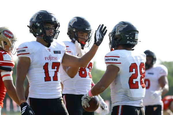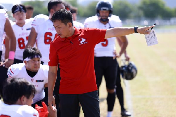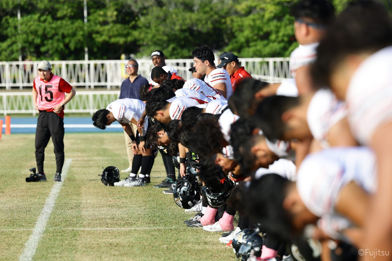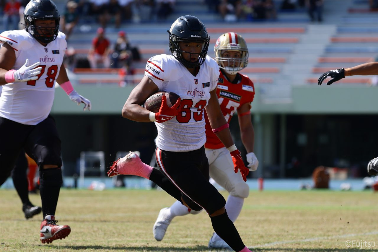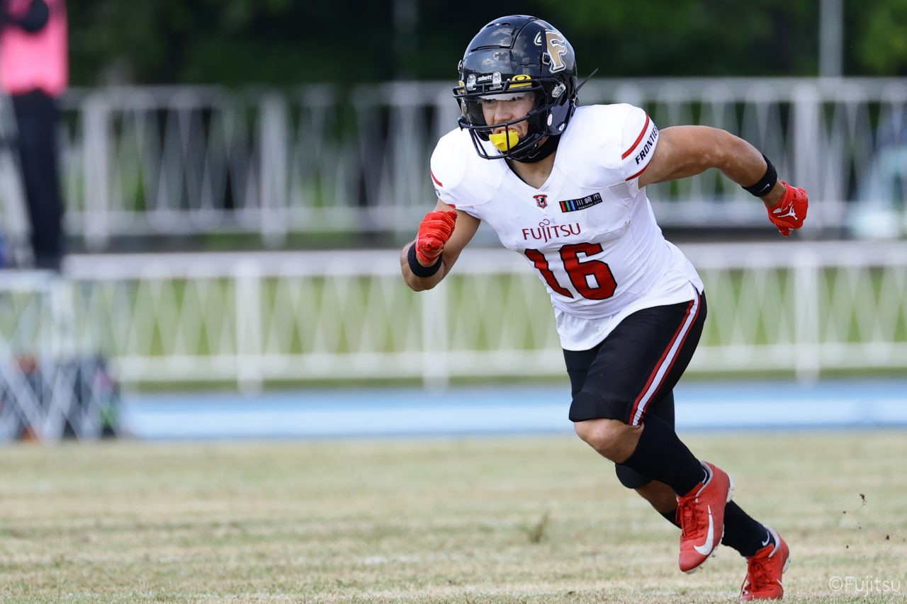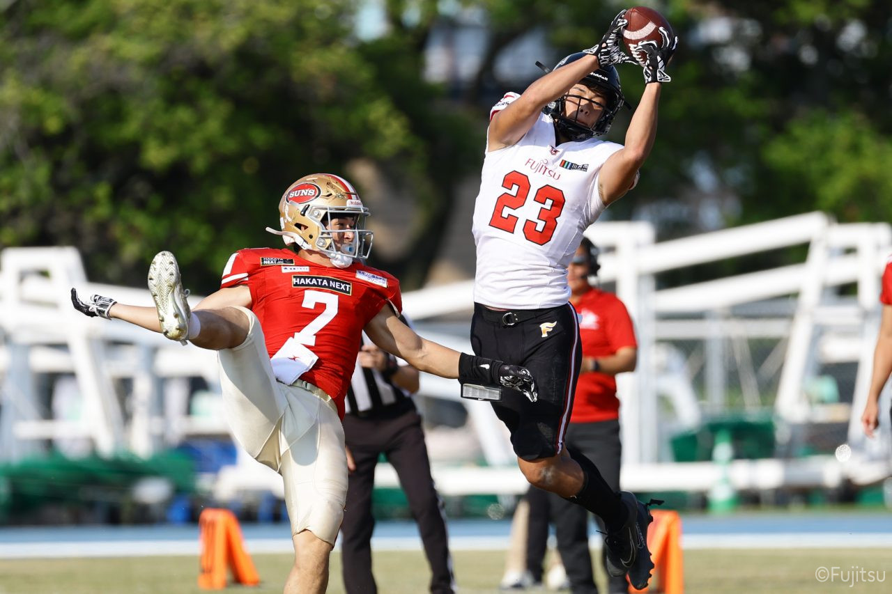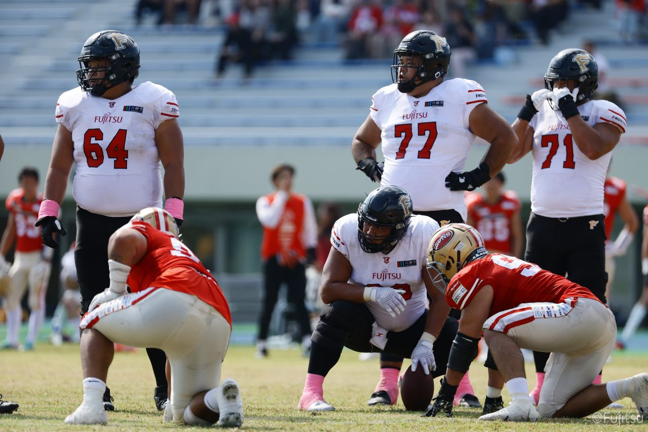 1Qから続いたSUNSのオフェンスシリーズだが、この日のディフェンス陣は好調。DB(ディフェンスバック)#29林のパスカットや、怪我から復調のDL(ディフェンスライン)#97水谷の活躍で4thダウンまで追い込むと、SUNSオフェンスはパントではなくプレーを選択しギャンブルを仕掛けてくる。しかし、放たれたパスをDB#29林が再びパスカットをしてみせ、ここを抑える。その後のオフェンスシリーズは反則で罰退するなど一時不調もあったがWR#16今中の16yパスキャッチなどを繋ぎ、最後はRB#4山嵜が30yを駆け上がりタッチダウン。28-0とさらに突き放す。その後のオフェンスシリーズもWR#10サマジーへのタッチダウンパスが通り35-0。試合開始から5シリーズを率いたQB#18高木は、全シリーズでタッチダウンを演出しこの日はここで退く。SUNSオフェンスも4thダウンギャンブルやパント体型からの意表を突くランプレーなどを展開し、これ以上突き放されまいとするものの、フロンティアーズディフェンス陣の高い壁が跳ね返す。その後、敵陣18yの好機から自身最初のシリーズを任されたQB#19鎌田は、WR#83柴田へタッチダウンパスを通し、わずか1プレーでタッチダウンを演出し42-0とさらに突き放す。K(キッカー)#5納所は前半全てのポイントアフターのキックを決め退いた。