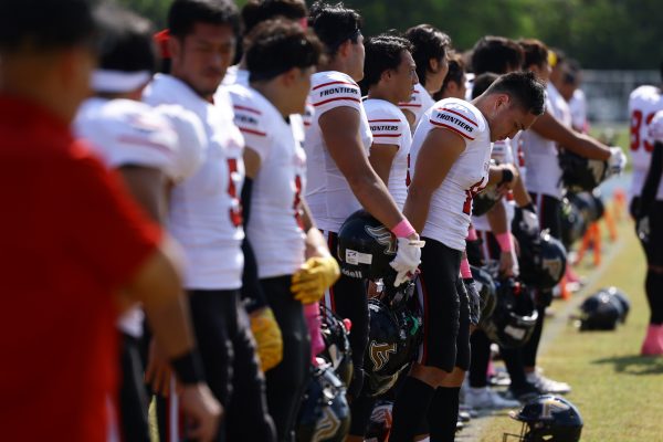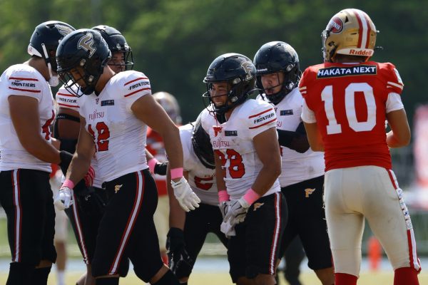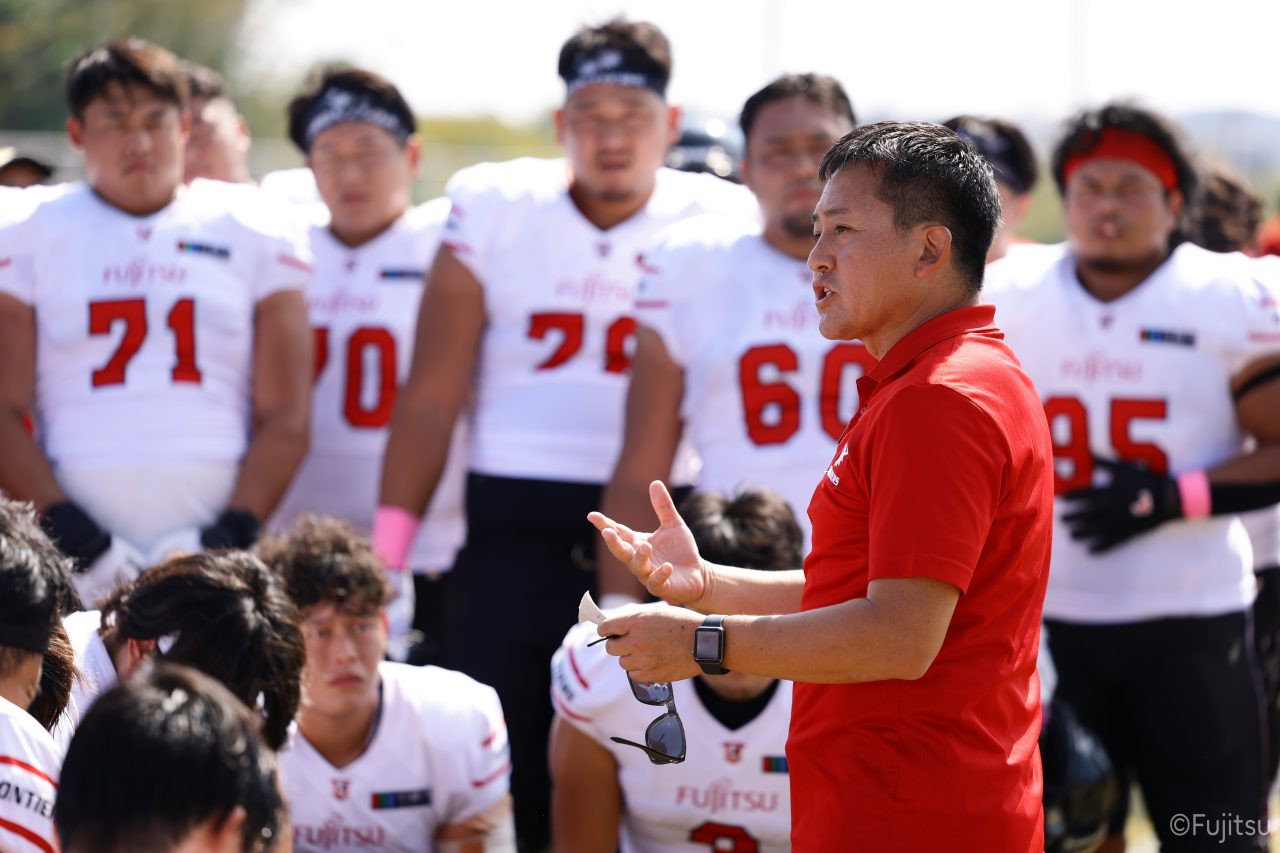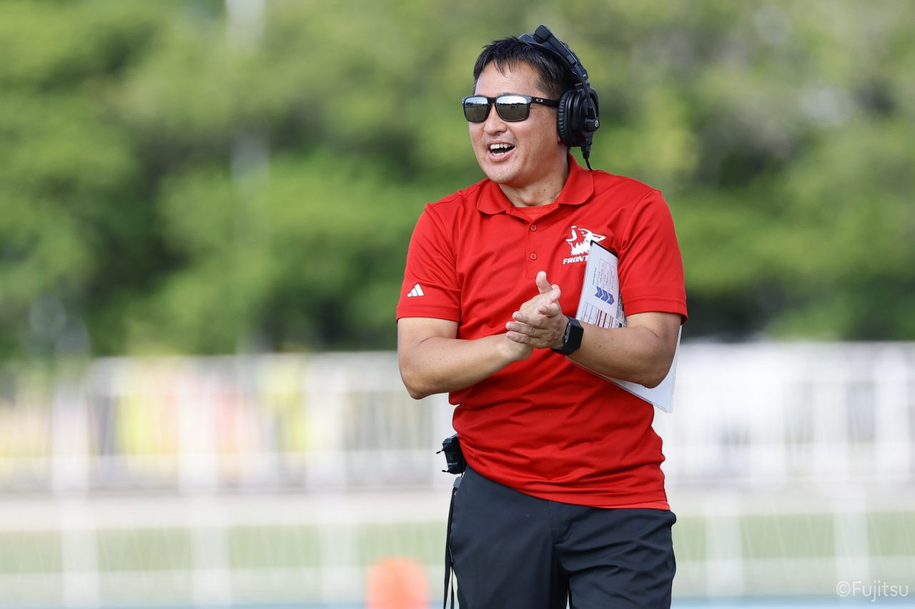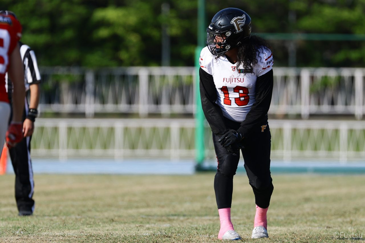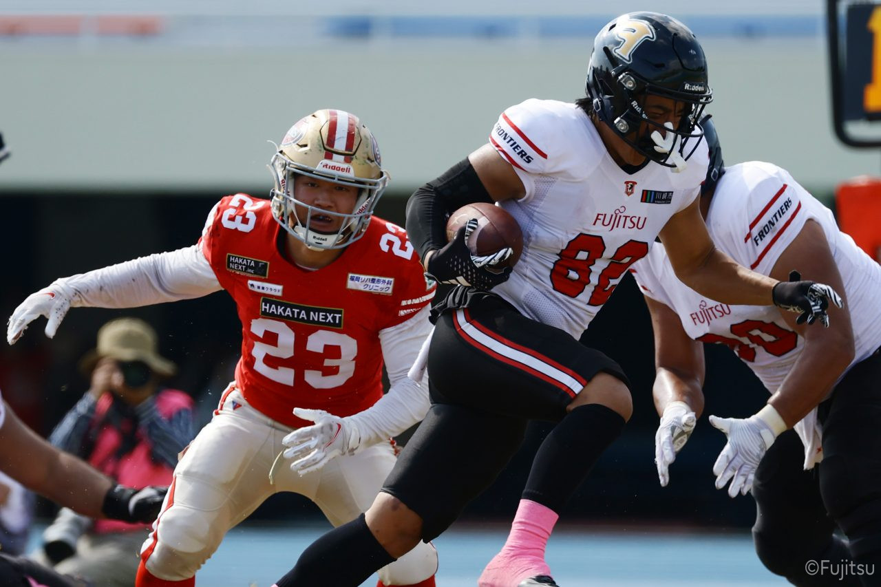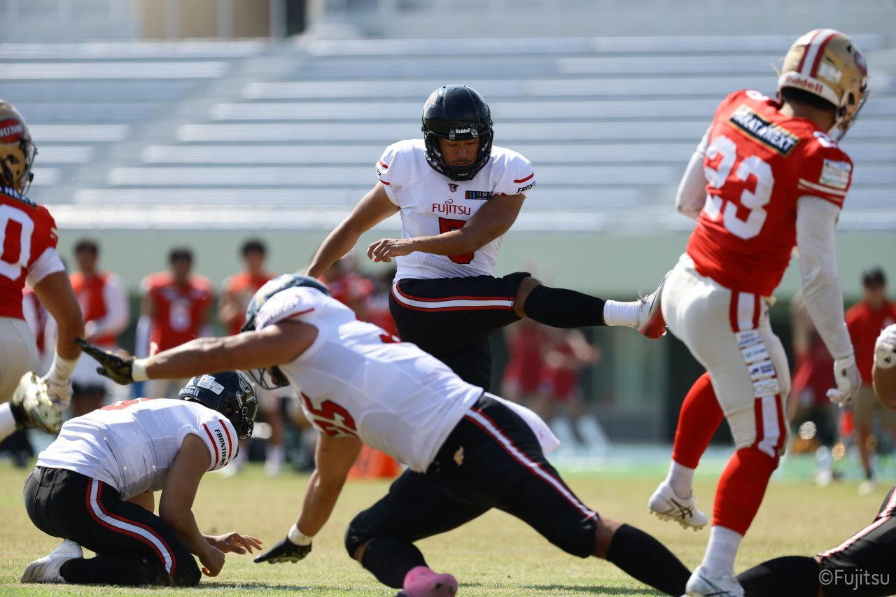 1Qから続いたSUNSのオフェンスシリーズだが、この日のディフェンス陣は好調。DB(ディフェンスバック)#29林のパスカットや、怪我から復調のDL(ディフェンスライン)#97水谷の活躍で4thダウンまで追い込むと、SUNSオフェンスはパントではなくプレーを選択しギャンブルを仕掛けてくる。しかし、放たれたパスをDB#29林が再びパスカットをしてみせ、ここを抑える。その後のオフェンスシリーズは反則で罰退するなど一時不調もあったがWR#16今中の16yパスキャッチなどを繋ぎ、最後はRB#4山嵜が30yを駆け上がりタッチダウン。28-0とさらに突き放す。その後のオフェンスシリーズもWR#10サマジーへのタッチダウンパスが通り35-0。試合開始から5シリーズを率いたQB#18高木は、全シリーズでタッチダウンを演出しこの日はここで退く。SUNSオフェンスも4thダウンギャンブルやパント体型からの意表を突くランプレーなどを展開し、これ以上突き放されまいとするものの、フロンティアーズディフェンス陣の高い壁が跳ね返す。その後、敵陣18yの好機から自身最初のシリーズを任されたQB#19鎌田は、WR#83柴田へタッチダウンパスを通し、わずか1プレーでタッチダウンを演出し42-0とさらに突き放す。K(キッカー)#5納所は前半全てのポイントアフターのキックを決め退いた。