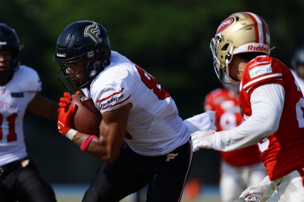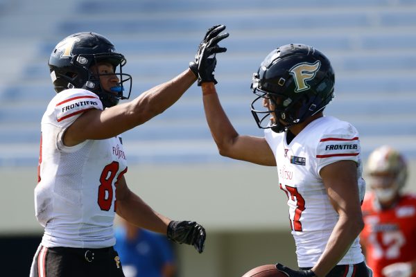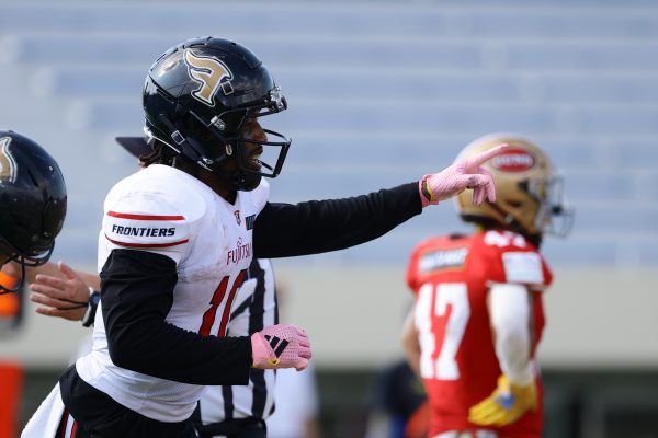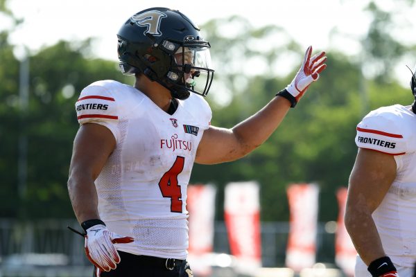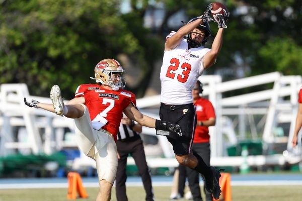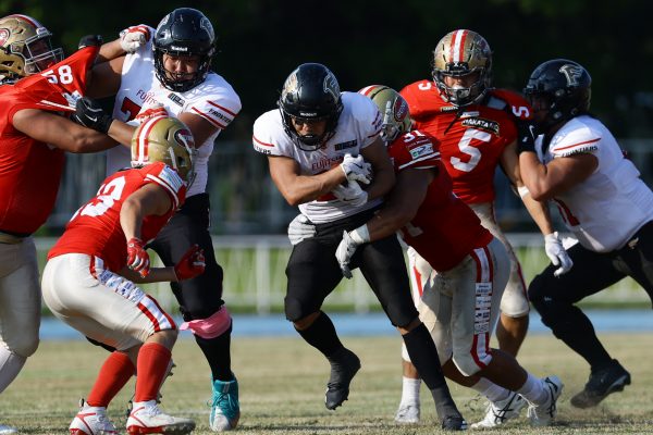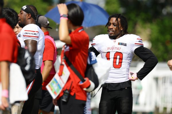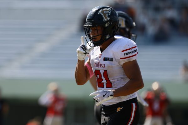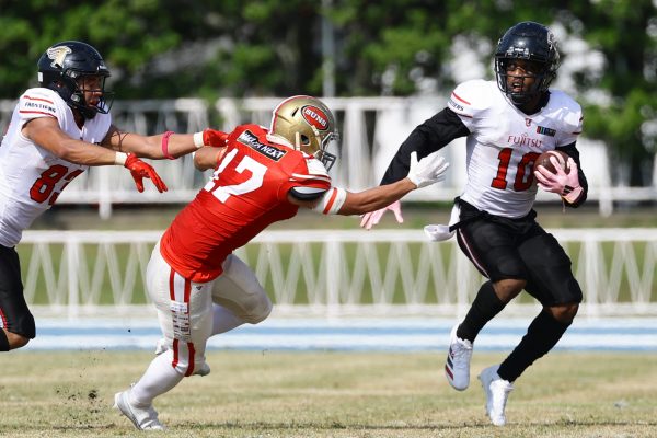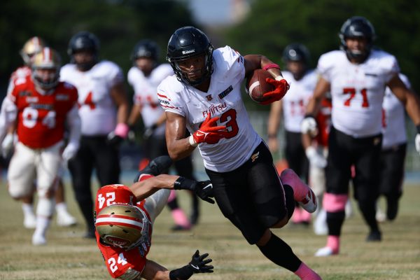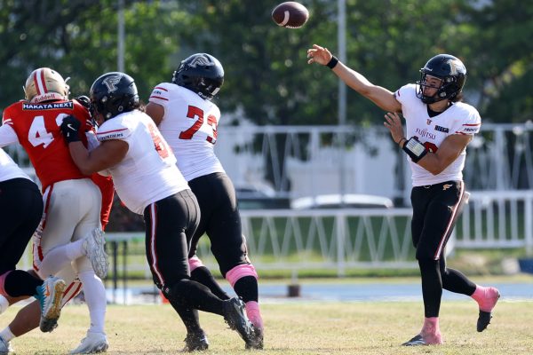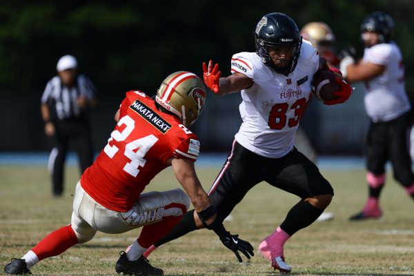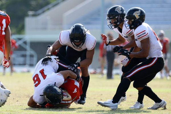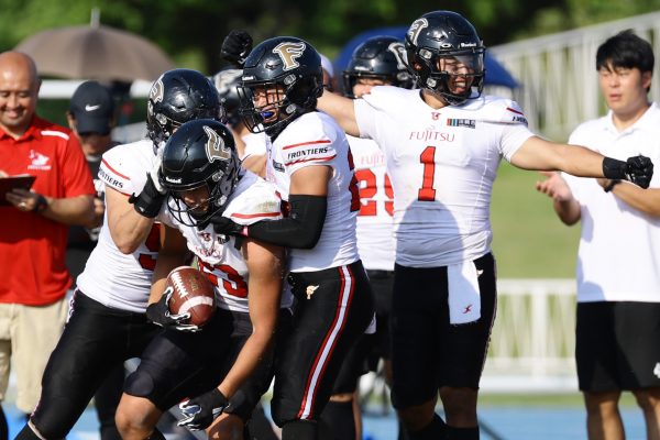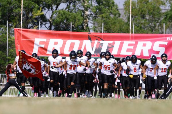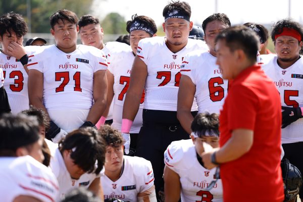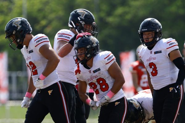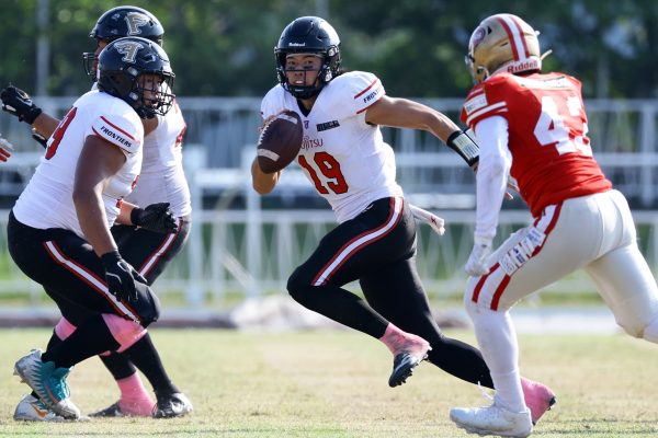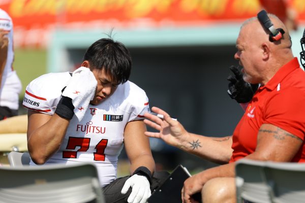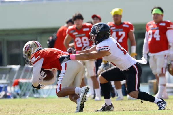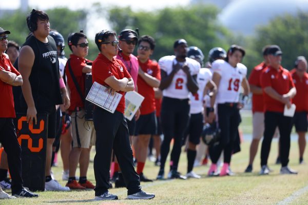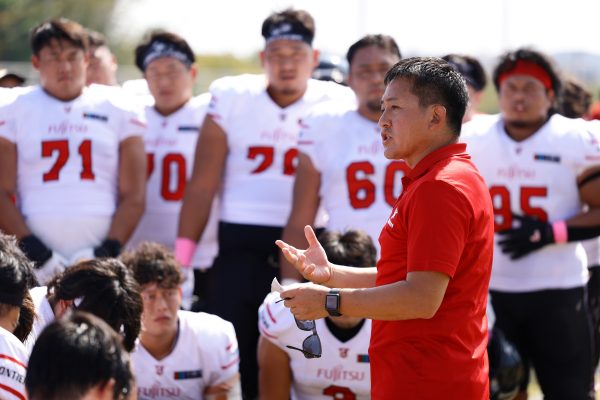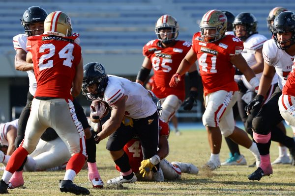 1Qから続いたSUNSのオフェンスシリーズだが、この日のディフェンス陣は好調。DB(ディフェンスバック)#29林のパスカットや、怪我から復調のDL(ディフェンスライン)#97水谷の活躍で4thダウンまで追い込むと、SUNSオフェンスはパントではなくプレーを選択しギャンブルを仕掛けてくる。しかし、放たれたパスをDB#29林が再びパスカットをしてみせ、ここを抑える。その後のオフェンスシリーズは反則で罰退するなど一時不調もあったがWR#16今中の16yパスキャッチなどを繋ぎ、最後はRB#4山嵜が30yを駆け上がりタッチダウン。28-0とさらに突き放す。その後のオフェンスシリーズもWR#10サマジーへのタッチダウンパスが通り35-0。試合開始から5シリーズを率いたQB#18高木は、全シリーズでタッチダウンを演出しこの日はここで退く。SUNSオフェンスも4thダウンギャンブルやパント体型からの意表を突くランプレーなどを展開し、これ以上突き放されまいとするものの、フロンティアーズディフェンス陣の高い壁が跳ね返す。その後、敵陣18yの好機から自身最初のシリーズを任されたQB#19鎌田は、WR#83柴田へタッチダウンパスを通し、わずか1プレーでタッチダウンを演出し42-0とさらに突き放す。K(キッカー)#5納所は前半全てのポイントアフターのキックを決め退いた。