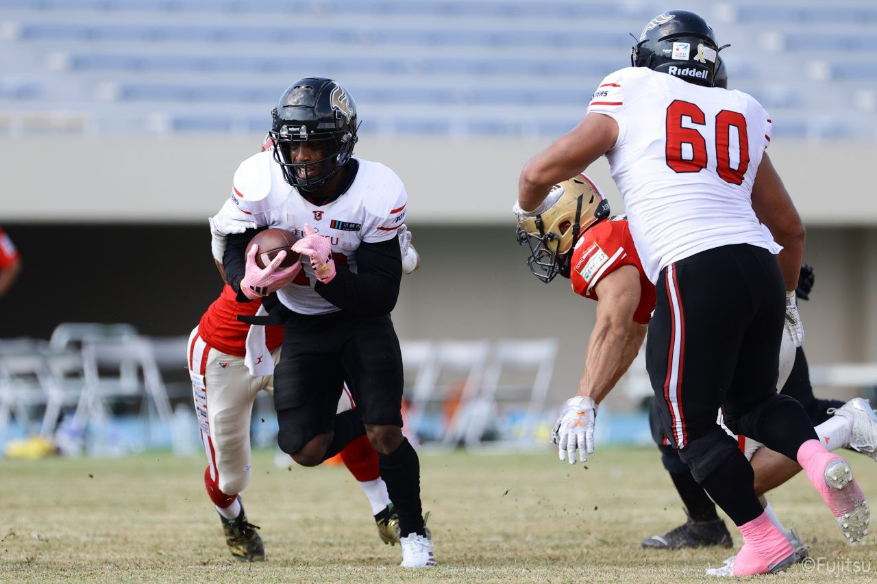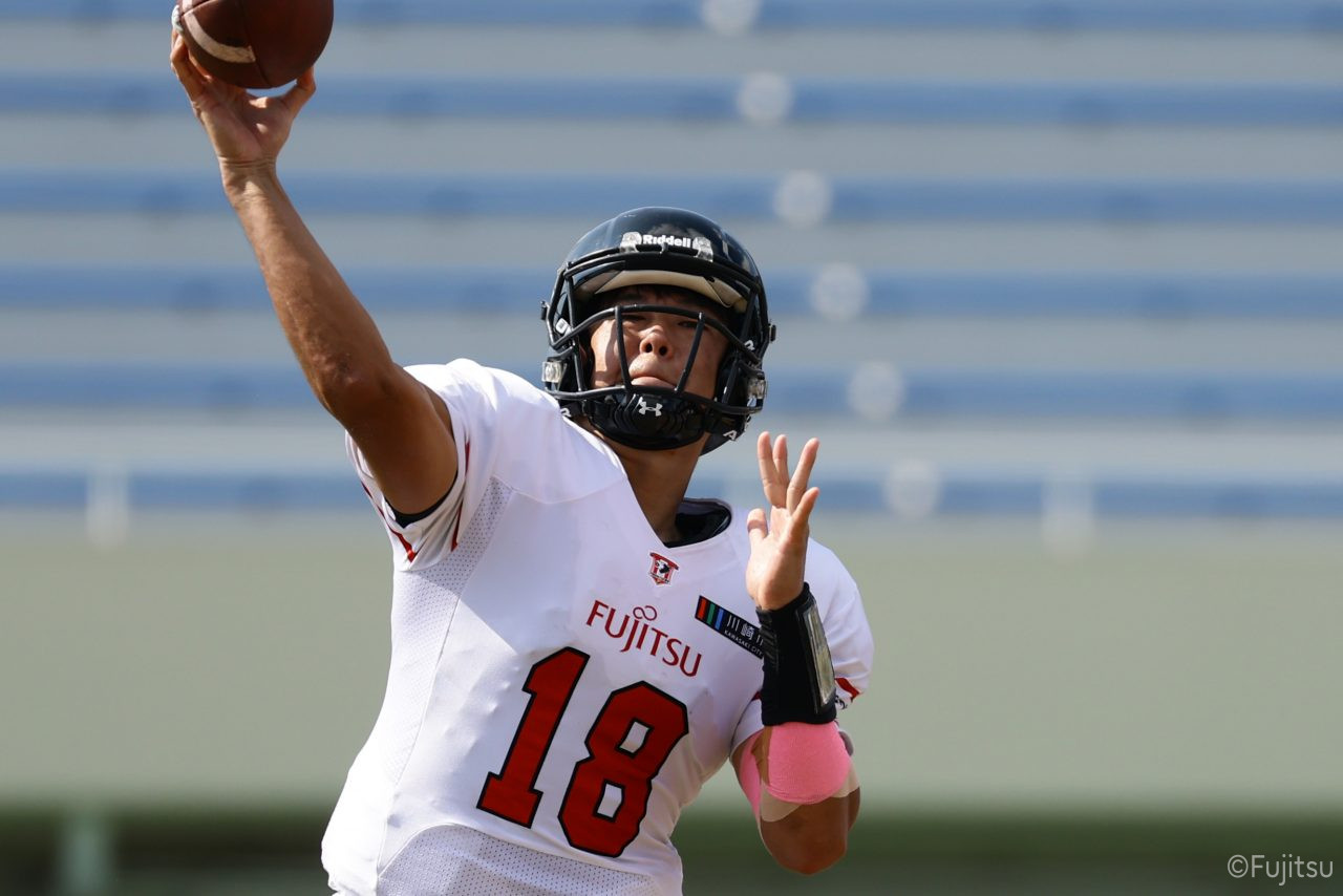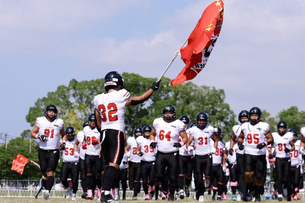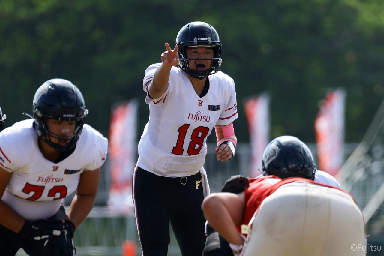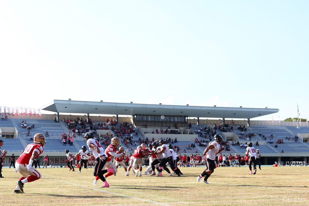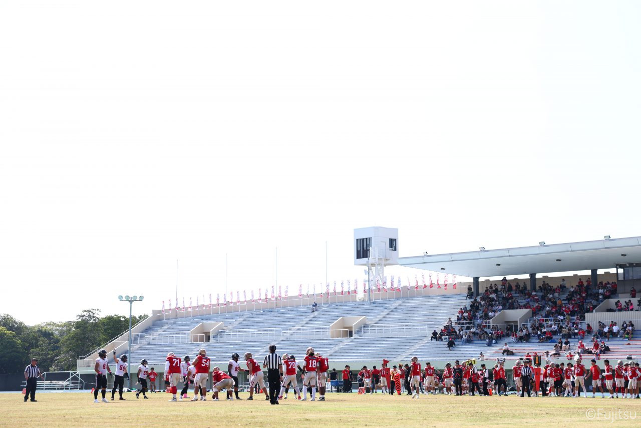 試合開始直後から爆発的な攻撃力を見せつけた。RB(ランニングバック)#21三宅の13yランとWR(ワイドレシーバー)#83柴田の53yのランアフターキャッチでいきなりゴール前7yまで進むと、最後はRB#21三宅が押し込みタッチダウン。7-0と先制点を奪う。その後もQB(クォーターバック)#18高木からWR#17糸川幹への21y、WR#10サマジーへのそれぞれタッチダウンパスを通し、全く手を緩めることはなく、21-0で1Qを終える。