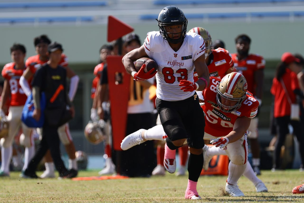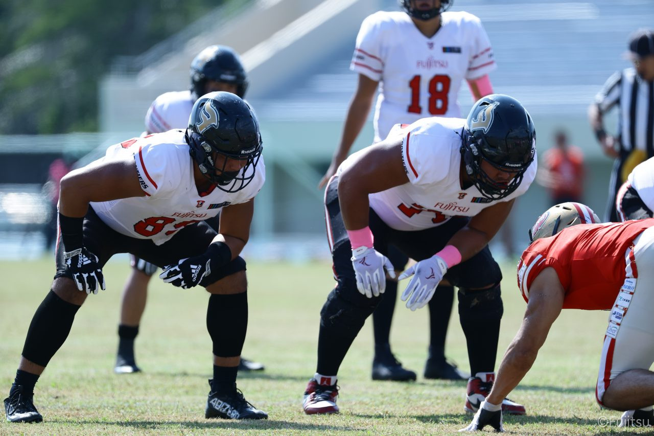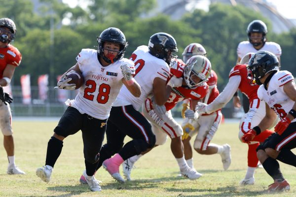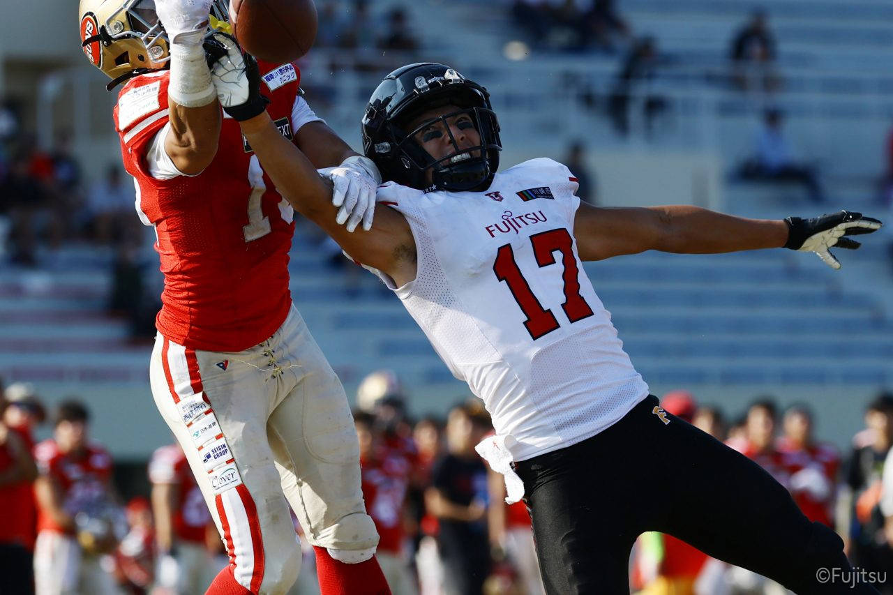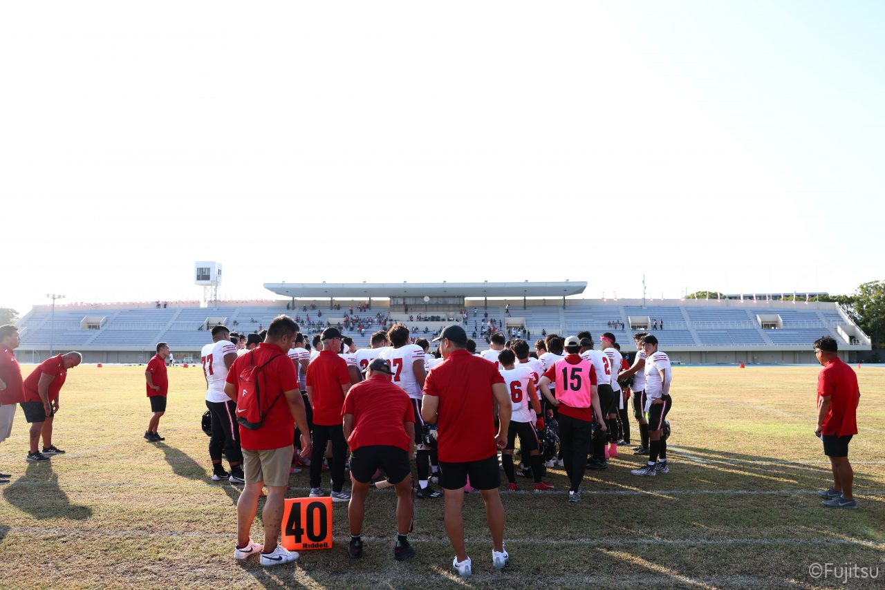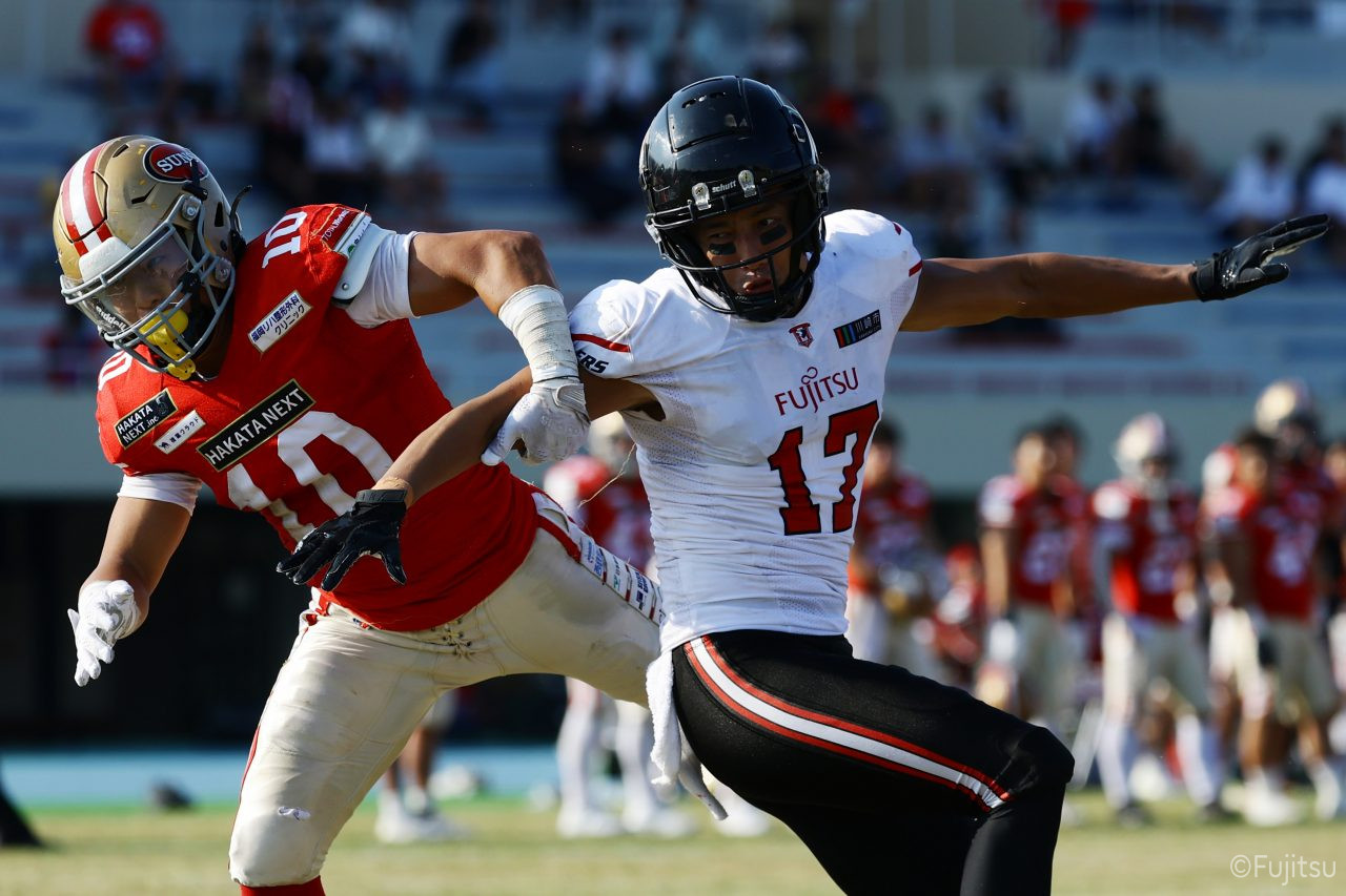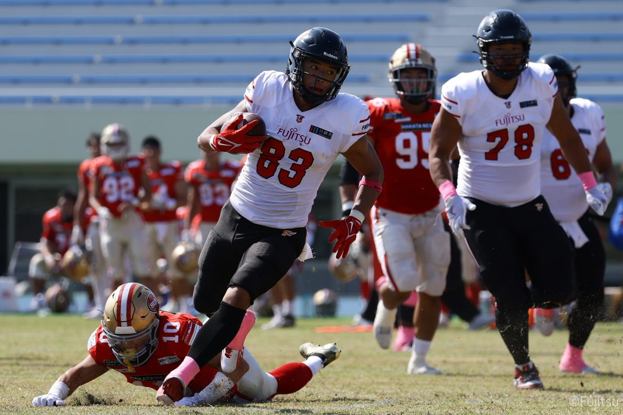試合開始直後から爆発的な攻撃力を見せつけた。RB(ランニングバック)#21三宅の13yランとWR(ワイドレシーバー)#83柴田の53yのランアフターキャッチでいきなりゴール前7yまで進むと、最後はRB#21三宅が押し込みタッチダウン。7-0と先制点を奪う。その後もQB(クォーターバック)#18高木からWR#17糸川幹への21y、WR#10サマジーへのそれぞれタッチダウンパスを通し、全く手を緩めることはなく、21-0で1Qを終える。