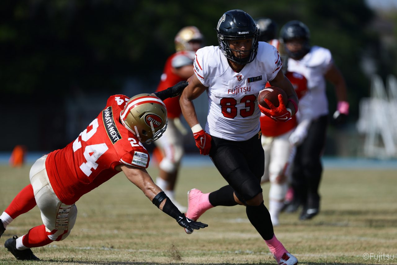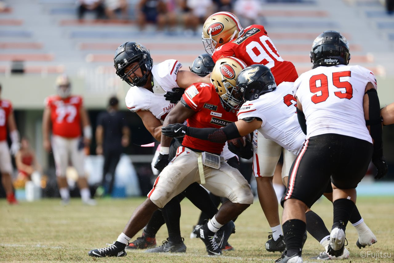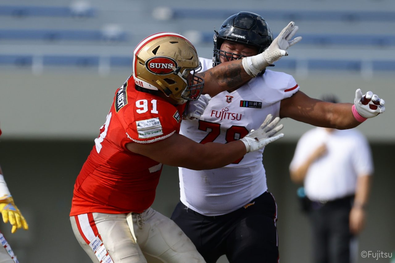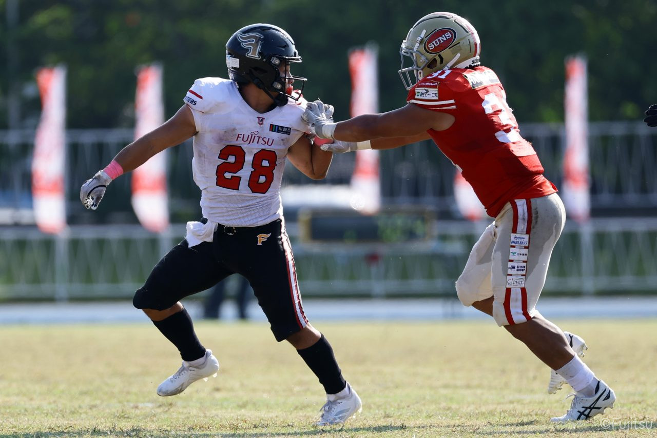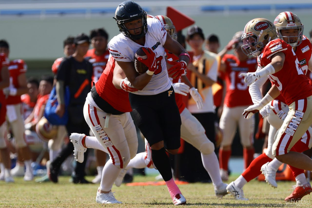 後半のキッカーは納所から#87内山へバトンタッチ。内山のキックで試合が再開。続くディフェンスはLB(ラインバッカー)#44趙のパスカットなどで凌ぐが、SUNSオフェンスは再三の4thダウンギャンブル、これをDL#91池田がQBサックで仕留め攻守交替すると、その後のオフェンスはRB#28香川が4回のラン&1回のパスキャッチで一人で53yを稼ぐ大活躍を見せタッチダウンし、48-0とする。
