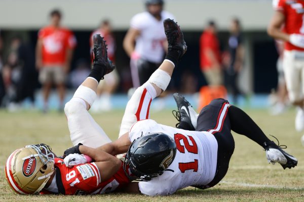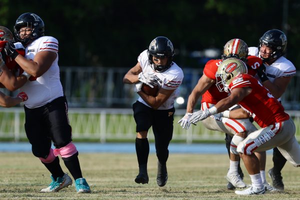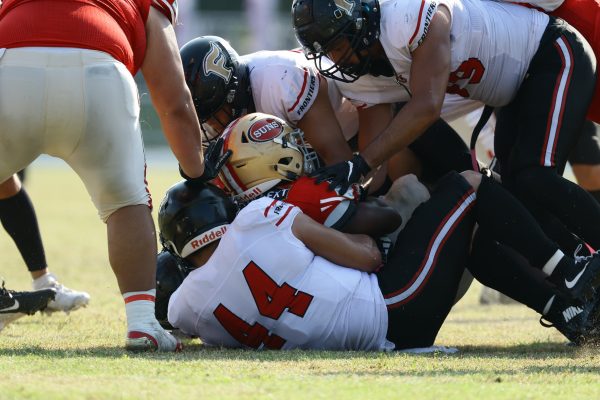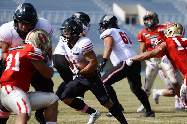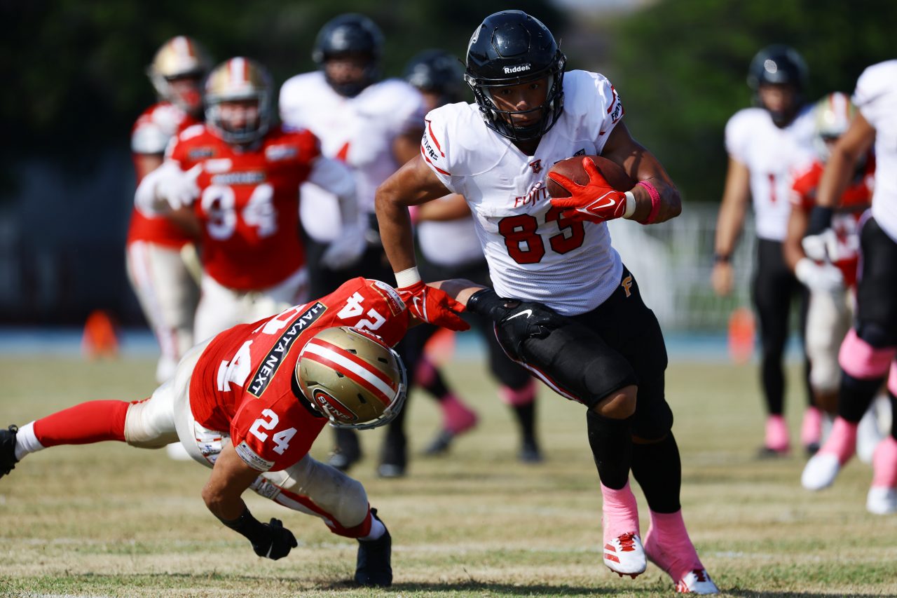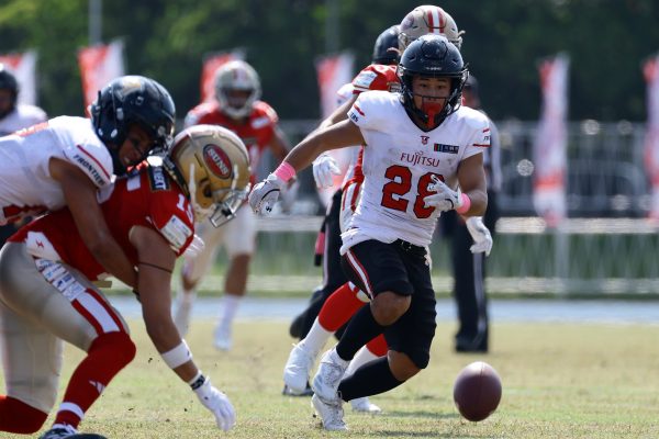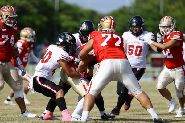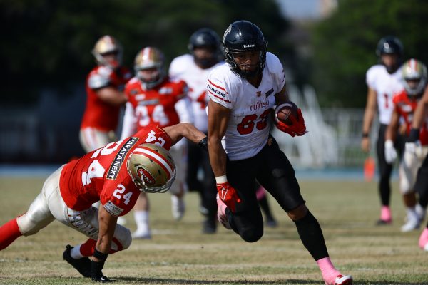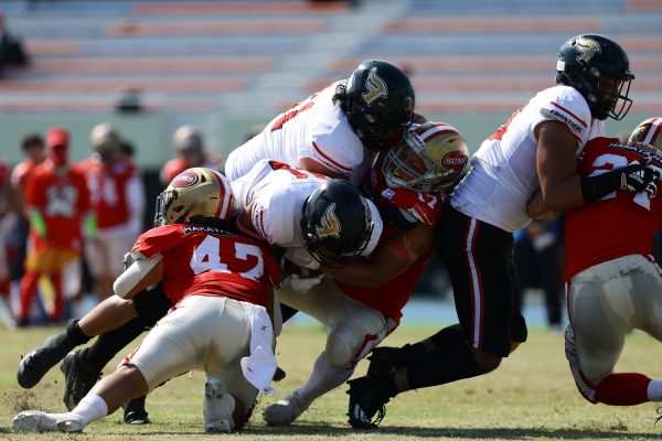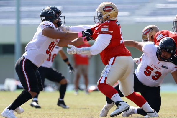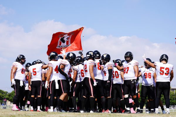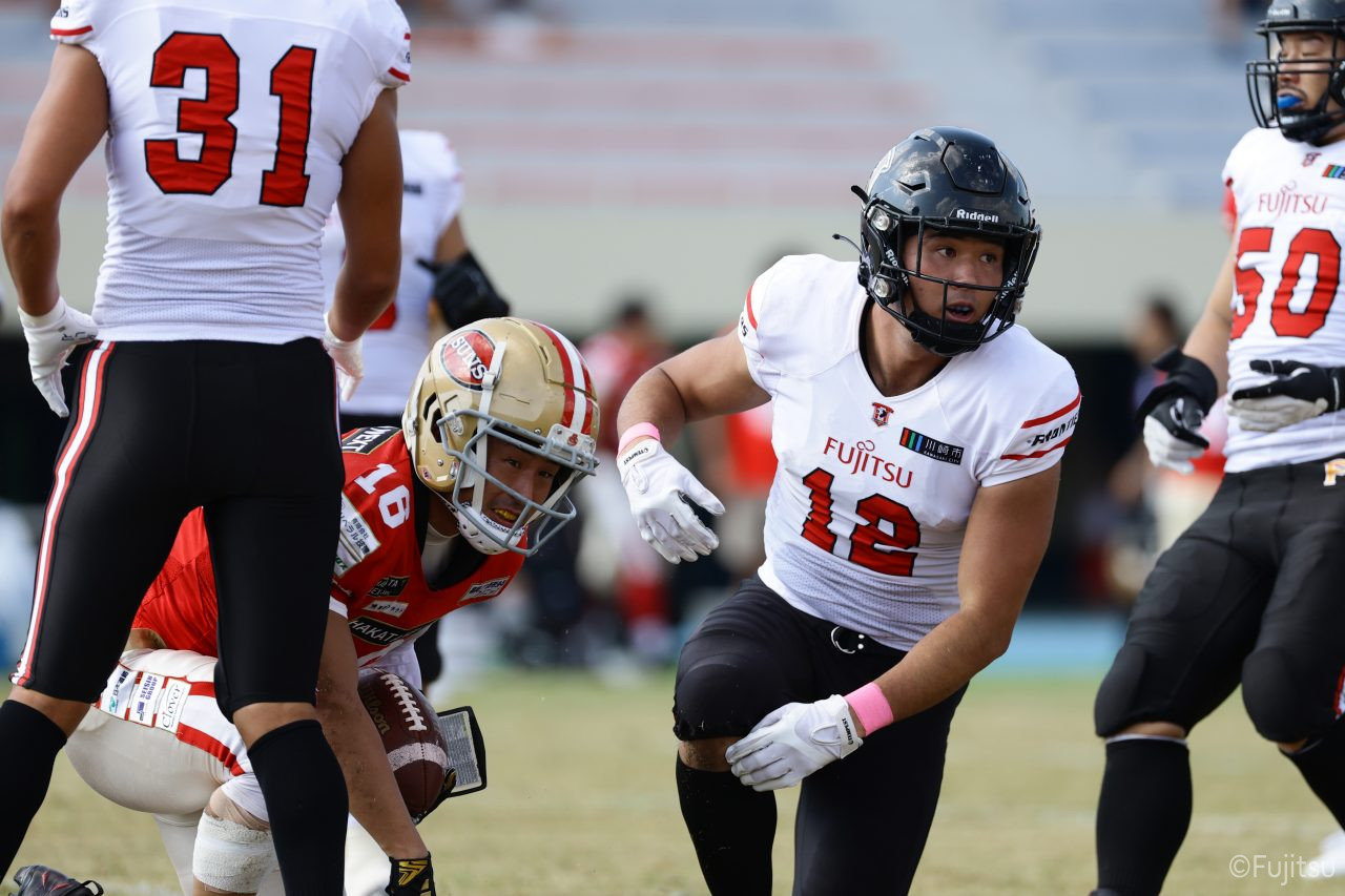 後半のキッカーは納所から#87内山へバトンタッチ。内山のキックで試合が再開。続くディフェンスはLB(ラインバッカー)#44趙のパスカットなどで凌ぐが、SUNSオフェンスは再三の4thダウンギャンブル、これをDL#91池田がQBサックで仕留め攻守交替すると、その後のオフェンスはRB#28香川が4回のラン&1回のパスキャッチで一人で53yを稼ぐ大活躍を見せタッチダウンし、48-0とする。
