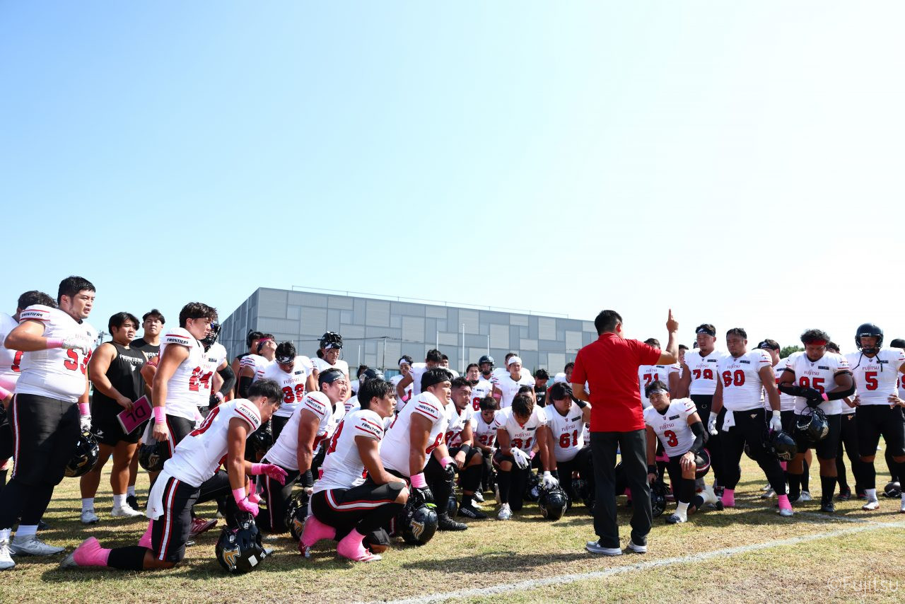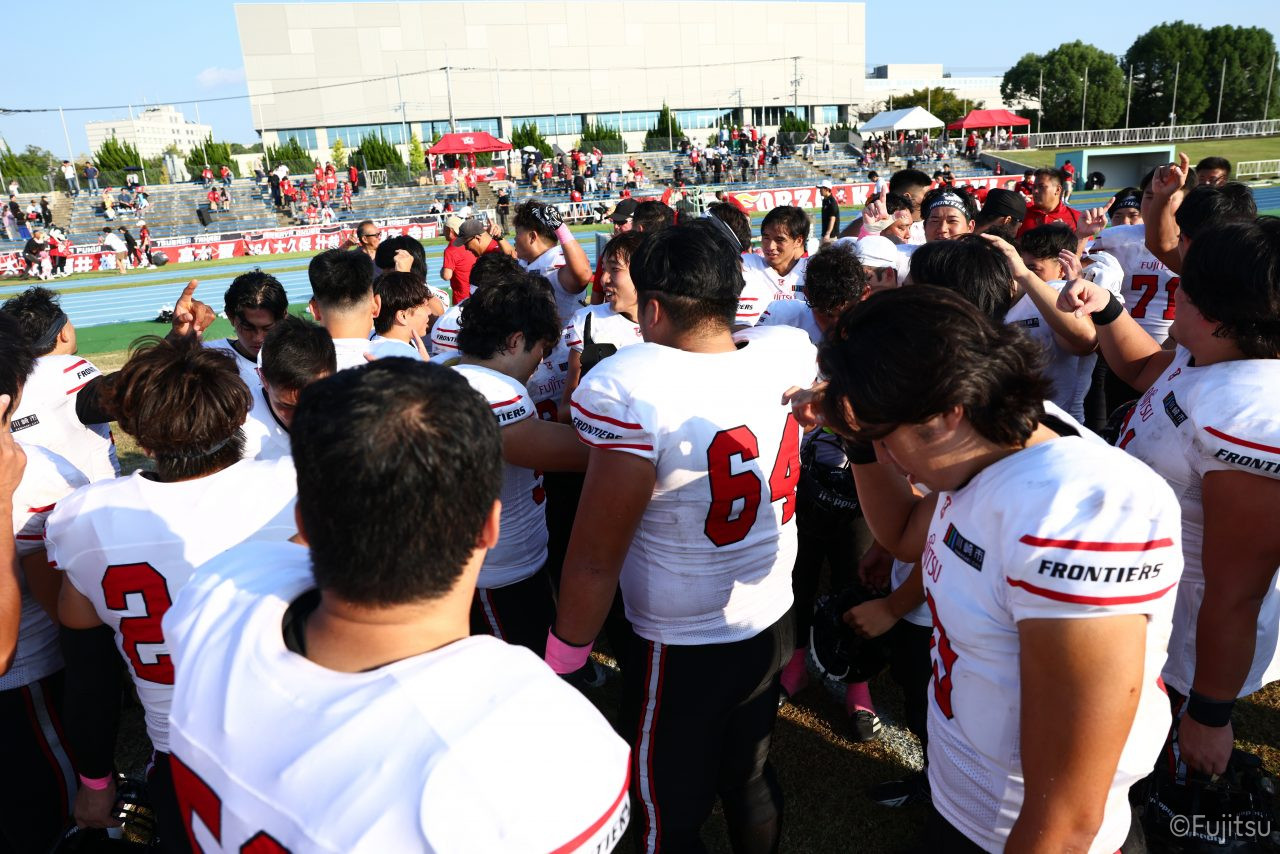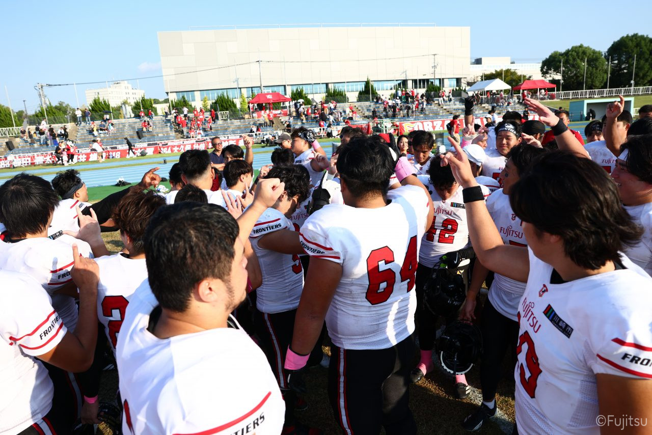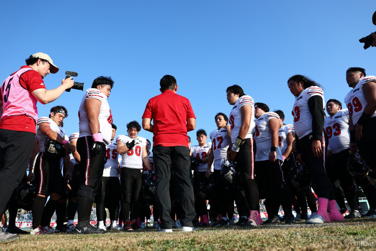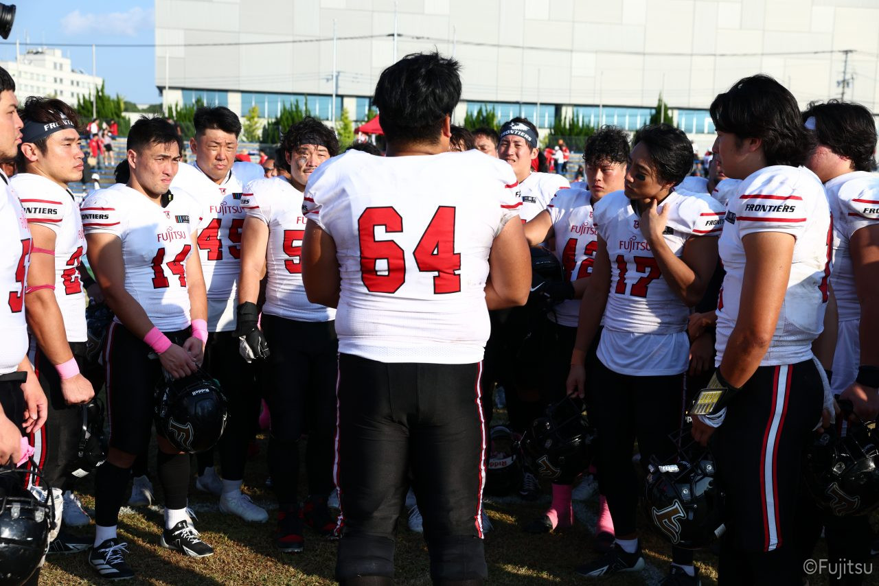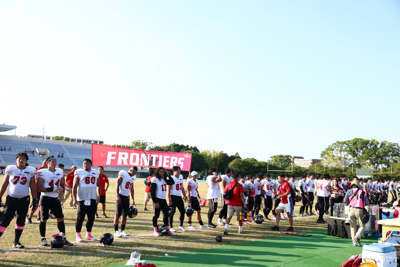 3Qから続いたオフェンスのシリーズはQB#19鎌田自らのランなどを含めロングドライブを展開、ゴール前1yまで持ち込みダウン更新すると最後はRB#4山嵜へのパスを成功させタッチダウン。K#87内山のキックも成功し55-0となる。SUNSオフェンスも一矢報いたいところだったが、1stダウンで投じたパスをDB#23丹羽がインターセプトし攻守交替。フロンティアーズオフェンスはここからQB#8濱口が率いる。しかし、2nd-10yでWR#83柴田を狙ったパスが浮いてしまいインターセプトをされてしまう。この日SUNSオフェンスとしては初めての敵陣進出となった好機、一方ピンチもしっかりと止めたいフロンティアーズディフェンスは、DB#31髙岡、丹羽、DL#97水谷らの活躍で粘りを見せるが、最後はSUNSの意地が勝ちこの日初めてのタッチダウンを献上してしまった。キックも決まってしまい55-7となる。追加点を狙いたいSUNSはオンサイドキック仕掛けるが、これをきっちり防ぎ、フロンティアーズのオフェンスとなる。確実な勝利とするため試合時間を刻むためランプレーを選択したが、RB#21三宅の35y独走で更に追加点をあげ62-7とダメ押しのタッチダウンを決める。その後はディフェンスがきっちりと抑えきり試合終了となった。