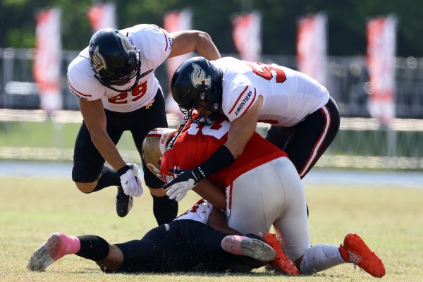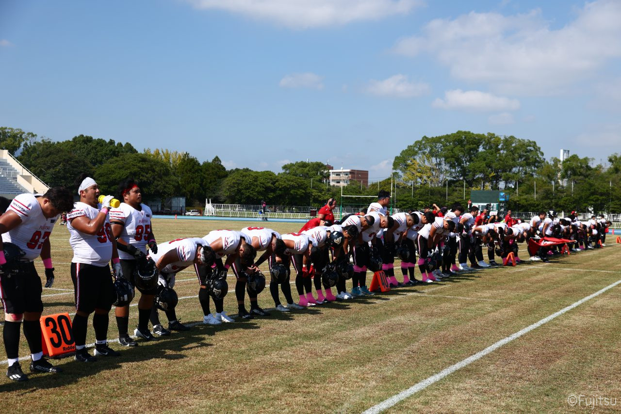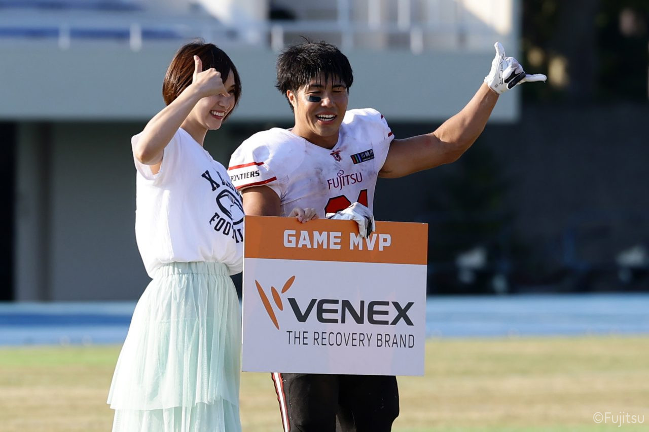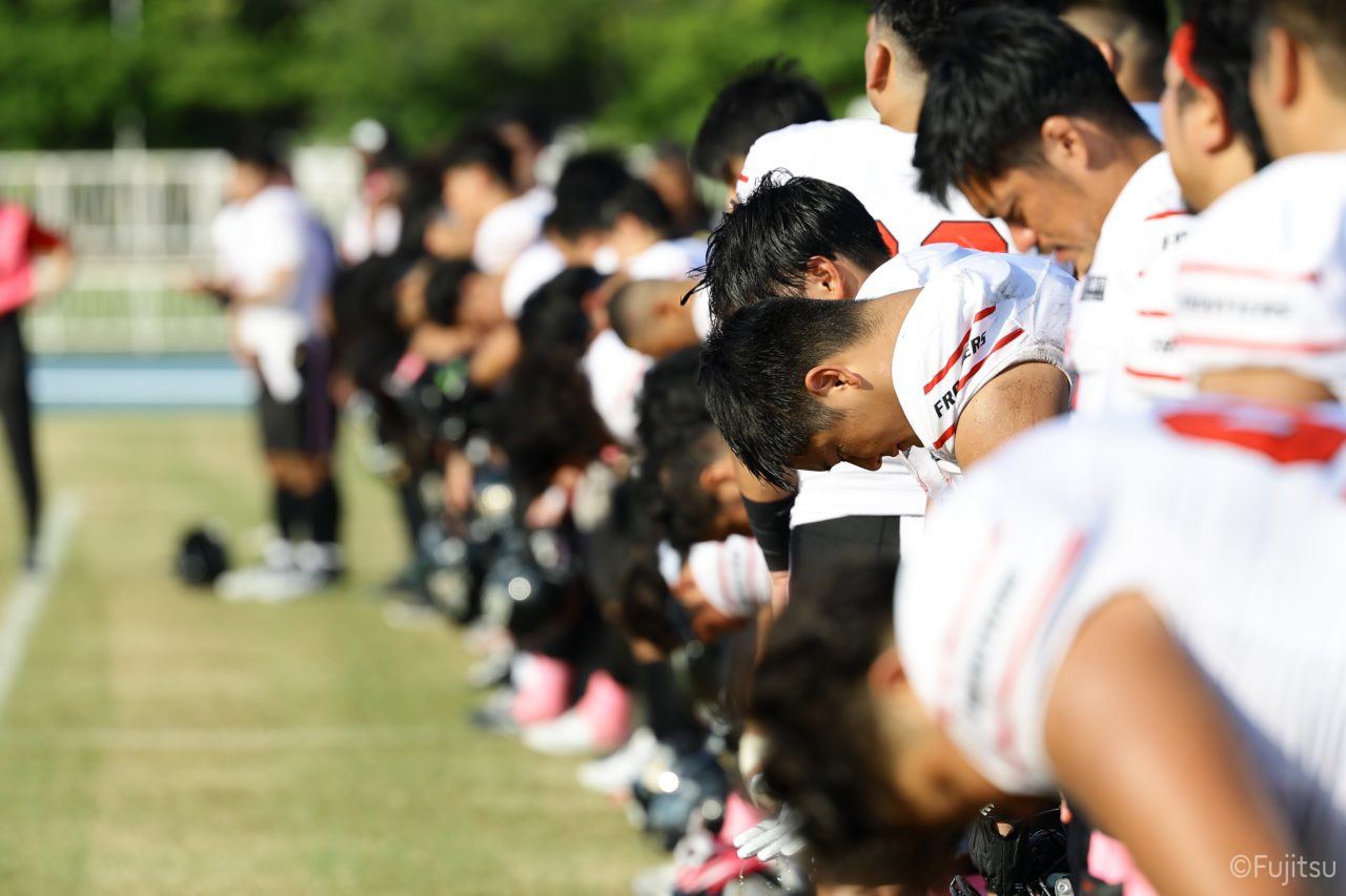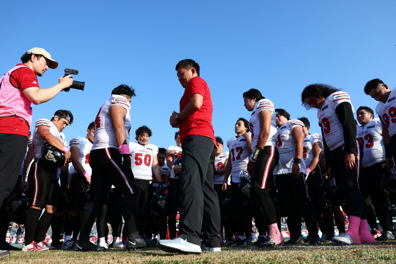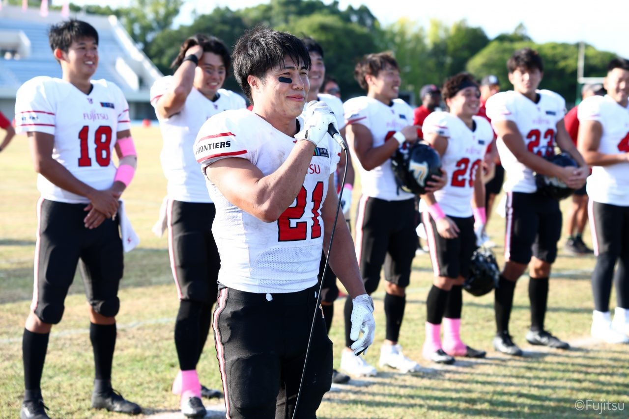 3Qから続いたオフェンスのシリーズはQB#19鎌田自らのランなどを含めロングドライブを展開、ゴール前1yまで持ち込みダウン更新すると最後はRB#4山嵜へのパスを成功させタッチダウン。K#87内山のキックも成功し55-0となる。SUNSオフェンスも一矢報いたいところだったが、1stダウンで投じたパスをDB#23丹羽がインターセプトし攻守交替。フロンティアーズオフェンスはここからQB#8濱口が率いる。しかし、2nd-10yでWR#83柴田を狙ったパスが浮いてしまいインターセプトをされてしまう。この日SUNSオフェンスとしては初めての敵陣進出となった好機、一方ピンチもしっかりと止めたいフロンティアーズディフェンスは、DB#31髙岡、丹羽、DL#97水谷らの活躍で粘りを見せるが、最後はSUNSの意地が勝ちこの日初めてのタッチダウンを献上してしまった。キックも決まってしまい55-7となる。追加点を狙いたいSUNSはオンサイドキック仕掛けるが、これをきっちり防ぎ、フロンティアーズのオフェンスとなる。確実な勝利とするため試合時間を刻むためランプレーを選択したが、RB#21三宅の35y独走で更に追加点をあげ62-7とダメ押しのタッチダウンを決める。その後はディフェンスがきっちりと抑えきり試合終了となった。