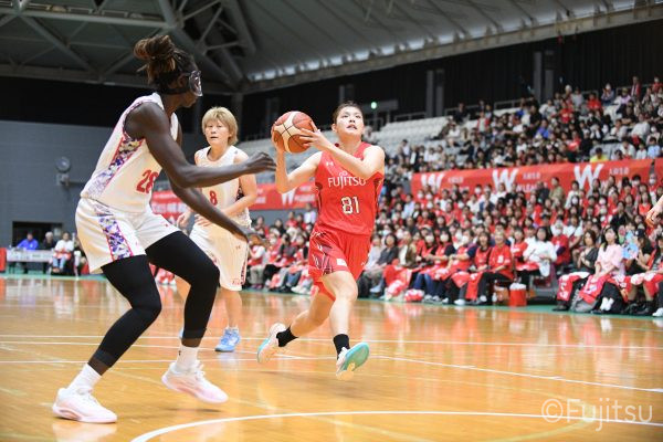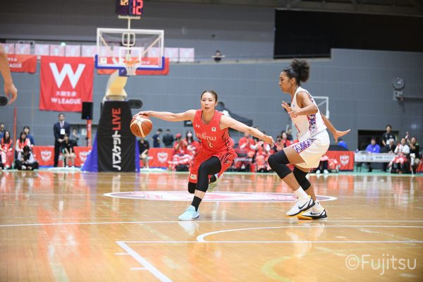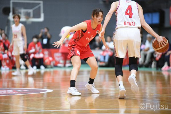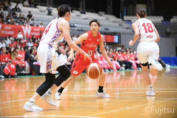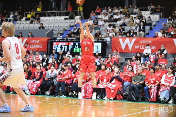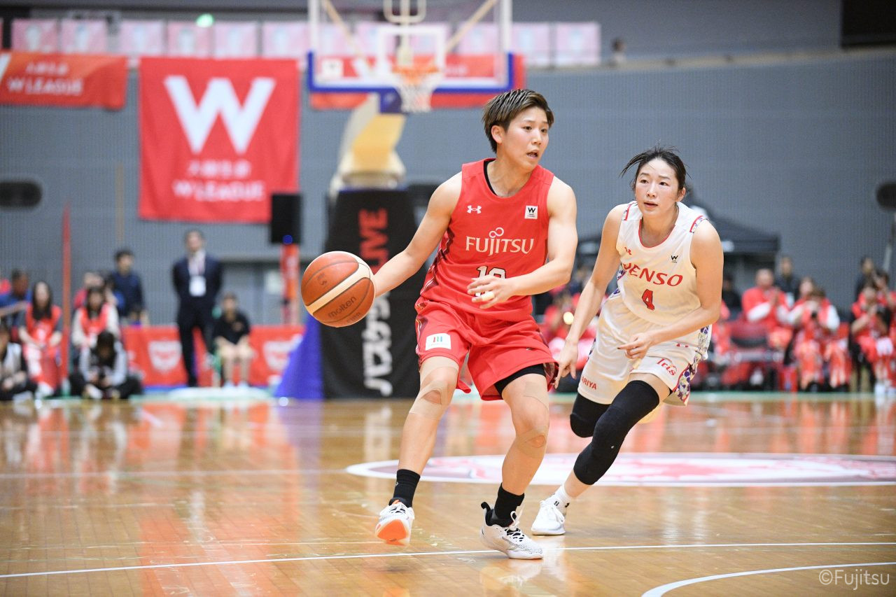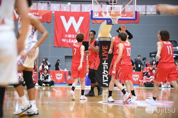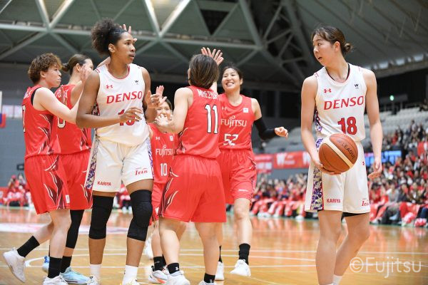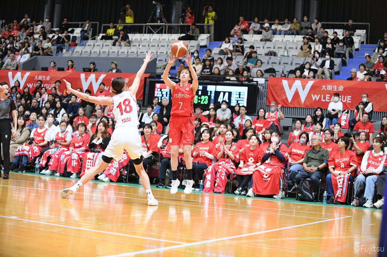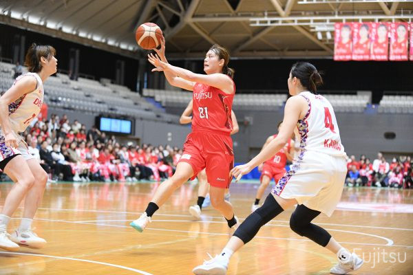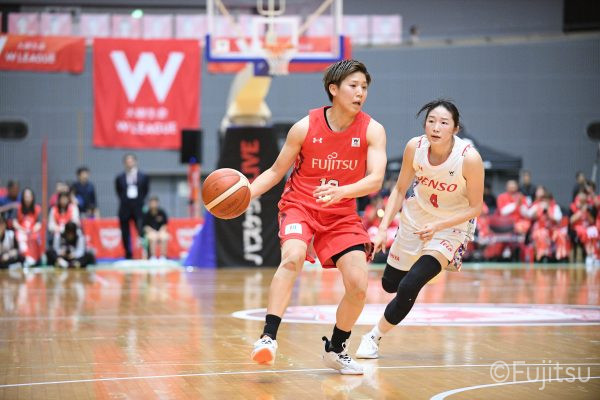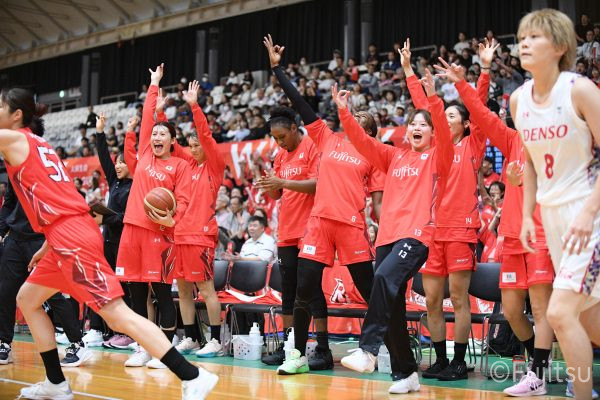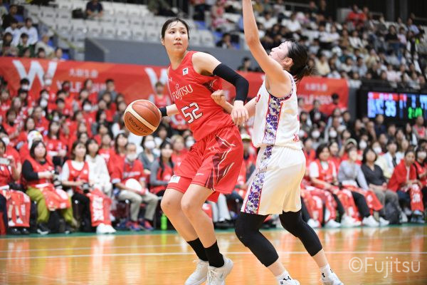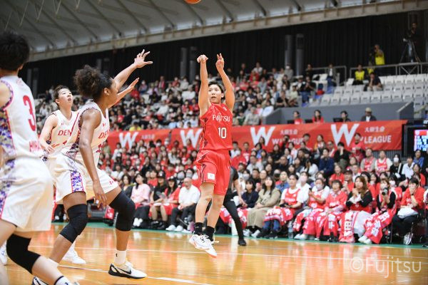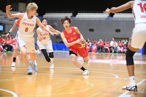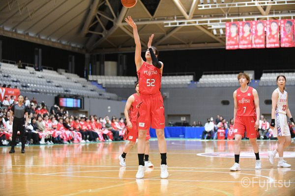 第3Qも失点からスタートするが、#11前澤のフリースローや#52宮澤のバスケットカウントなどで押し返していく。デンソーの攻撃に失点もするが、#11前澤のバックカットに#52宮澤がパスを通して、それがバスケットカウントとなり、チームに流れを呼び込む。中盤には#10町田のパスを受けた#7林(咲)が3ポイントシュートを沈め、その#10町田のジャンプシュートと、#22エブリンのシュートも決まって、リードを二桁に広げる。その後も#22エブリンのリバウンドシュートや、#52宮澤、#9赤木、#10町田の3連続3ポイントシュートが決まる。終盤に3連続失点し、さらにピンチも招くが、最後は#18藤本が相手のボールに反応して得点を許さず、65-52で第3Qを終える。