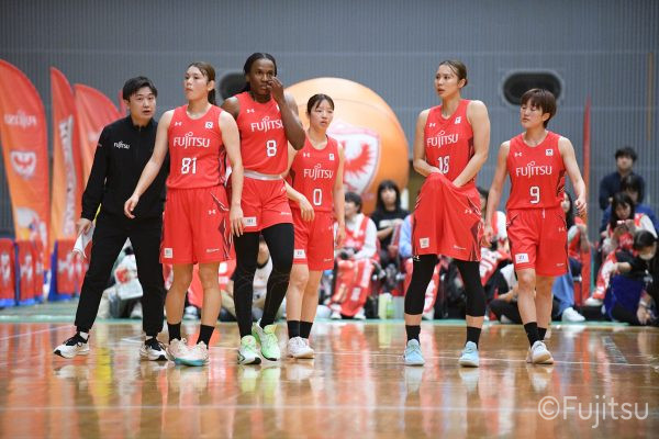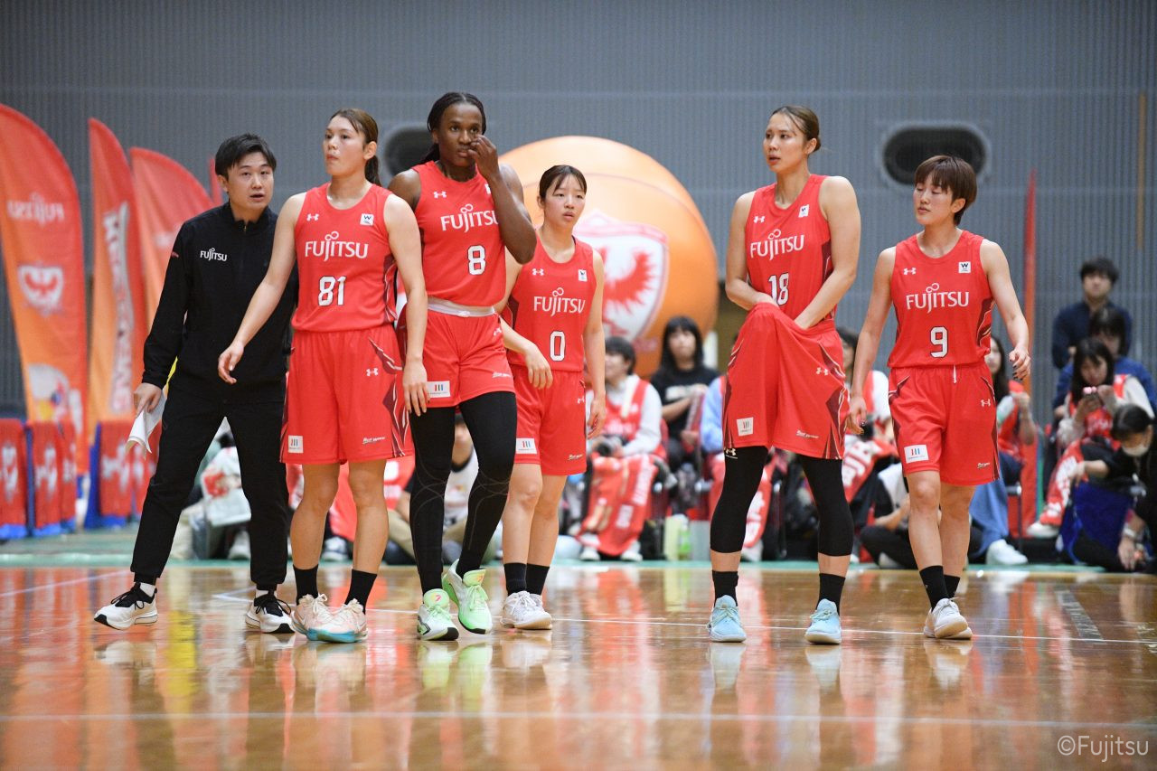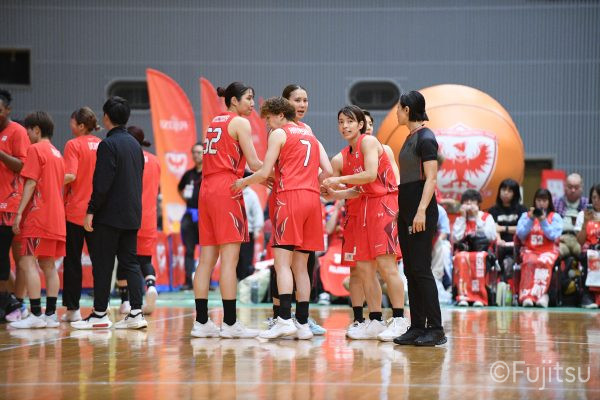 2025-26シーズンの開幕戦は小田原でデンソーアイリスとの対戦。レッドウェーブのスタメンは#7林、#9赤木、#10町田、#18藤本、#52宮澤。いきなり先制点を奪われるが、#18藤本のシュートで同点にすると、#7林(咲)の3ポイントシュートで抜け出す。#52宮澤はリーグ通算4000得点をフリースローで決めると、さらに3ポイントシュートも沈めて、デンソーにタイムアウトを取らせる。その後は失点しながらも、#18藤本のリバウンドシュートや#22エブリンの3連続得点などでリードを広げていく。終盤には#81宮下のジャンプシュートが決まり、最後も#10町田のドライブが決まって、23-14で第1Qを終える