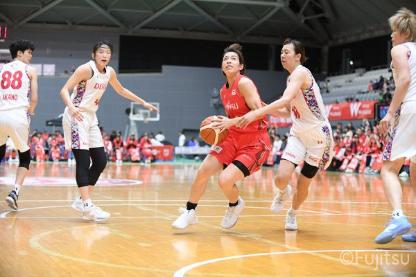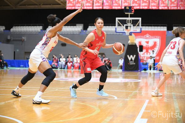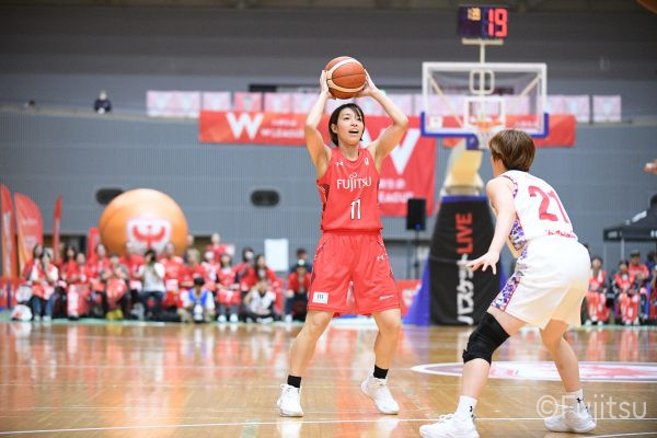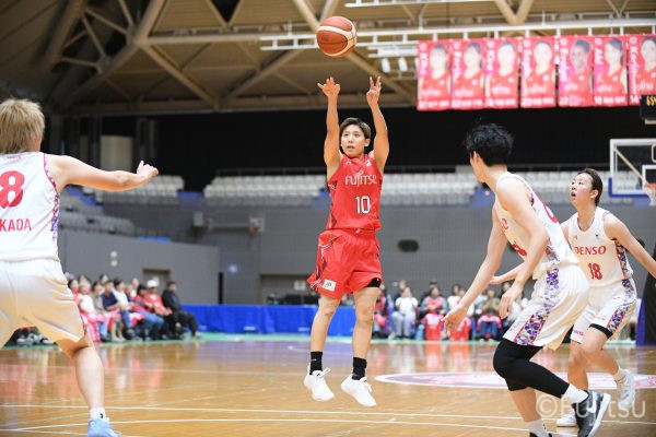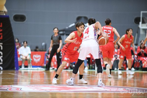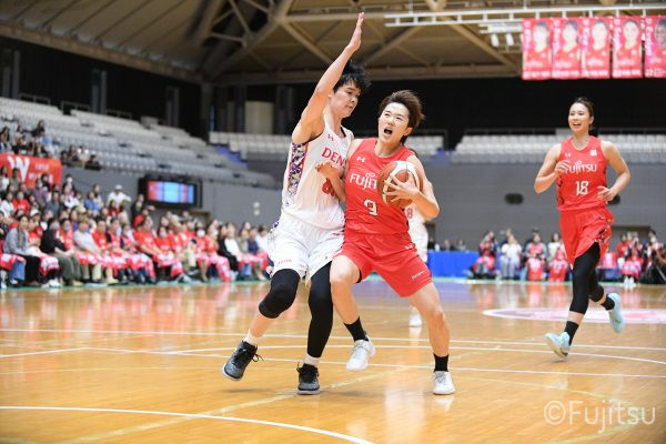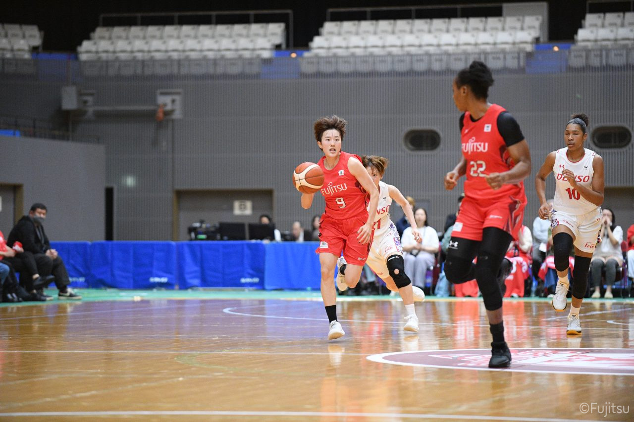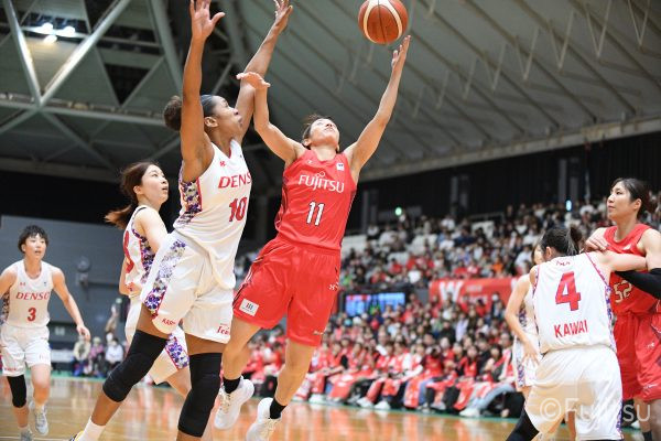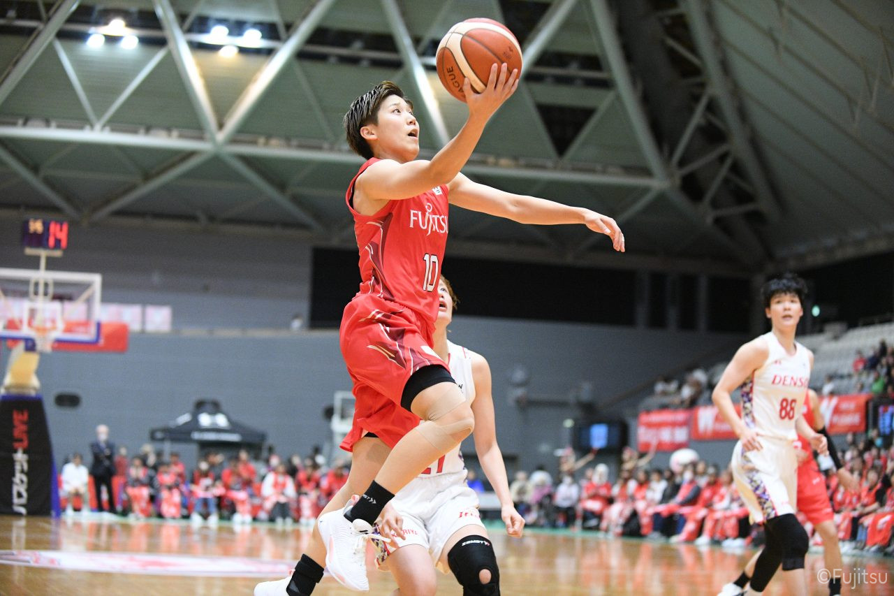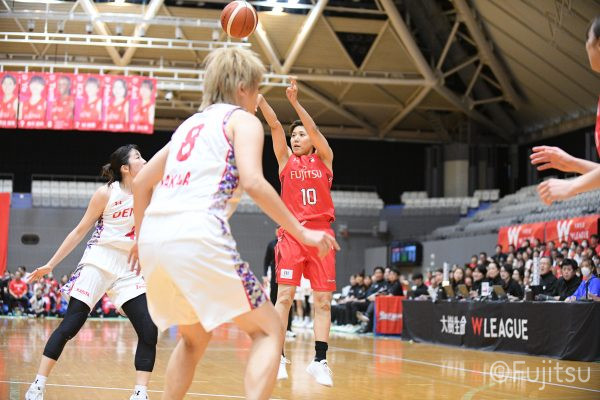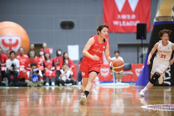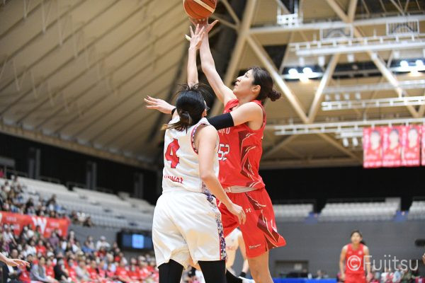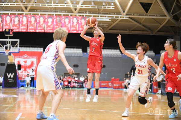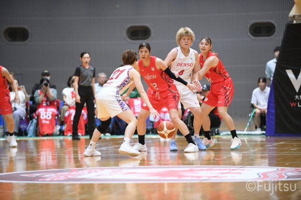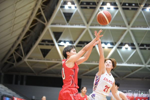 #11前澤のシュートでリードするが、その後はデンソーの固いディフェンスを攻略できず、得点が伸びていかない。ターンオーバーも続出してリズムがつかめないなか、ディフェンスでも相手の勢いを止めきれずに失点を重ねてしまう。中盤には#8テミトペがオフェンスリバウンドからバスケットカウントを決め、終盤にも#10町田のパスを受けた#52宮澤が3ポイントシュートを沈めるが、それぞれ単発に終わる。最後は#22エブリンがフリースローを決めるが、追いつくまでには至らず、26-32で前半を折り返す。