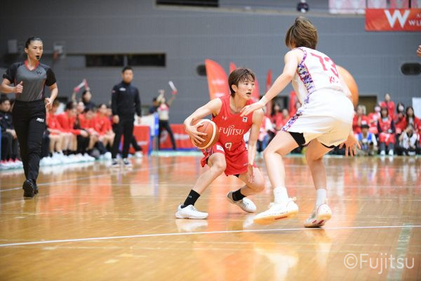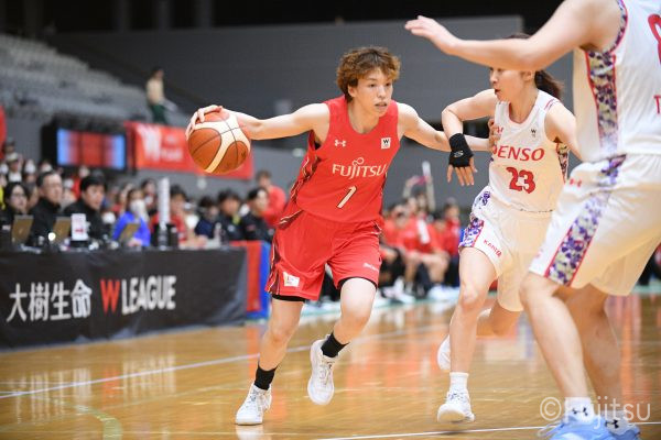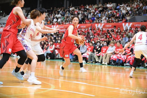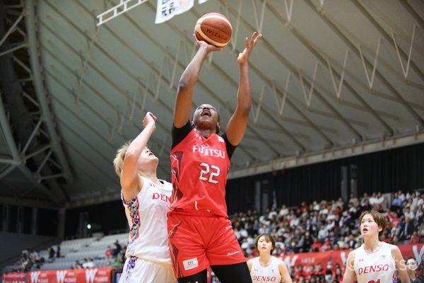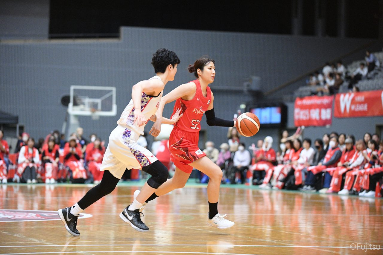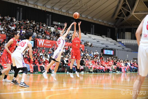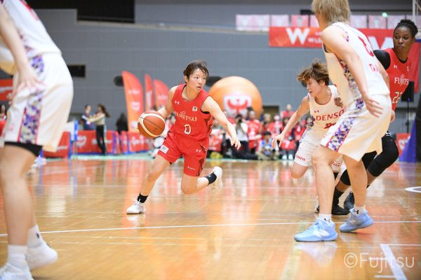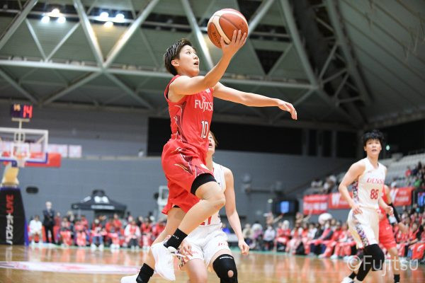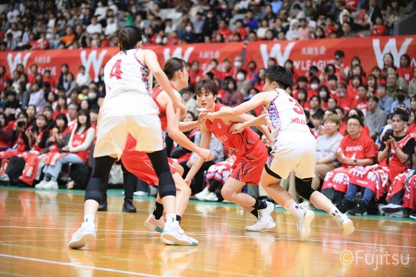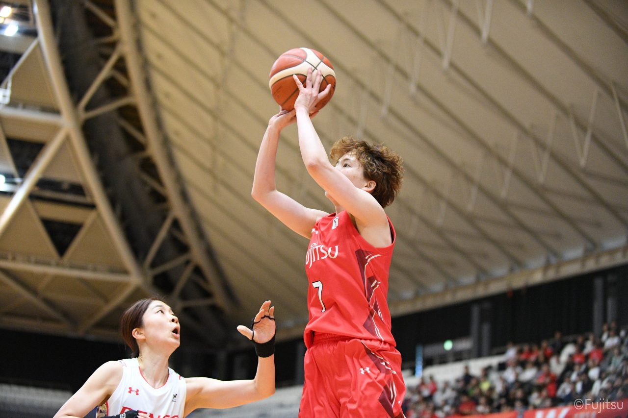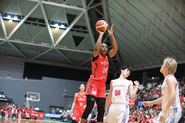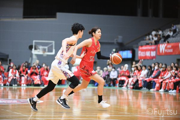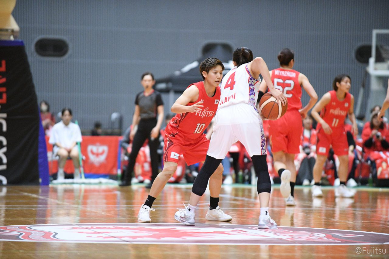 #11前澤のシュートでリードするが、その後はデンソーの固いディフェンスを攻略できず、得点が伸びていかない。ターンオーバーも続出してリズムがつかめないなか、ディフェンスでも相手の勢いを止めきれずに失点を重ねてしまう。中盤には#8テミトペがオフェンスリバウンドからバスケットカウントを決め、終盤にも#10町田のパスを受けた#52宮澤が3ポイントシュートを沈めるが、それぞれ単発に終わる。最後は#22エブリンがフリースローを決めるが、追いつくまでには至らず、26-32で前半を折り返す。