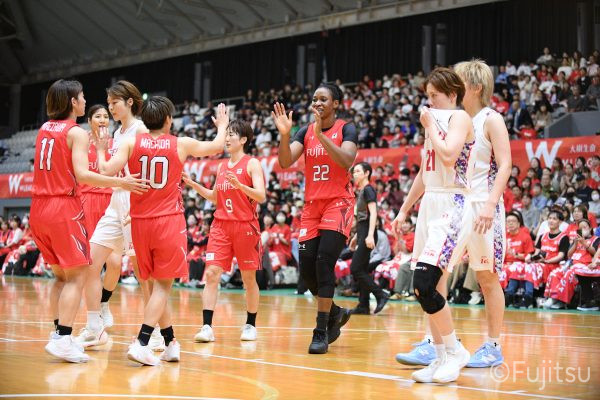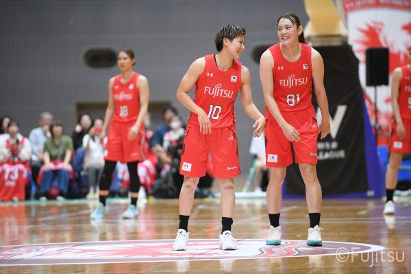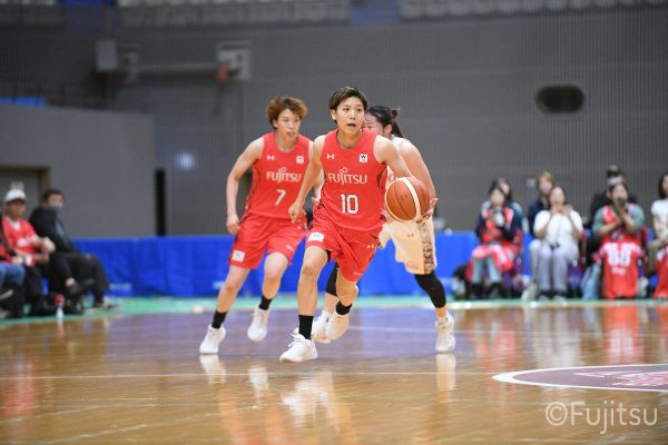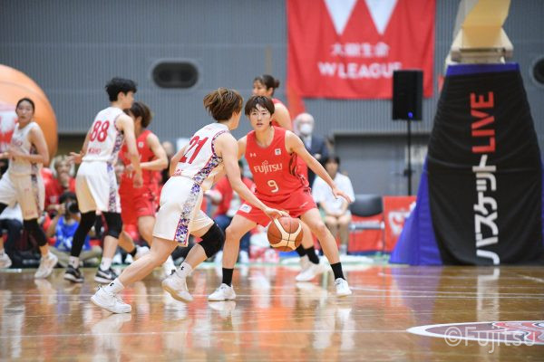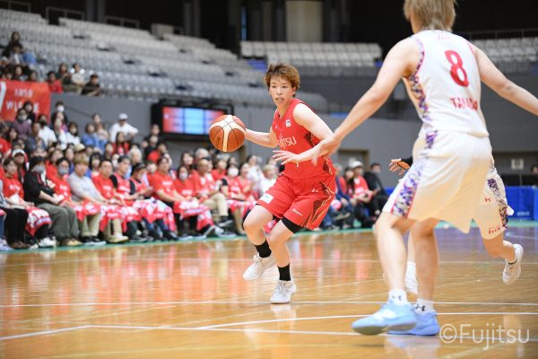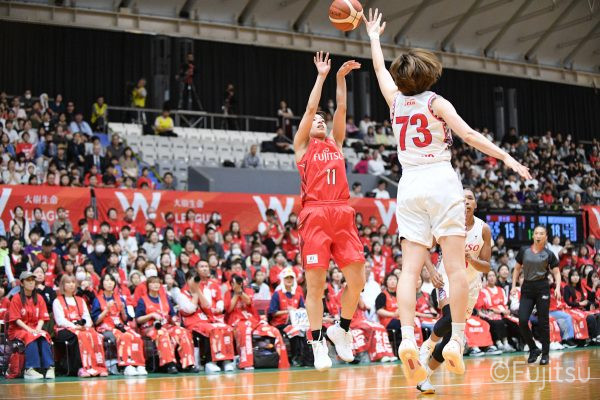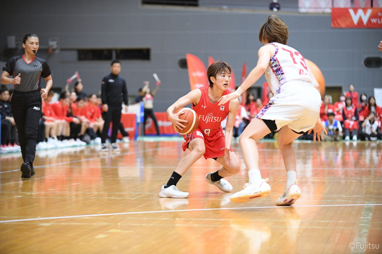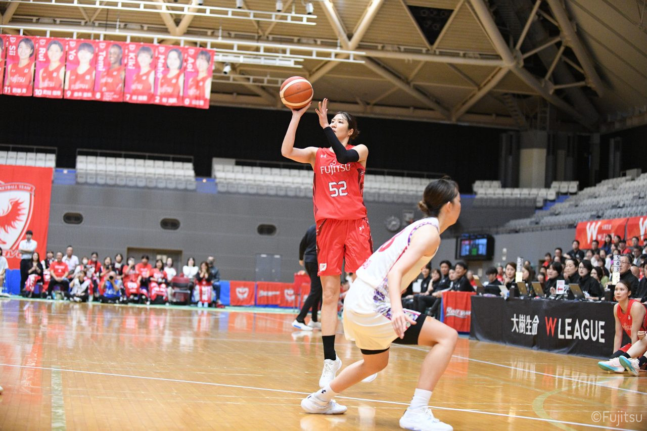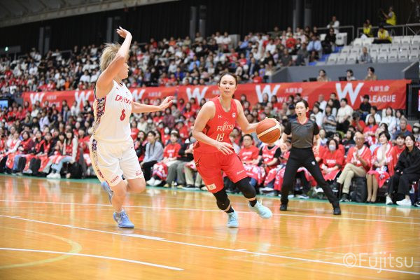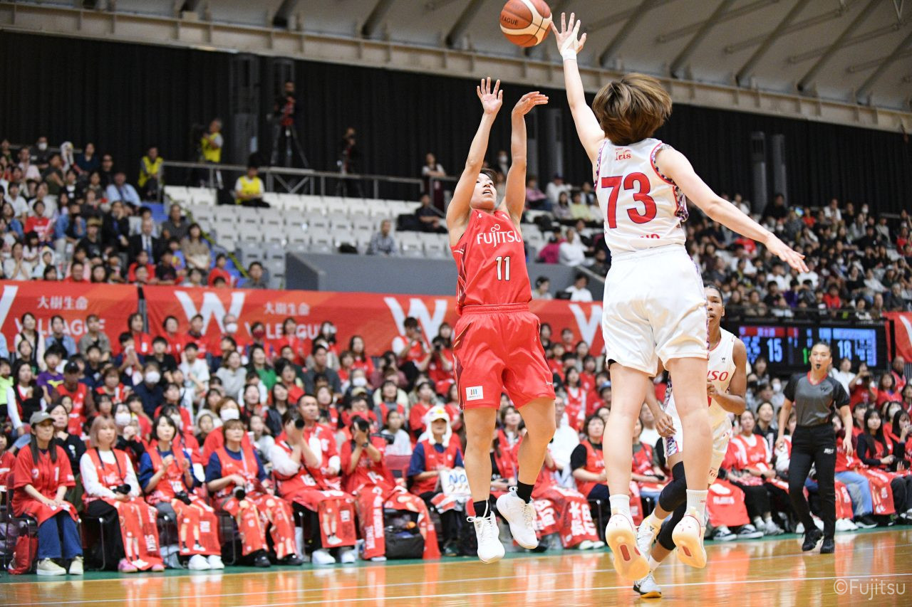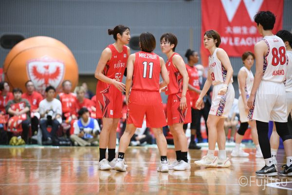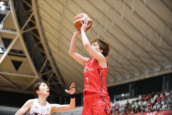#11前澤のシュートでリードするが、その後はデンソーの固いディフェンスを攻略できず、得点が伸びていかない。ターンオーバーも続出してリズムがつかめないなか、ディフェンスでも相手の勢いを止めきれずに失点を重ねてしまう。中盤には#8テミトペがオフェンスリバウンドからバスケットカウントを決め、終盤にも#10町田のパスを受けた#52宮澤が3ポイントシュートを沈めるが、それぞれ単発に終わる。最後は#22エブリンがフリースローを決めるが、追いつくまでには至らず、26-32で前半を折り返す。