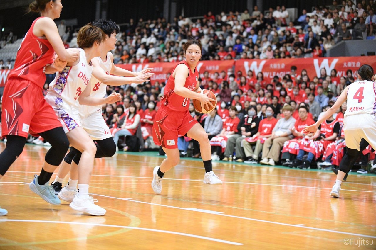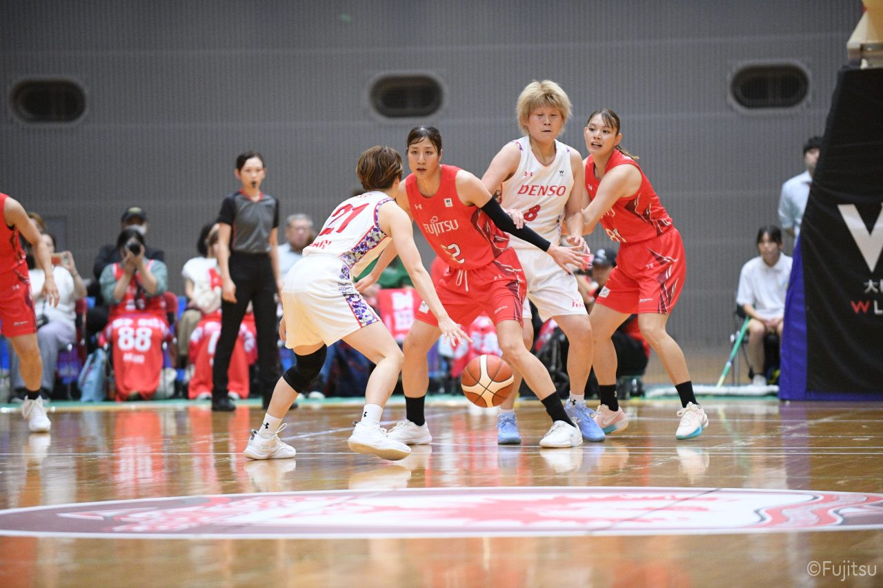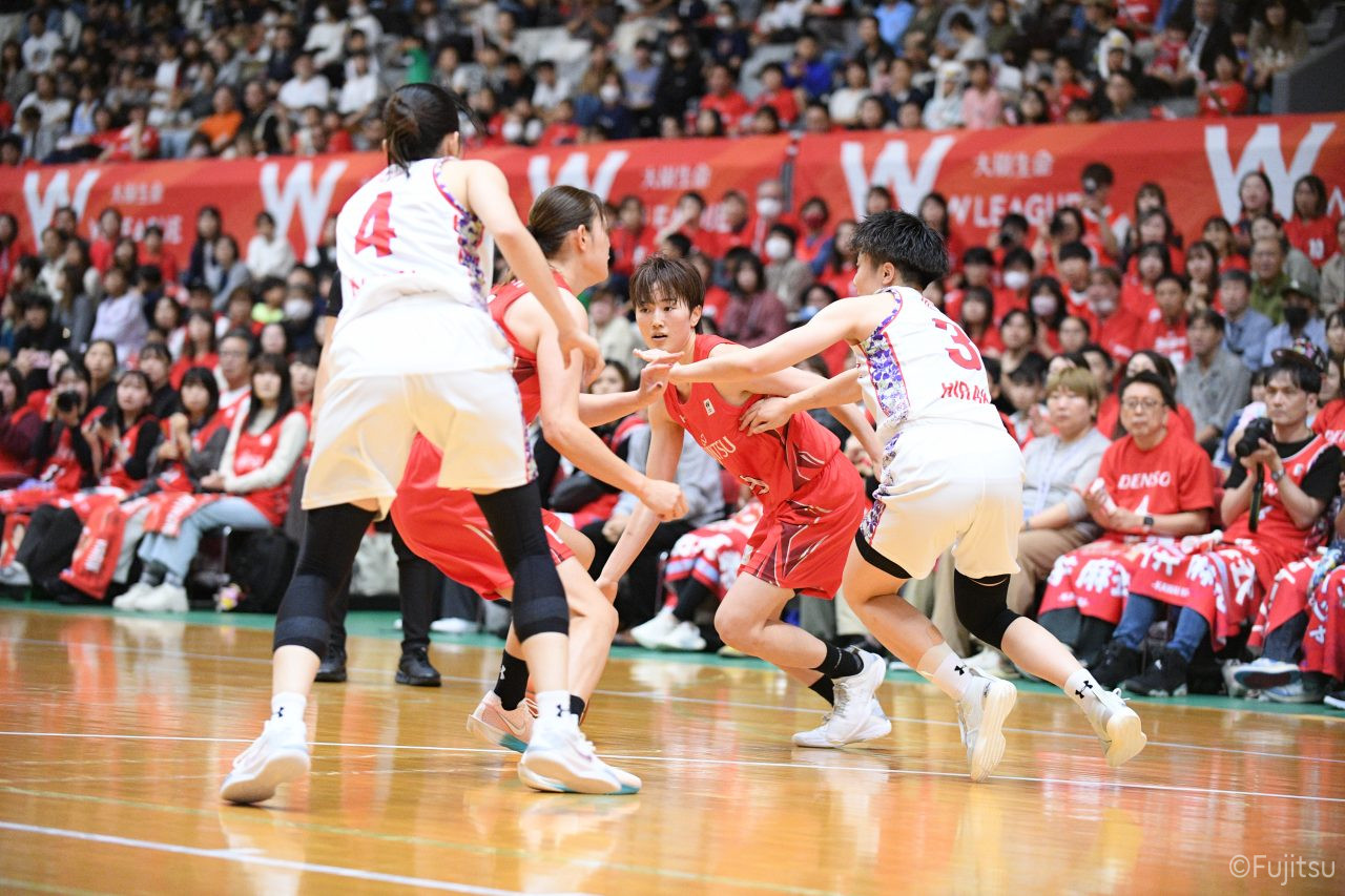 #11前澤から#22エブリンにつながるコンビプレーでレッドウェーブが先に得点を動かす。しかしデンソーの攻撃を止めきれずに連続失点。タイムアウトを取る。#52宮澤から#9赤木につながる速攻や、#10町田のドライブも決まるが、ターンオーバーの連鎖を修正しきれず、大きな波をつかめない。それでも中盤には、#10町田と#11前澤のコンビプレーや、#18藤本のジャンプシュート、#52宮澤の3ポイントシュートで10点ビハインドにまで押し返す。終盤にも#11前澤のシュートや#22エブリンのゴール下などが決まるが、デンソーの攻撃を防ぎきれない。最後は#9赤木がシュートを決めて58-68。今シーズン初の敗北を喫した。