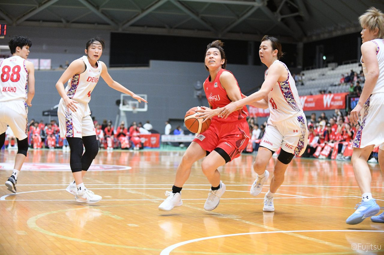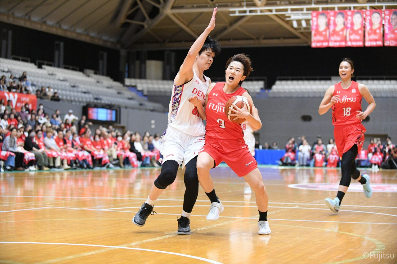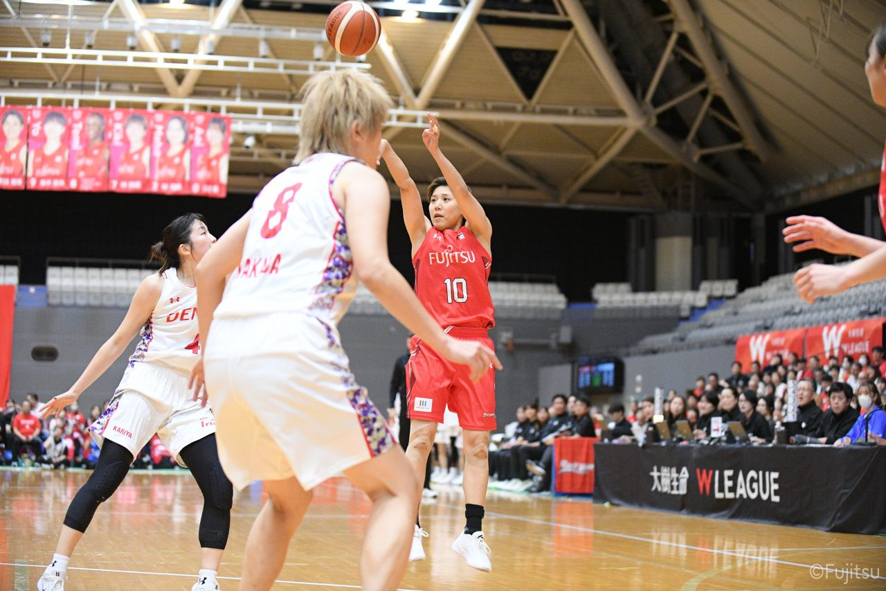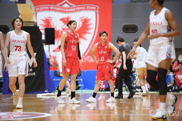 #11前澤から#22エブリンにつながるコンビプレーでレッドウェーブが先に得点を動かす。しかしデンソーの攻撃を止めきれずに連続失点。タイムアウトを取る。#52宮澤から#9赤木につながる速攻や、#10町田のドライブも決まるが、ターンオーバーの連鎖を修正しきれず、大きな波をつかめない。それでも中盤には、#10町田と#11前澤のコンビプレーや、#18藤本のジャンプシュート、#52宮澤の3ポイントシュートで10点ビハインドにまで押し返す。終盤にも#11前澤のシュートや#22エブリンのゴール下などが決まるが、デンソーの攻撃を防ぎきれない。最後は#9赤木がシュートを決めて58-68。今シーズン初の敗北を喫した。