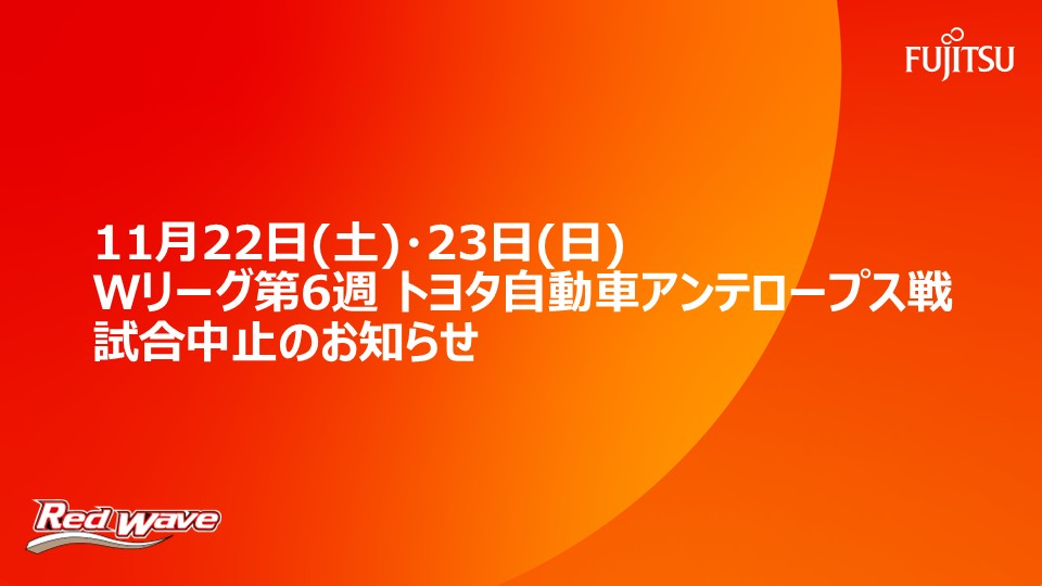 本日 11月22日(土)、明日 23日(日)に予定されていた大樹生命Wリーグ 2025-26シーズン第6週vsトヨタ自動車戦につきまして、富士通レッドウェーブ内にてインフルエンザ罹患者が多発し、試合実施が困難となったため、急遽中止となりました。