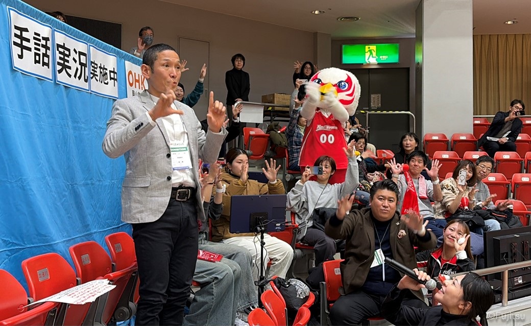 当日は、30年以上にわたり手話放送を継続するOHK岡山放送の運営のもと、デフリンピック自転車競技日本代表でOHK手話実況アカデミーの早瀨憲太郎さんが、試合の面白さやバスケの魅力を手話実況を使って解説してくれました。