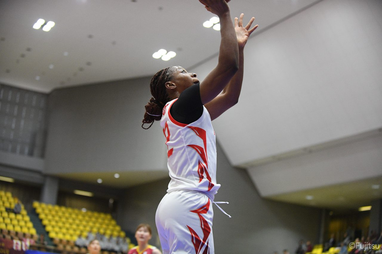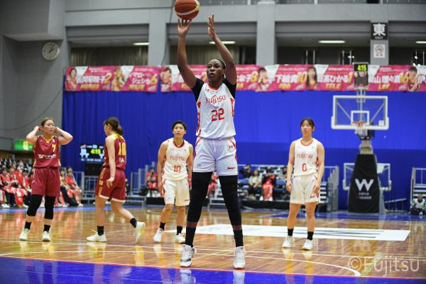 第2Qはリバウンドからの失点でスタートするが、#0山田が3ポイントシュートとリバウンドシュートで連続得点。#9赤木もドライブで続いて、押し返していく。その後は一進一退の攻防が続き、中盤はお互いが強度の高いディフェンスを見せ、膠着状態となる。先に抜け出されて終盤に入ると、トヨタ紡織の3ポイントシュートに苦しめられるが、レッドウェーブはインサイド陣が奮起。#8テミトペがリバウンドシュートを決めると、#22エブリンは#10町田、#9アシストからゴール下のシュートをしっかり決めていく。最後は3ポイントシュートを決められるが35-33、2点リードで前半を折り返す。