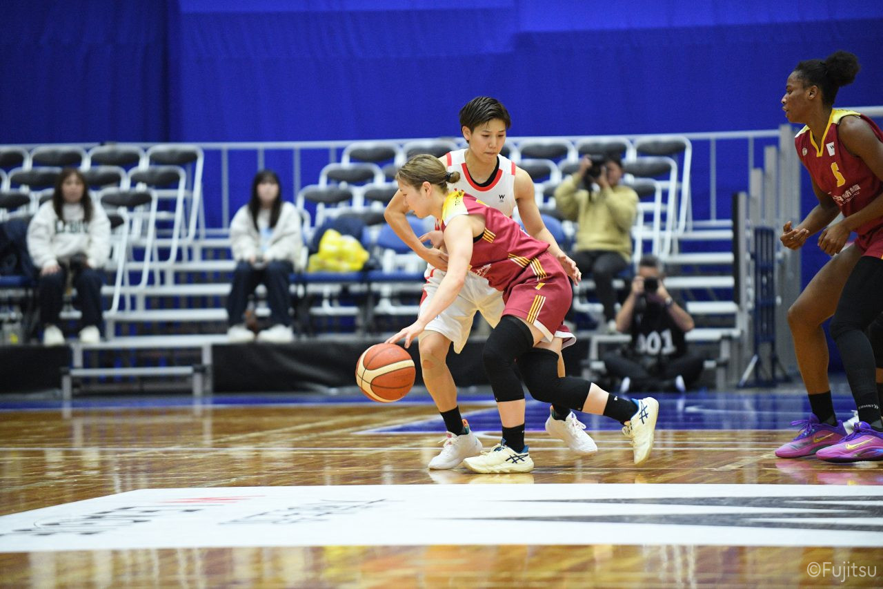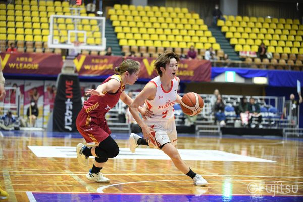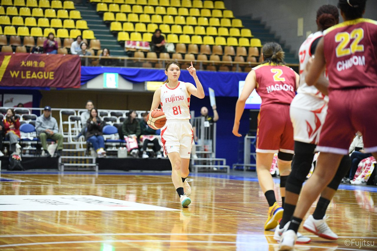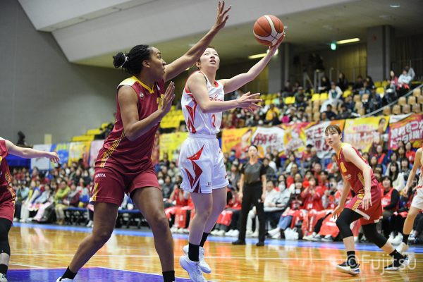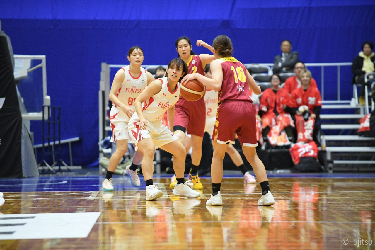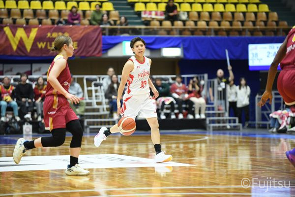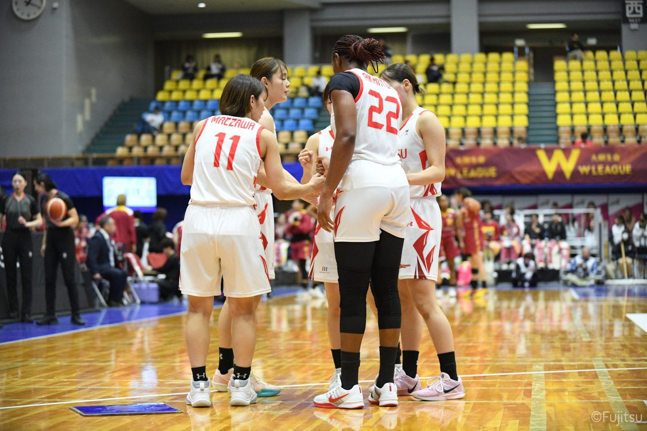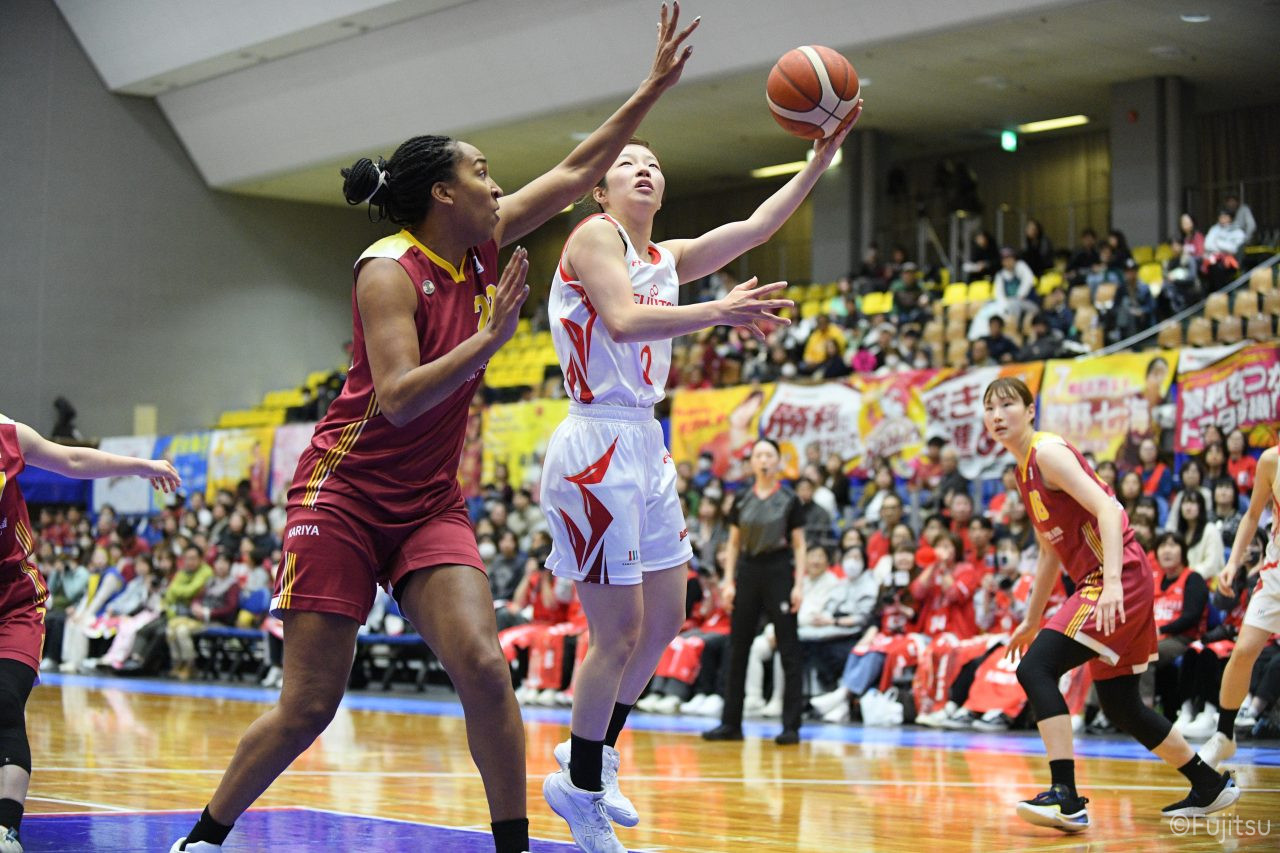 #0山田の3ポイントシュートで先行し、#81宮下から#22エブリンにつながるプレーでリードを保つ。しかし連続3ポイントシュートを決められて、逆転される。それでも#52宮澤、#8テミトペがフリースローを確実に決めてリードを奪い返すと、同点に追いつかれてからは#10町田が3ポイントシュートを決めて、再び先行する。競り合う展開のなかで#10町田のパスを受けた#22エブリンがシュートを決めると、#52宮澤もリバウンドからシュートをねじ込む。終盤には#10町田がドライブからのバックシュートと3ポイントシュートを決めるが44-45、1点のビハインドで前半を折り返す。