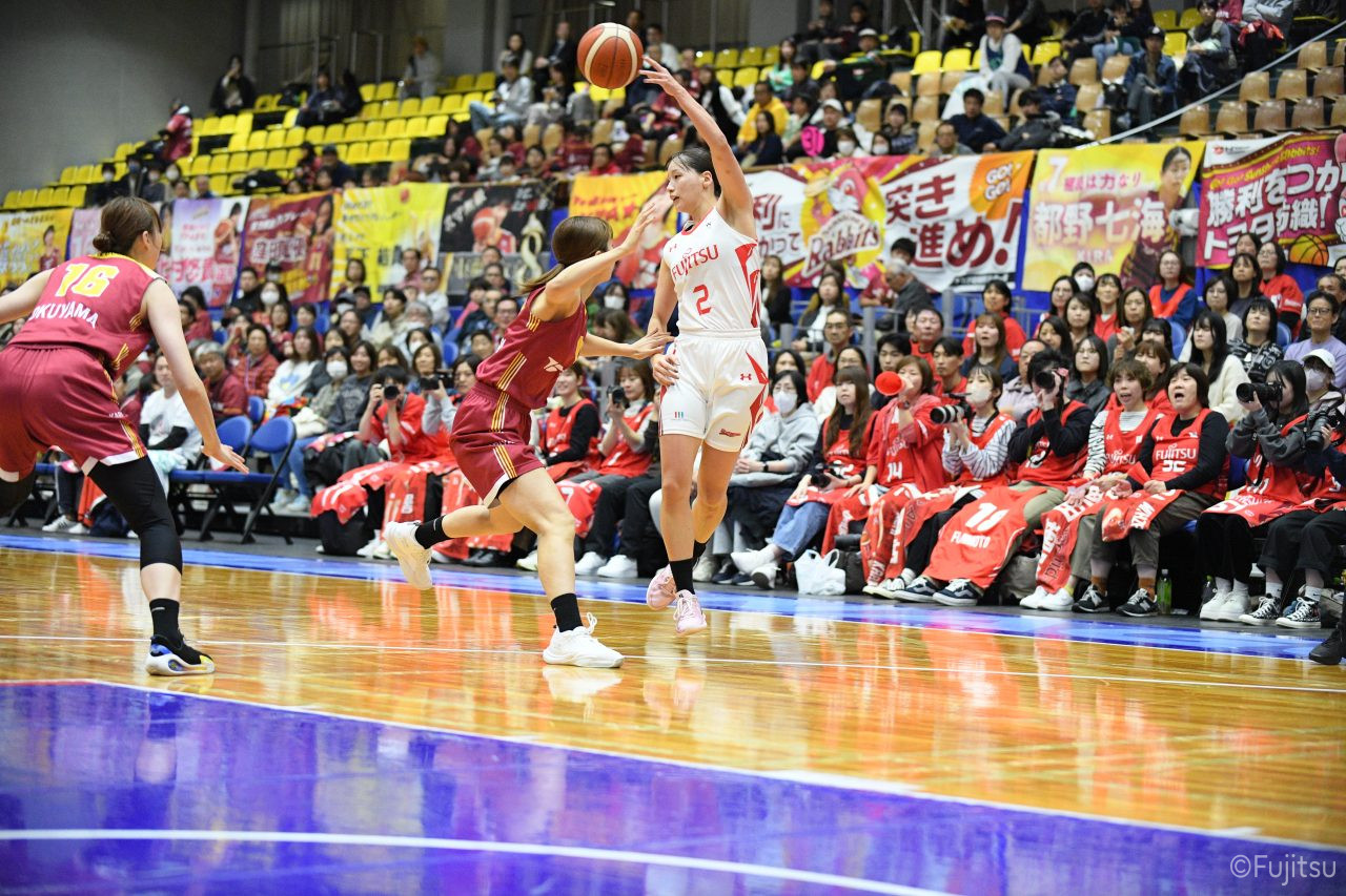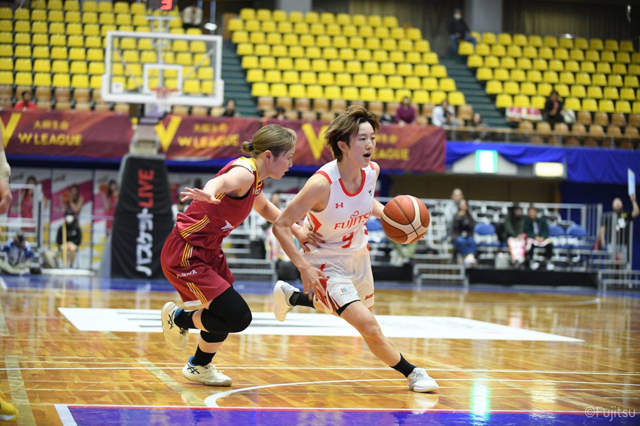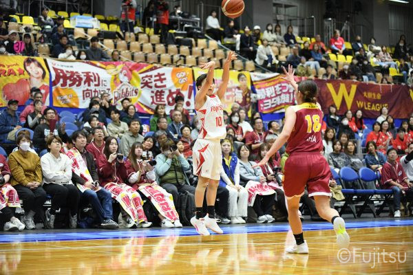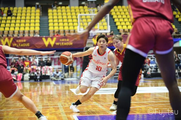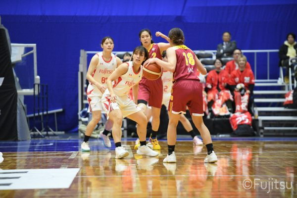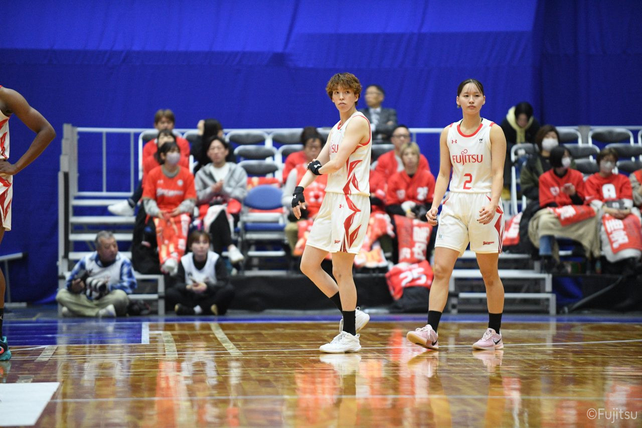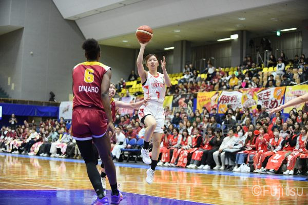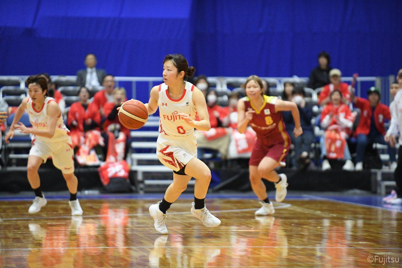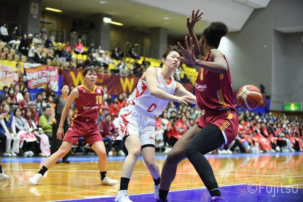 #0山田の3ポイントシュートで先行し、#81宮下から#22エブリンにつながるプレーでリードを保つ。しかし連続3ポイントシュートを決められて、逆転される。それでも#52宮澤、#8テミトペがフリースローを確実に決めてリードを奪い返すと、同点に追いつかれてからは#10町田が3ポイントシュートを決めて、再び先行する。競り合う展開のなかで#10町田のパスを受けた#22エブリンがシュートを決めると、#52宮澤もリバウンドからシュートをねじ込む。終盤には#10町田がドライブからのバックシュートと3ポイントシュートを決めるが44-45、1点のビハインドで前半を折り返す。