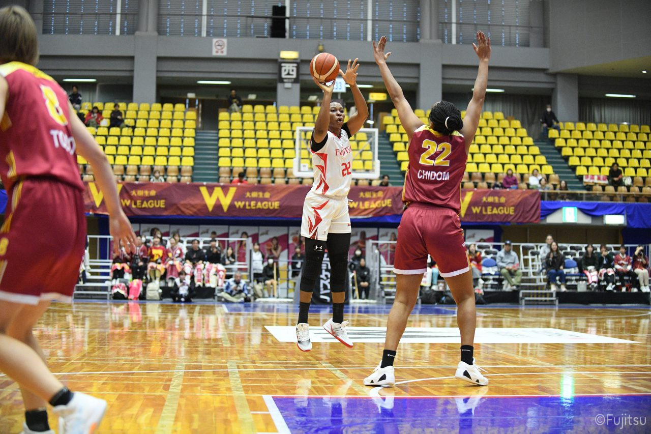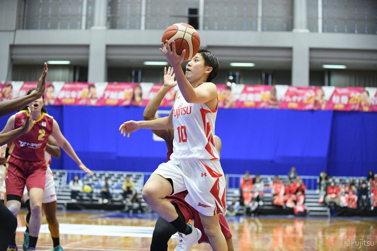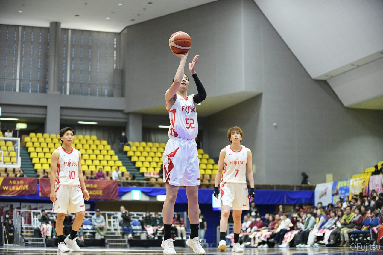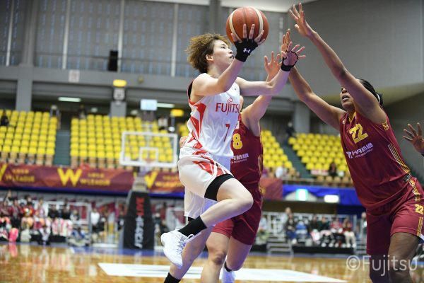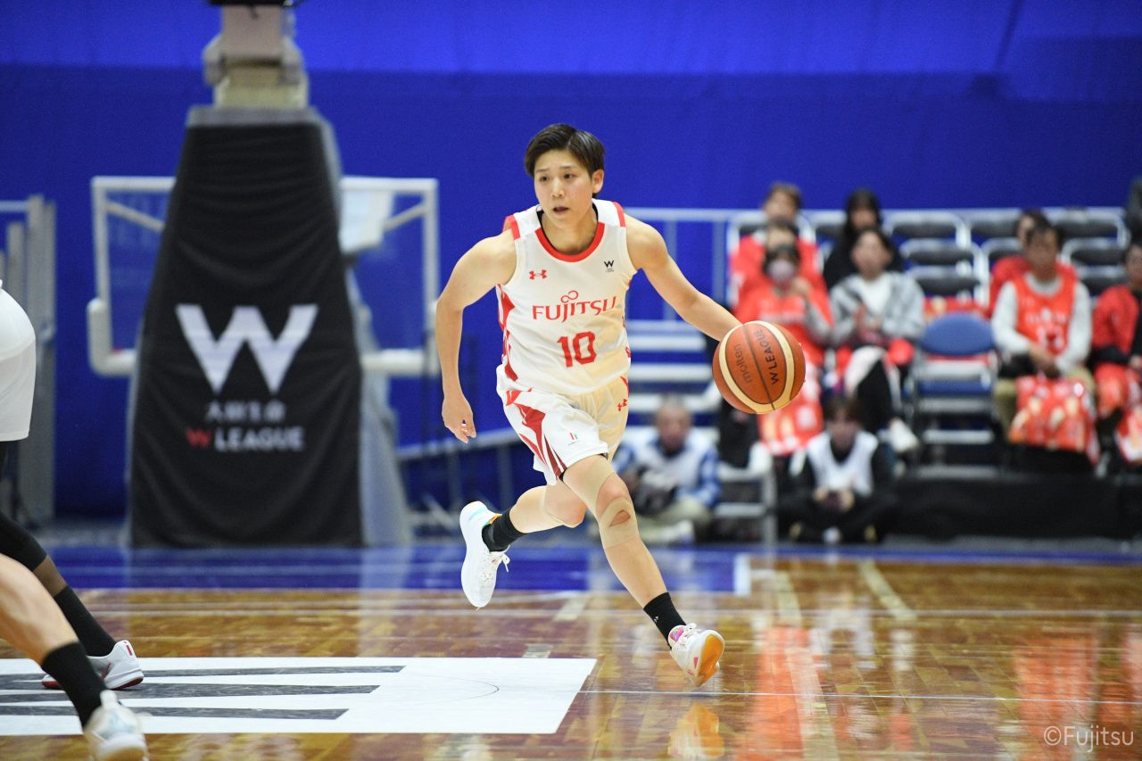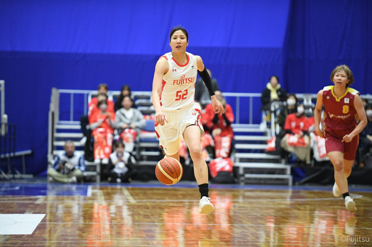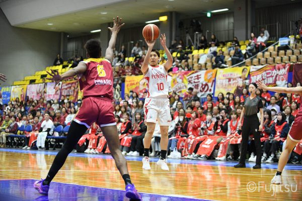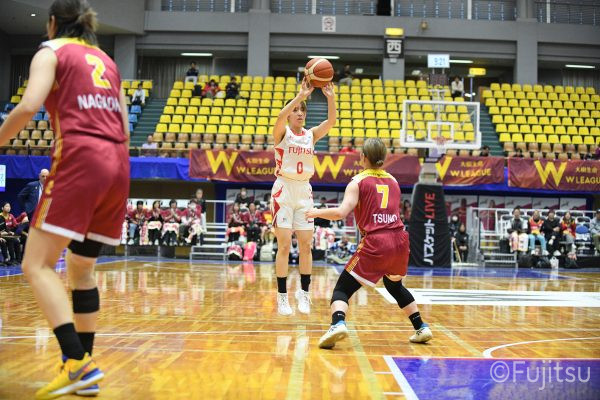 #0山田の3ポイントシュートで先行し、#81宮下から#22エブリンにつながるプレーでリードを保つ。しかし連続3ポイントシュートを決められて、逆転される。それでも#52宮澤、#8テミトペがフリースローを確実に決めてリードを奪い返すと、同点に追いつかれてからは#10町田が3ポイントシュートを決めて、再び先行する。競り合う展開のなかで#10町田のパスを受けた#22エブリンがシュートを決めると、#52宮澤もリバウンドからシュートをねじ込む。終盤には#10町田がドライブからのバックシュートと3ポイントシュートを決めるが44-45、1点のビハインドで前半を折り返す。