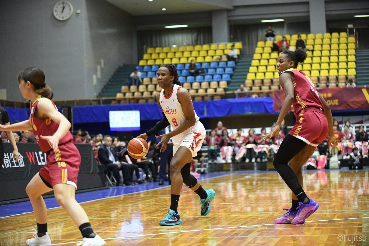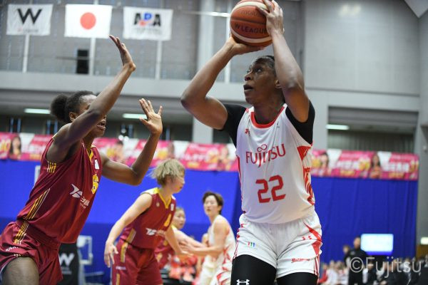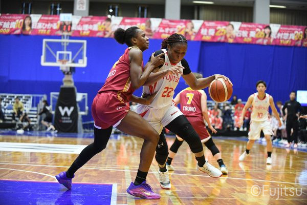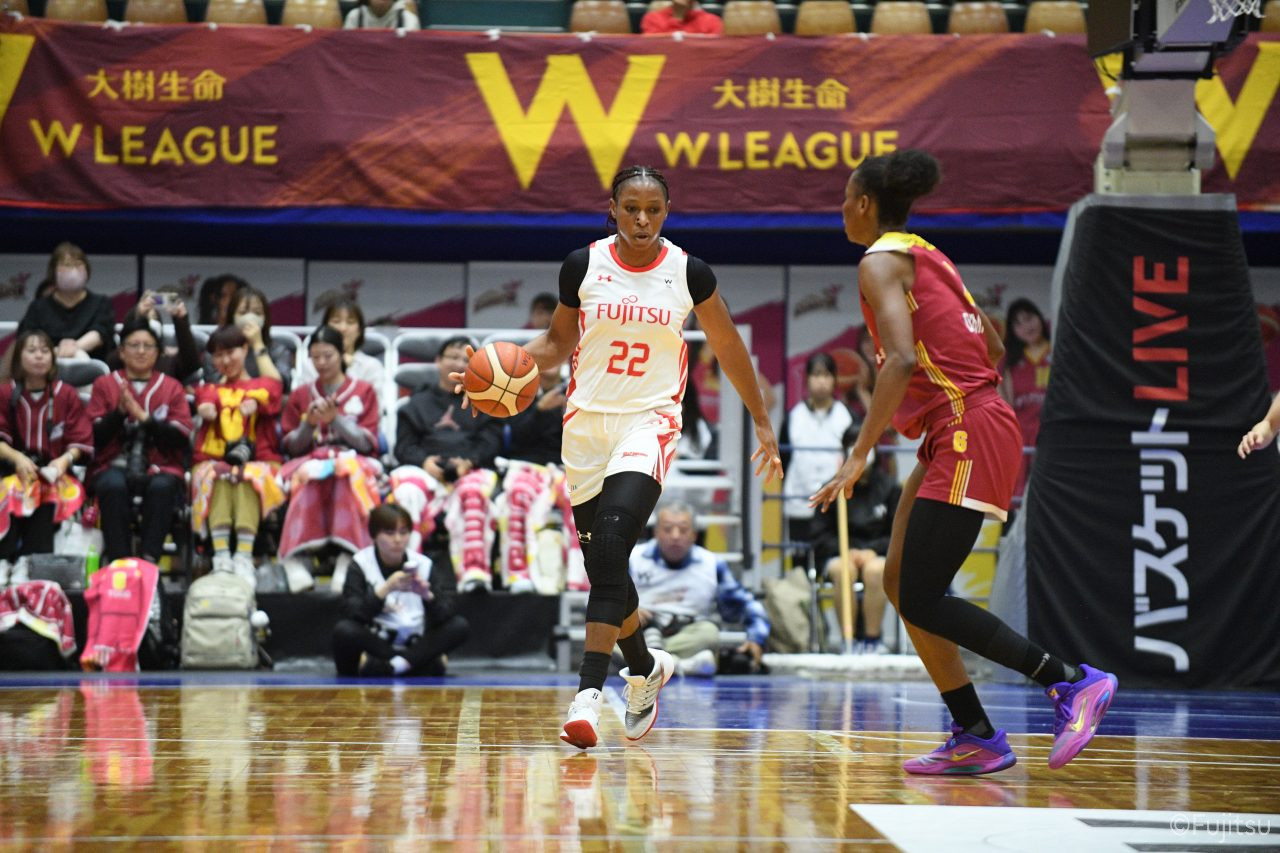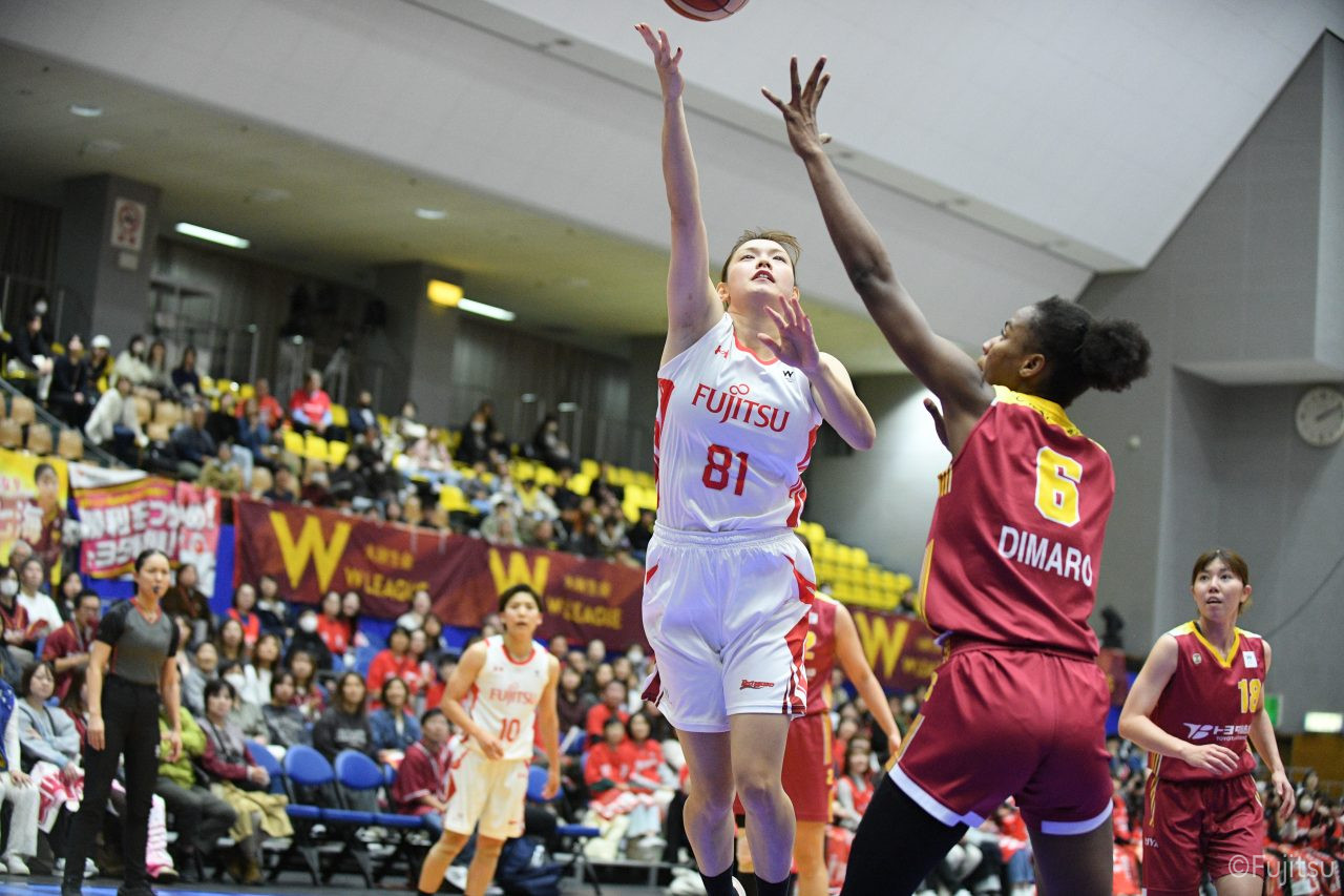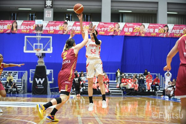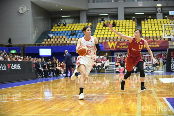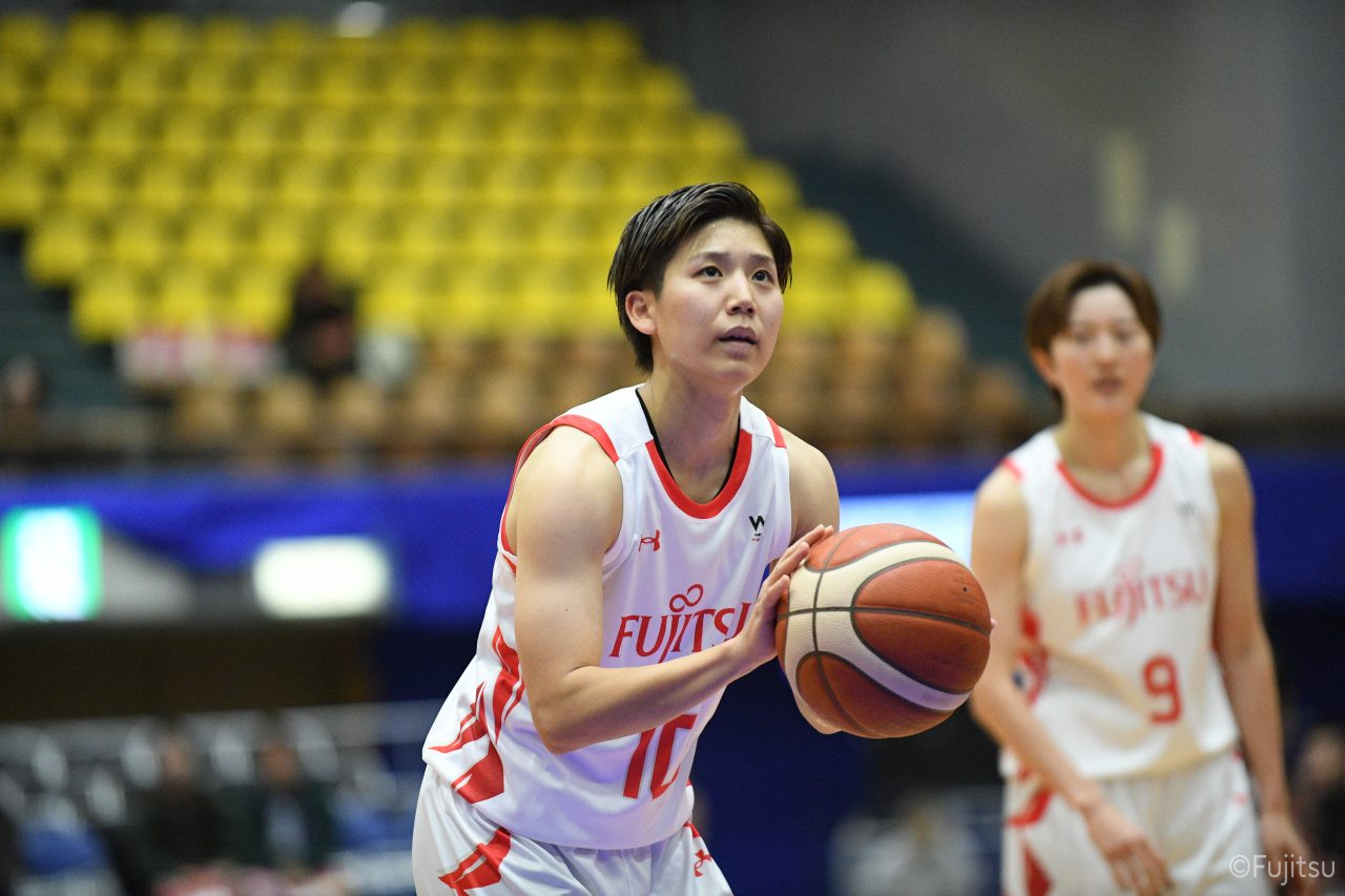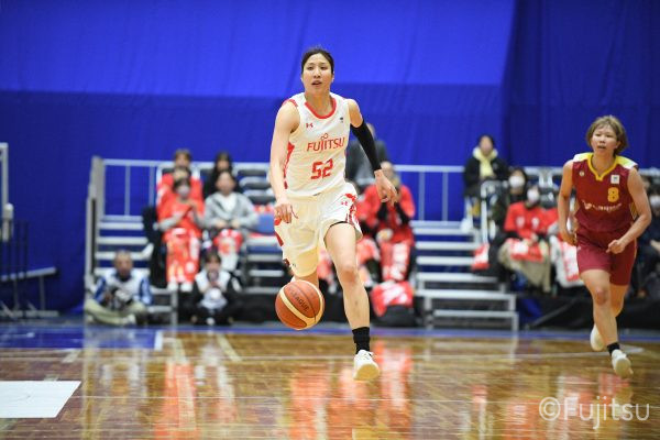 #0山田の3ポイントシュートで先行し、#81宮下から#22エブリンにつながるプレーでリードを保つ。しかし連続3ポイントシュートを決められて、逆転される。それでも#52宮澤、#8テミトペがフリースローを確実に決めてリードを奪い返すと、同点に追いつかれてからは#10町田が3ポイントシュートを決めて、再び先行する。競り合う展開のなかで#10町田のパスを受けた#22エブリンがシュートを決めると、#52宮澤もリバウンドからシュートをねじ込む。終盤には#10町田がドライブからのバックシュートと3ポイントシュートを決めるが44-45、1点のビハインドで前半を折り返す。