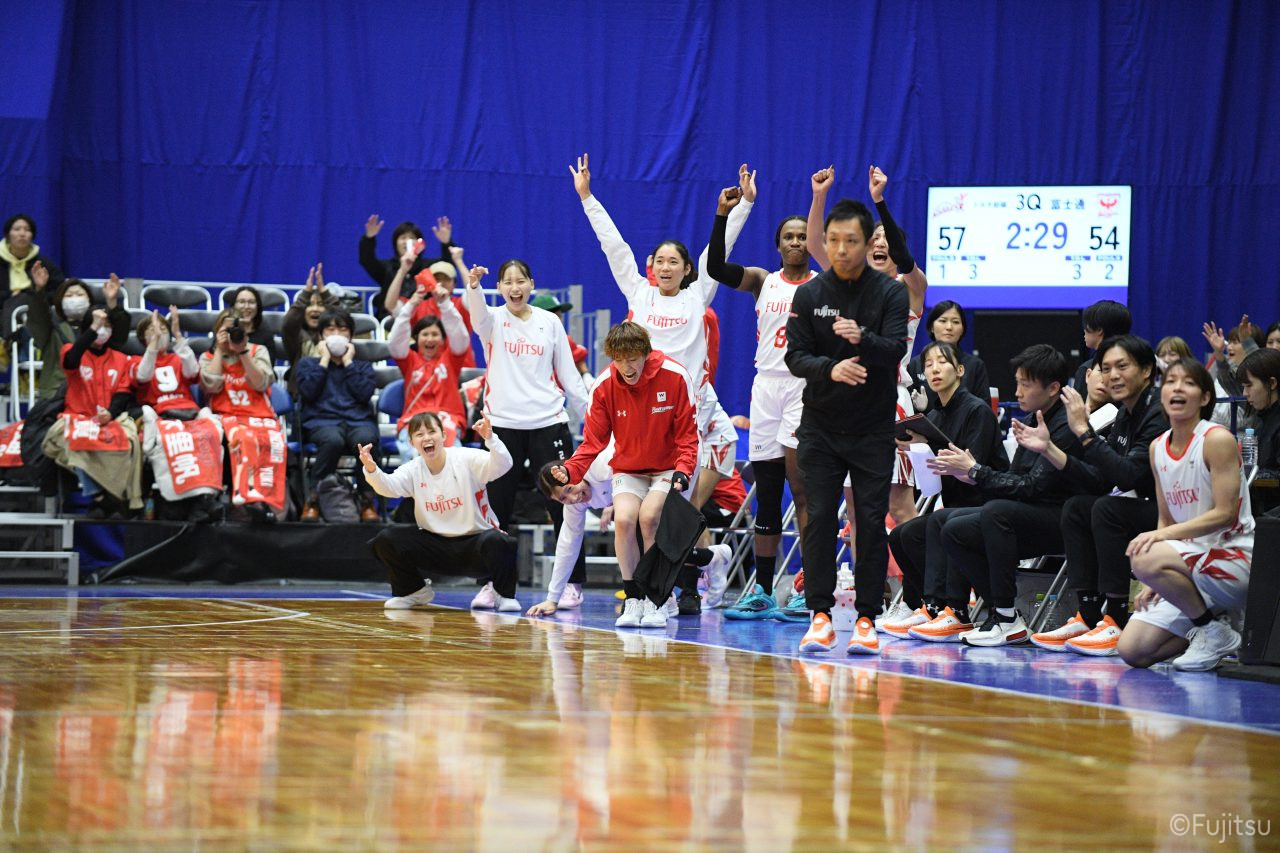 #10町田から#8テミトペにつながるプレーで後半をスタートさせるが、そこから3連続失点。追いかける展開が続く。それでも#8テミトペの連続ゴールで食らいつくと、失点しながらも#52宮澤のフリースローや#22エブリンのシュートでついていく。終盤、セカンドチャンスから#9赤木が3ポイントシュートを沈めて1点差に詰め寄るが、またも失点し、なかなか上回ることができない。#0山田の絶妙なアシストから#8テミトペが決めた後も失点。逆に最後の3ポイントシュートは決まらず、58-63で第3Qを終える。