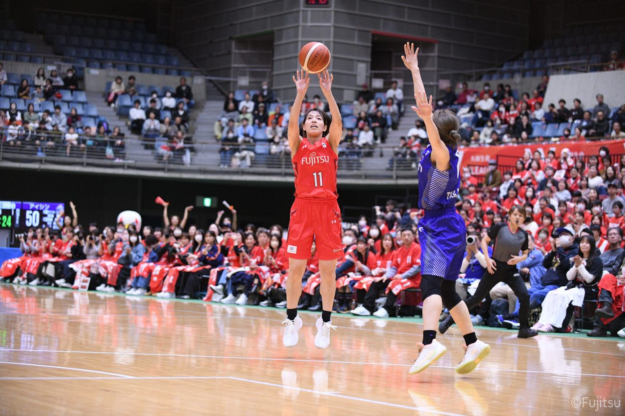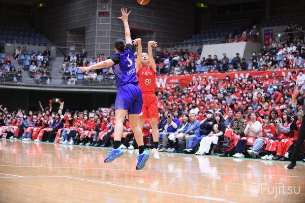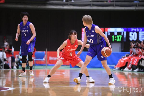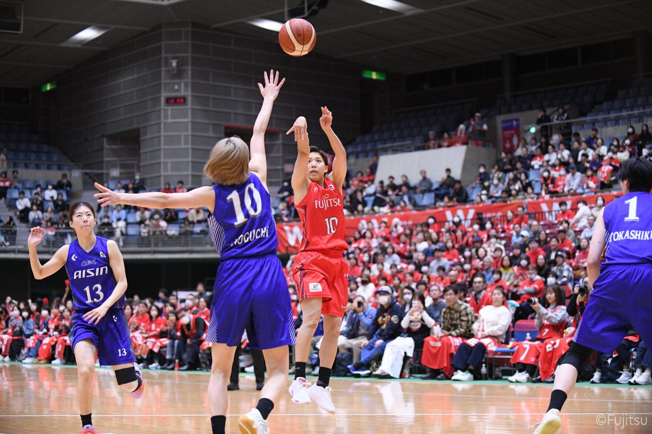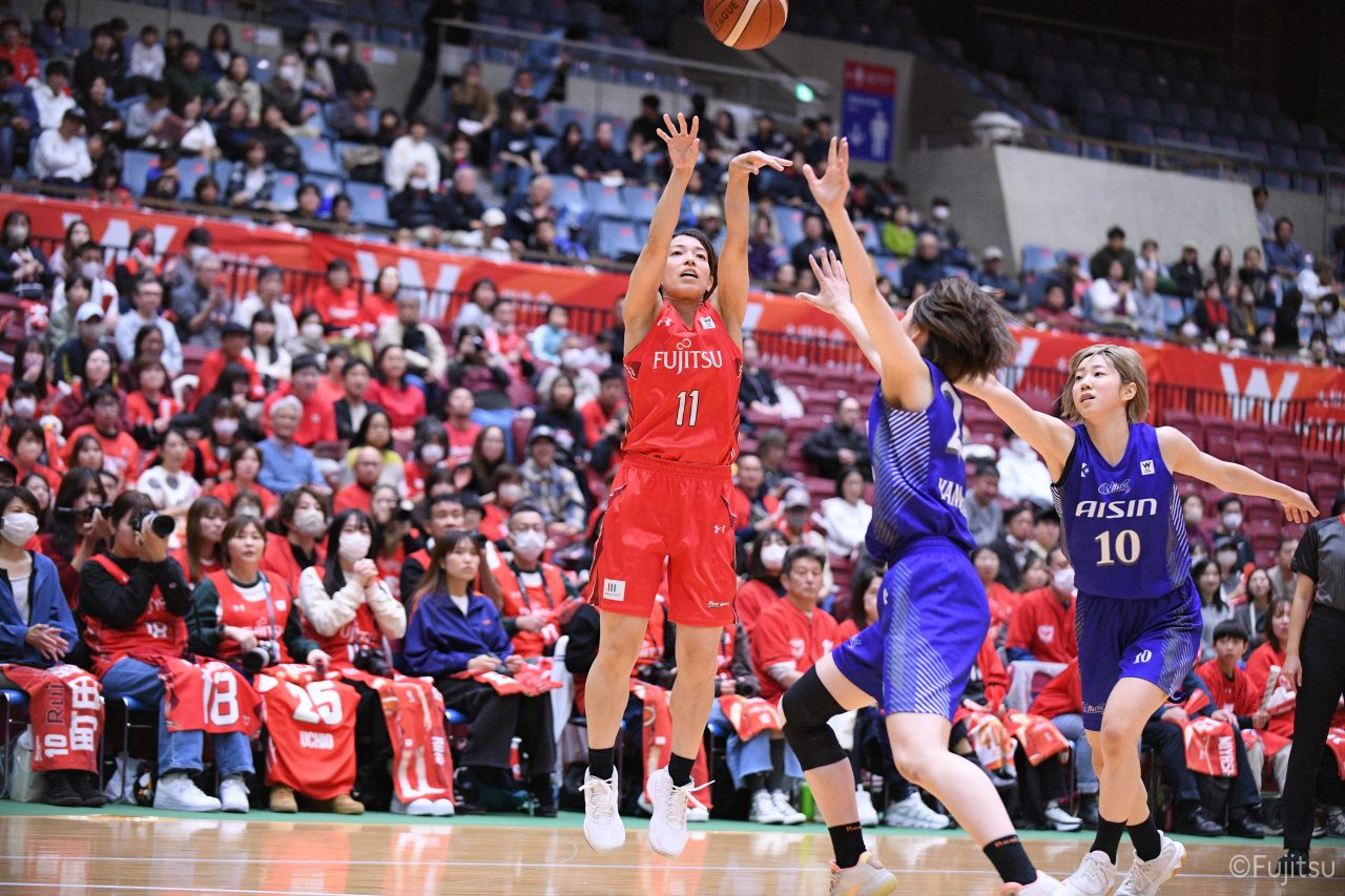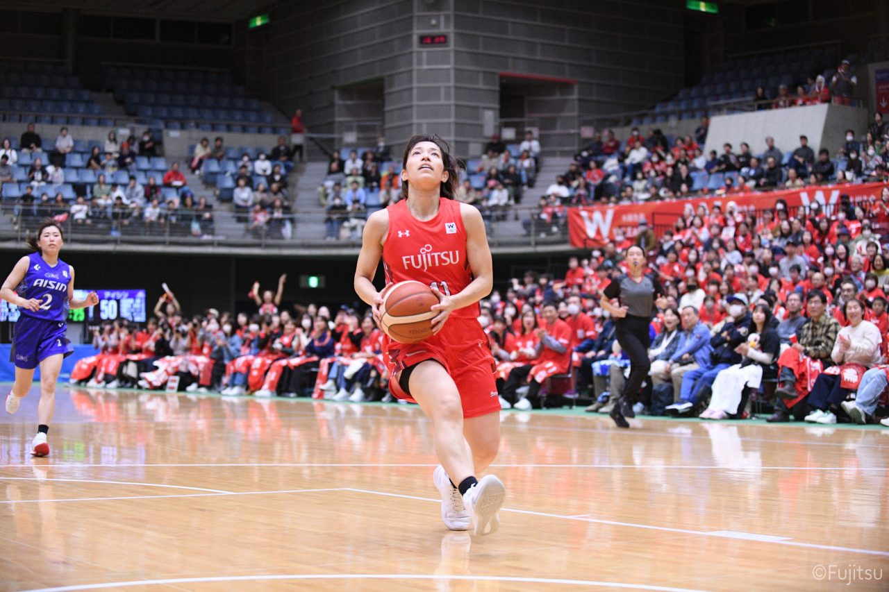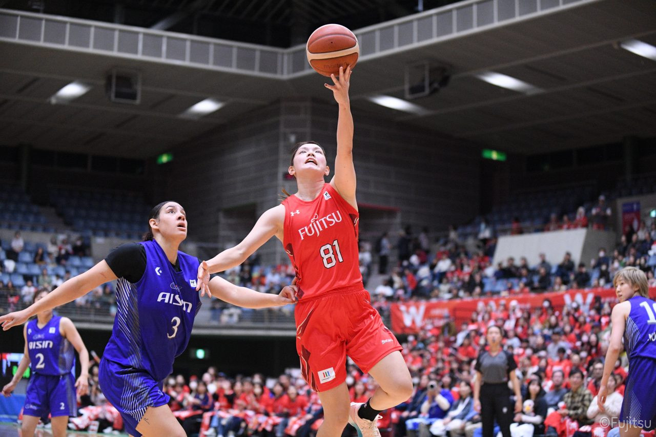 後半はターンオーバーからの失点でスタートし、オフェンスも2分間、無得点。しかし#8テミトペがジャンプシュートを決めると、#81宮下と#7林(咲)からそれぞれアシストを受けた#8テミトペが連続得点をあげ、リードを広げる。アイシンのタイムアウト明けには#7林(咲)がスティールからの速攻を決める。ディフェンスも立ち上がりの失点以降、約5分、失点をゼロにする。終盤には失点する場面を出たが、#8テミトペや#10町田のシュート、#81宮下の3ポイントシュートでリードを保ち、最後は#0山田のパスを受けた#22エブリンがブザービーターでゴール下のシュートをねじ込む。第3Qを59-50で終える。
