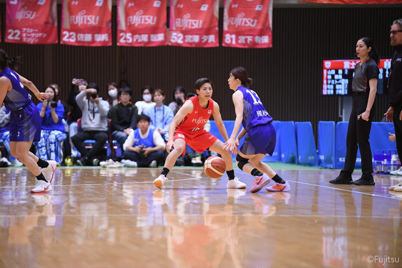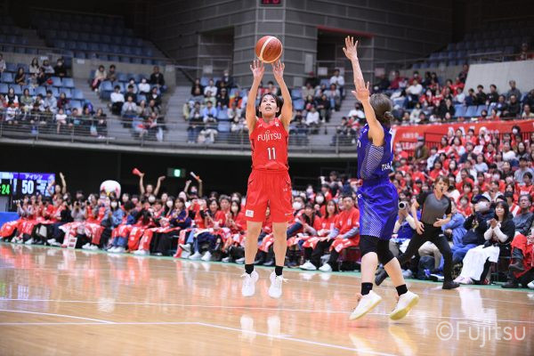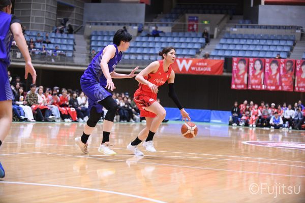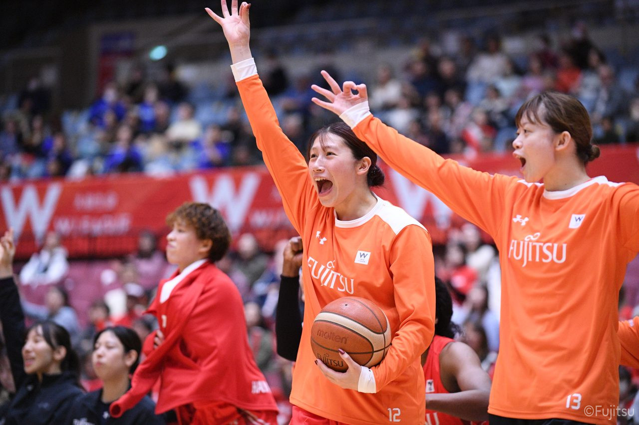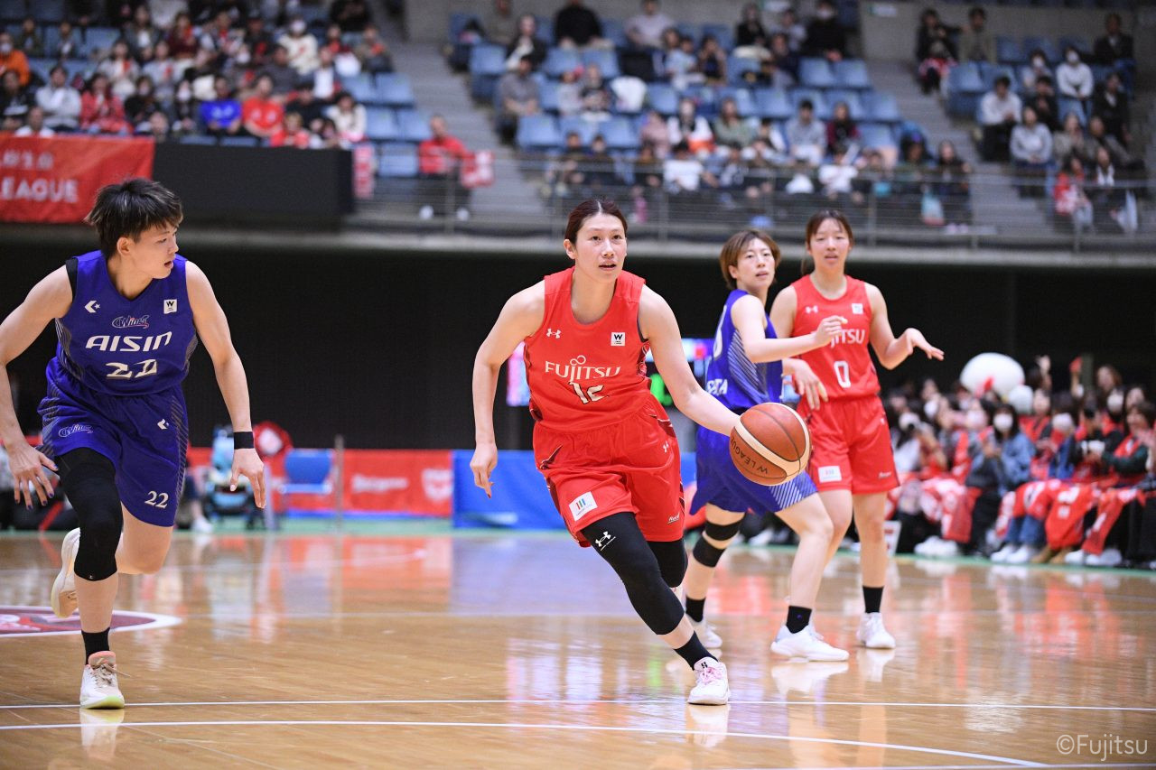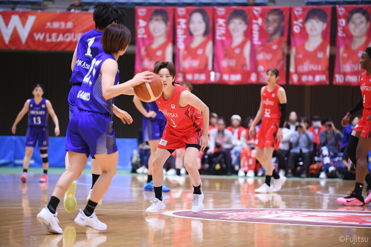 後半はターンオーバーからの失点でスタートし、オフェンスも2分間、無得点。しかし#8テミトペがジャンプシュートを決めると、#81宮下と#7林(咲)からそれぞれアシストを受けた#8テミトペが連続得点をあげ、リードを広げる。アイシンのタイムアウト明けには#7林(咲)がスティールからの速攻を決める。ディフェンスも立ち上がりの失点以降、約5分、失点をゼロにする。終盤には失点する場面を出たが、#8テミトペや#10町田のシュート、#81宮下の3ポイントシュートでリードを保ち、最後は#0山田のパスを受けた#22エブリンがブザービーターでゴール下のシュートをねじ込む。第3Qを59-50で終える。