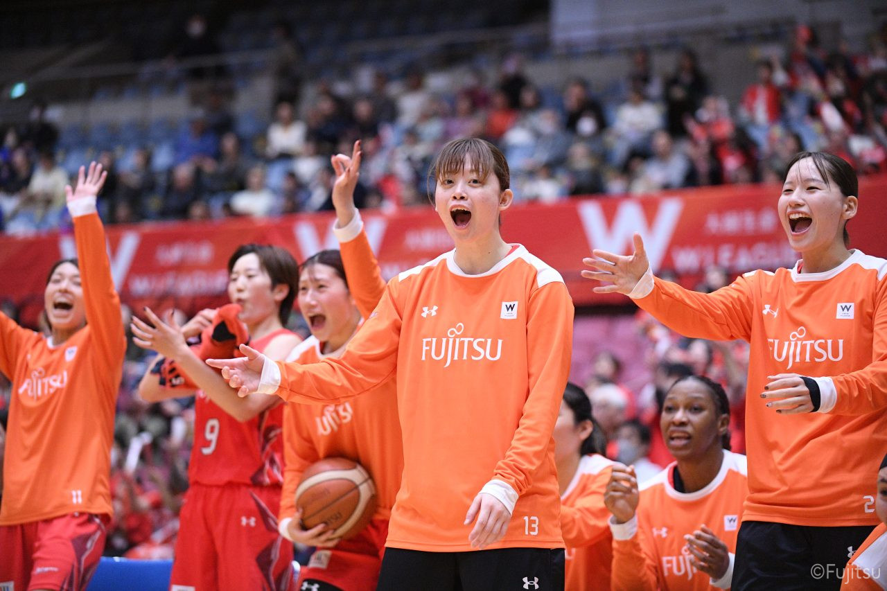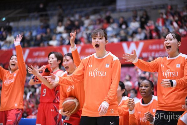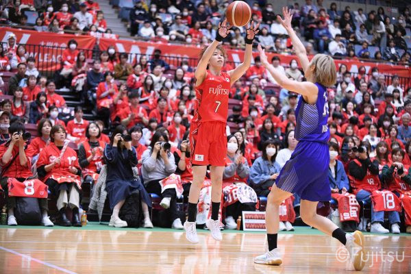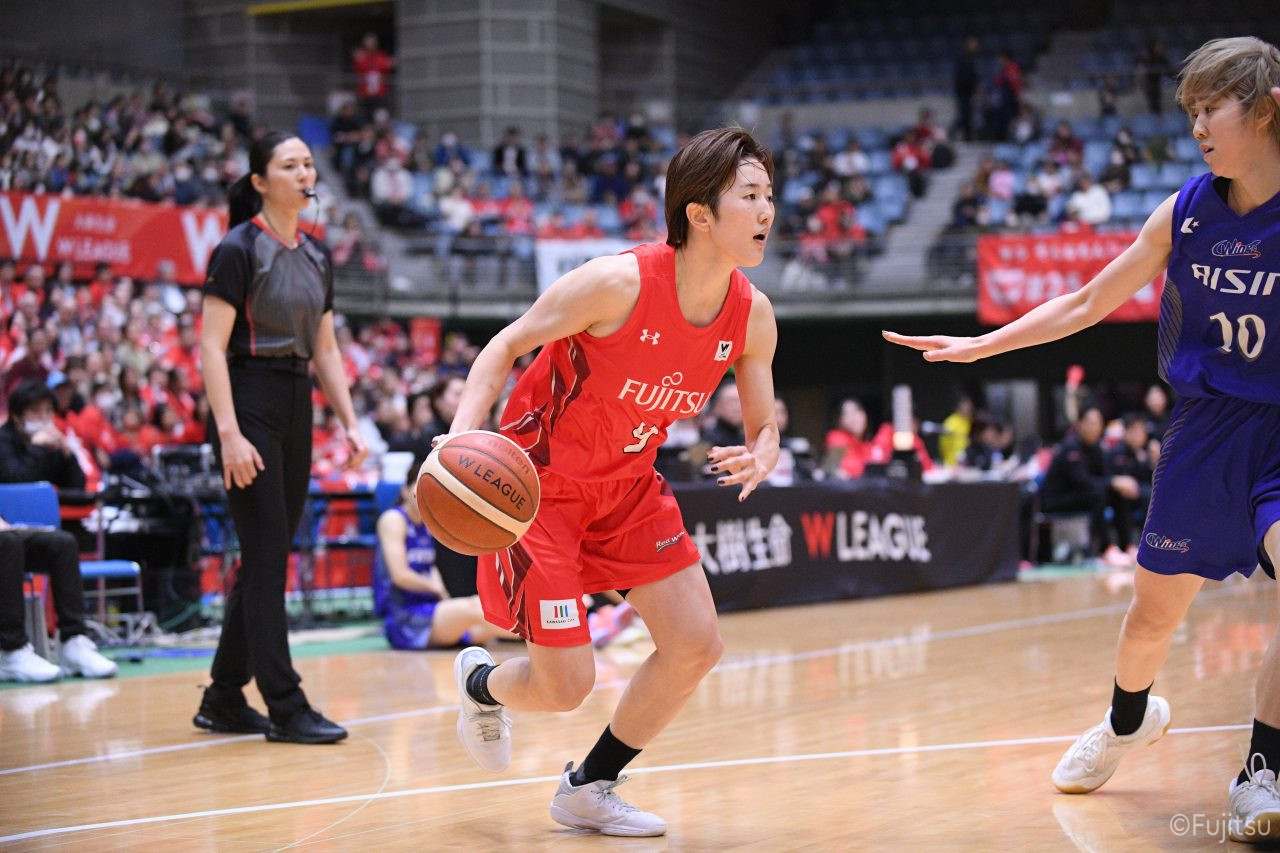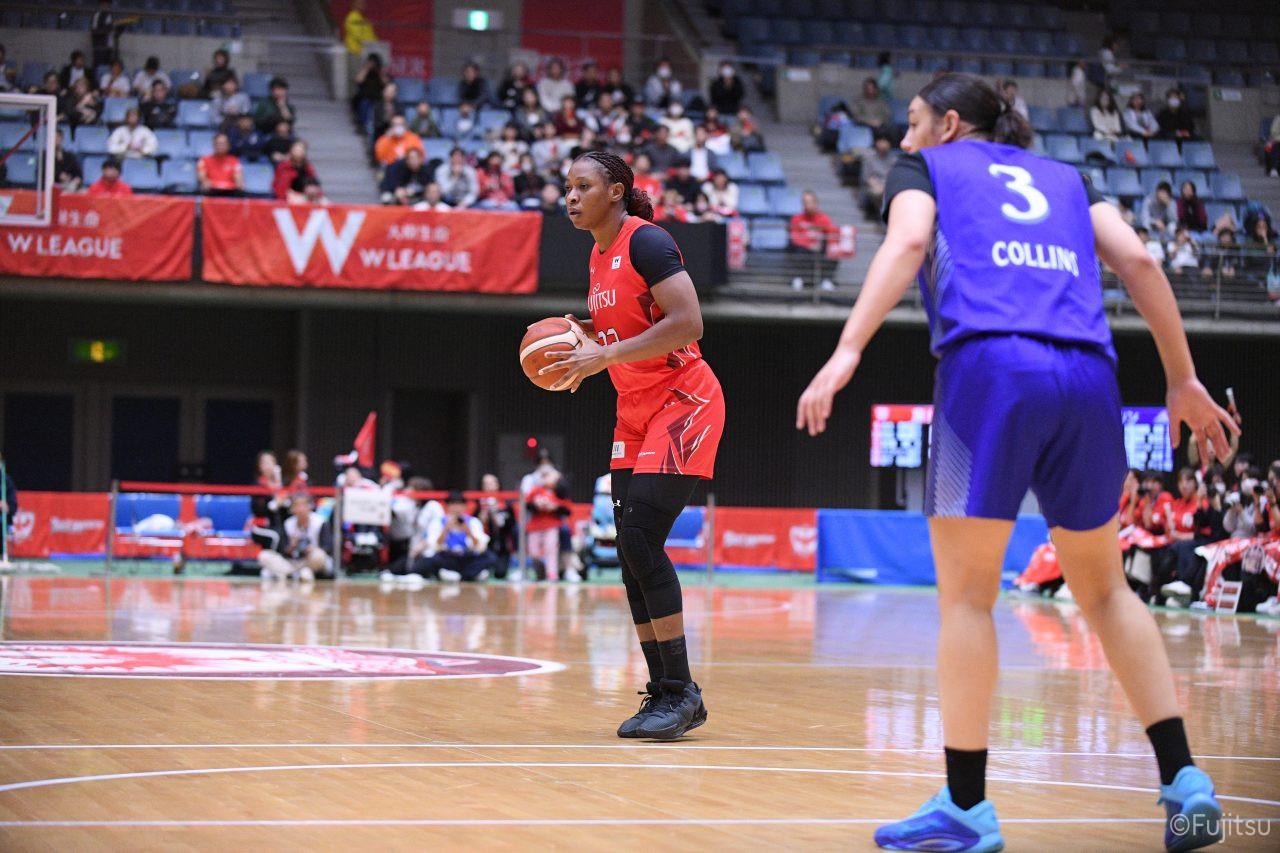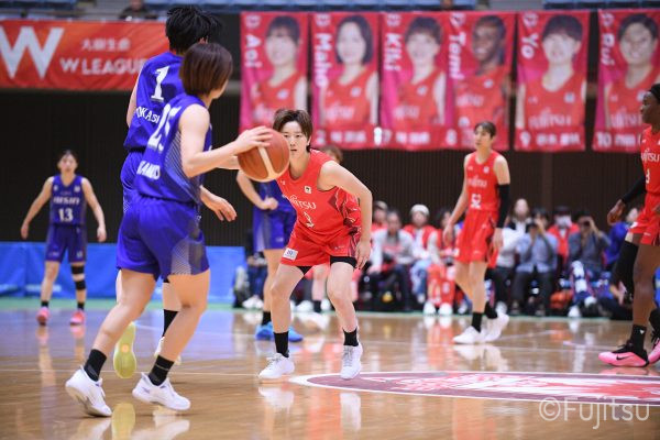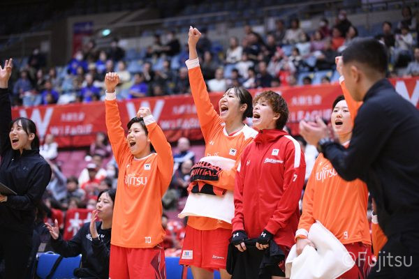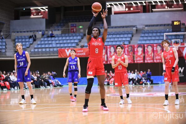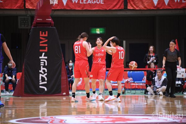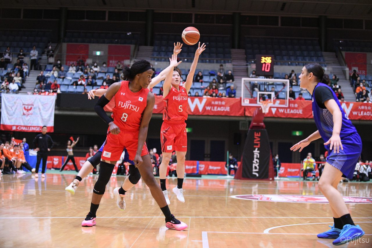 後半はターンオーバーからの失点でスタートし、オフェンスも2分間、無得点。しかし#8テミトペがジャンプシュートを決めると、#81宮下と#7林(咲)からそれぞれアシストを受けた#8テミトペが連続得点をあげ、リードを広げる。アイシンのタイムアウト明けには#7林(咲)がスティールからの速攻を決める。ディフェンスも立ち上がりの失点以降、約5分、失点をゼロにする。終盤には失点する場面を出たが、#8テミトペや#10町田のシュート、#81宮下の3ポイントシュートでリードを保ち、最後は#0山田のパスを受けた#22エブリンがブザービーターでゴール下のシュートをねじ込む。第3Qを59-50で終える。