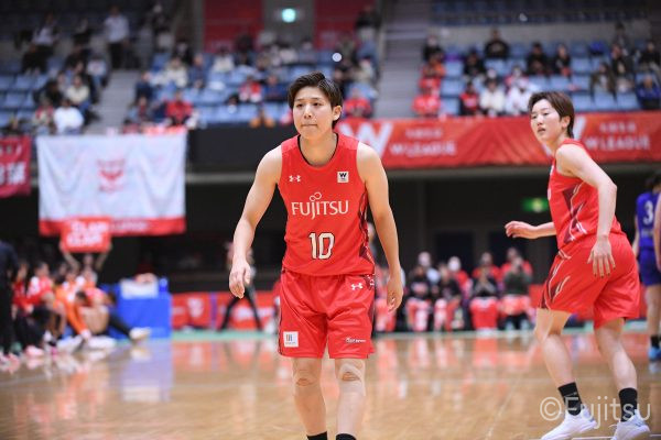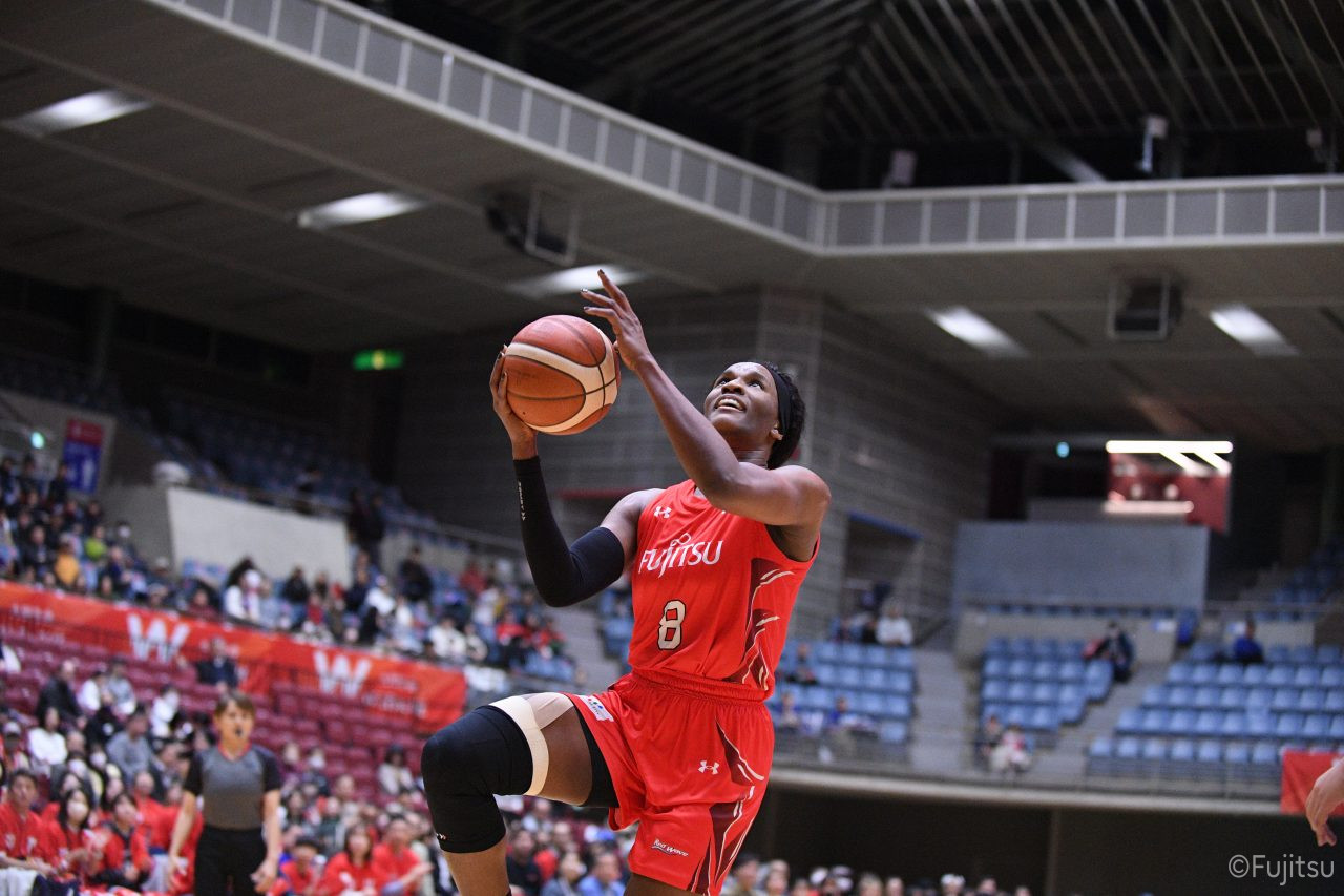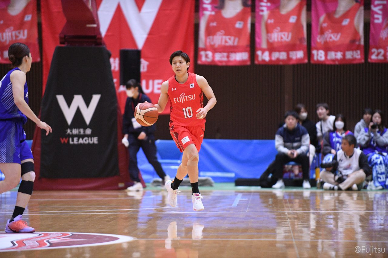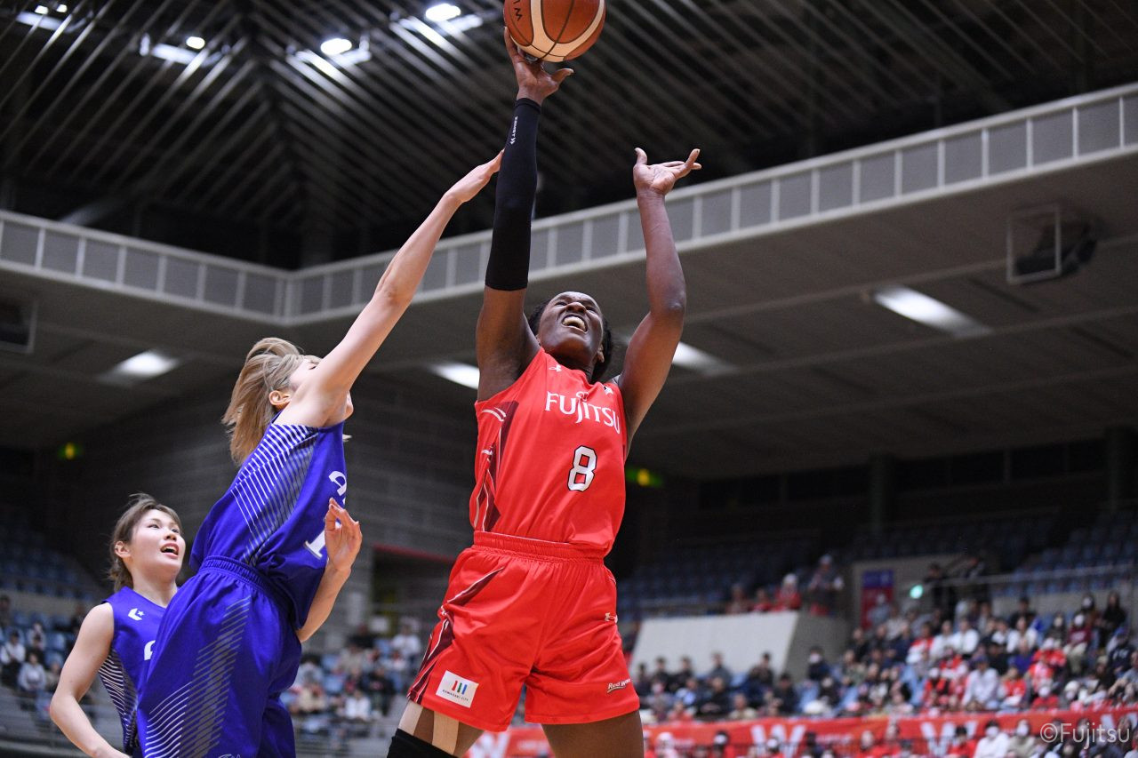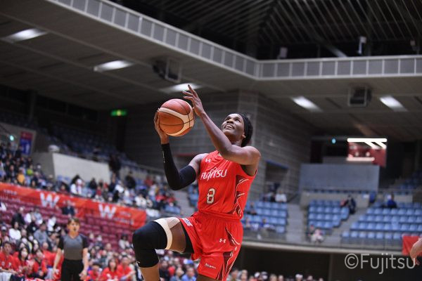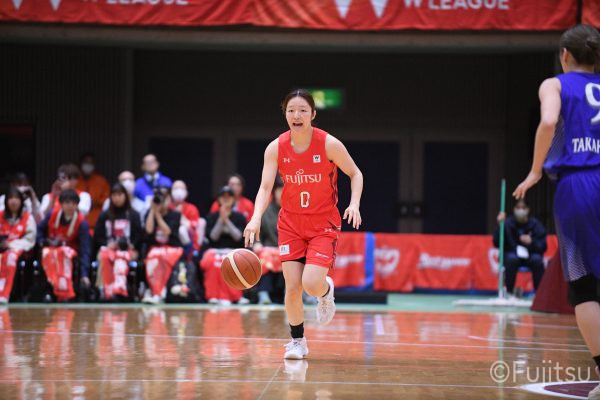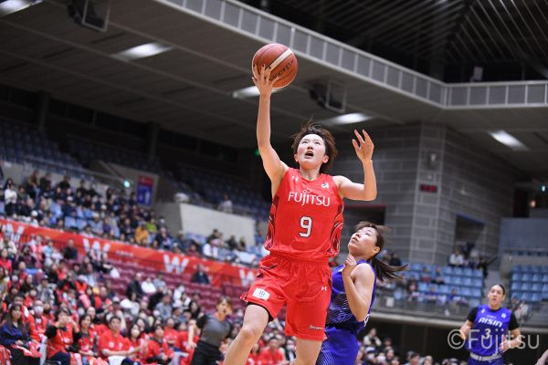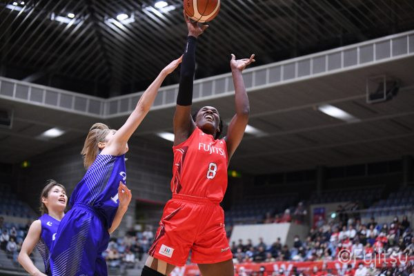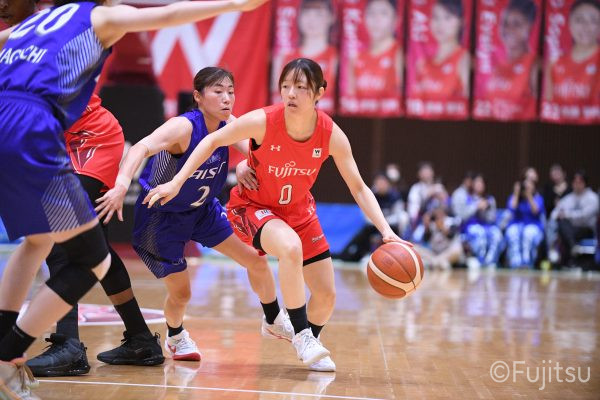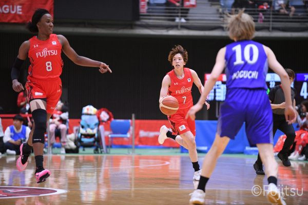 後半はターンオーバーからの失点でスタートし、オフェンスも2分間、無得点。しかし#8テミトペがジャンプシュートを決めると、#81宮下と#7林(咲)からそれぞれアシストを受けた#8テミトペが連続得点をあげ、リードを広げる。アイシンのタイムアウト明けには#7林(咲)がスティールからの速攻を決める。ディフェンスも立ち上がりの失点以降、約5分、失点をゼロにする。終盤には失点する場面を出たが、#8テミトペや#10町田のシュート、#81宮下の3ポイントシュートでリードを保ち、最後は#0山田のパスを受けた#22エブリンがブザービーターでゴール下のシュートをねじ込む。第3Qを59-50で終える。