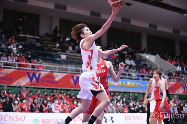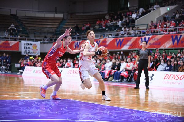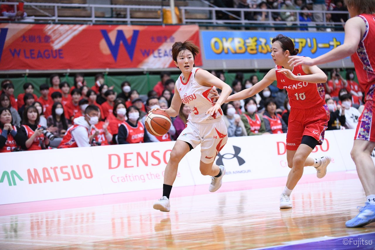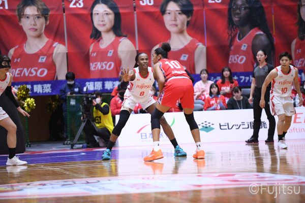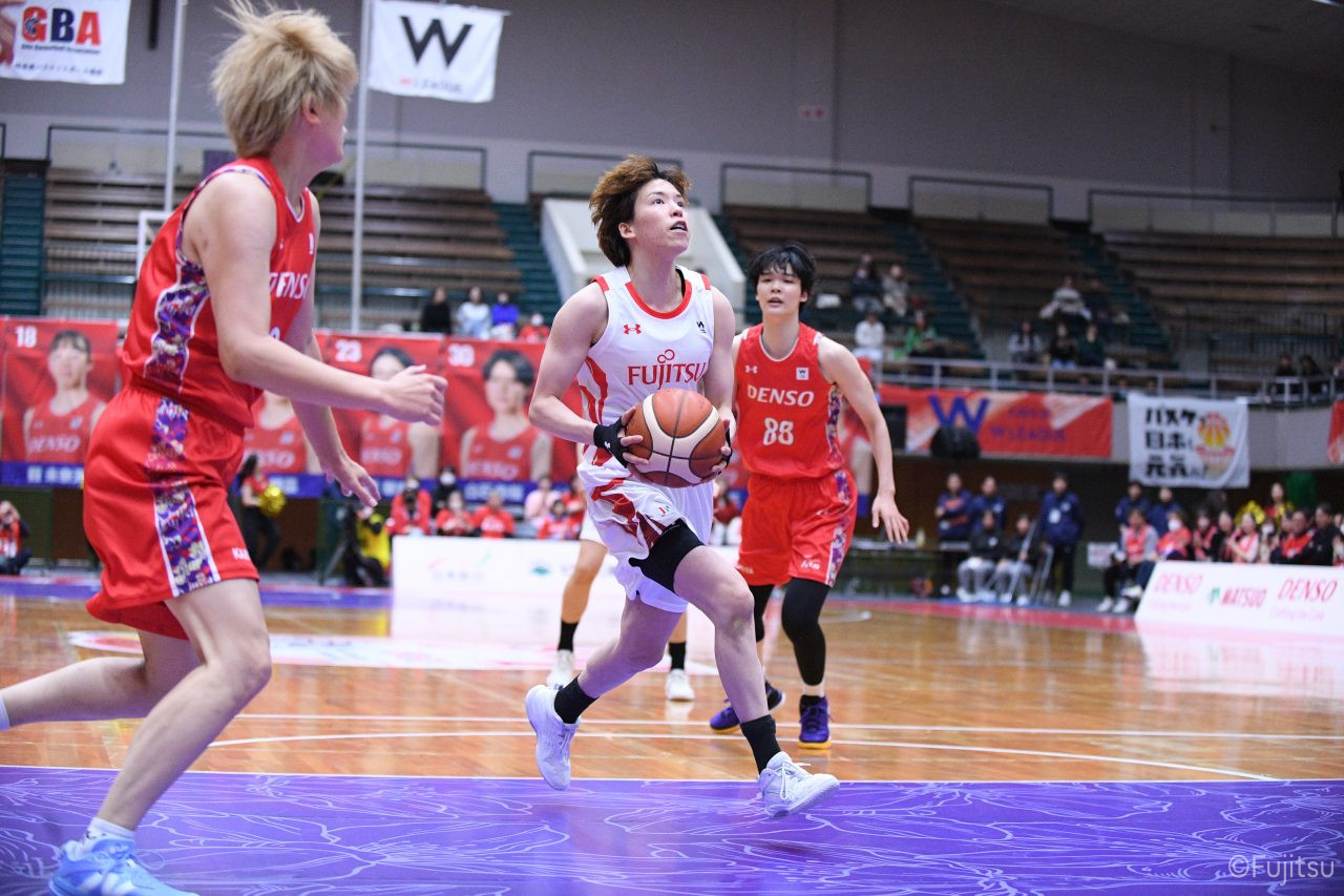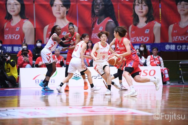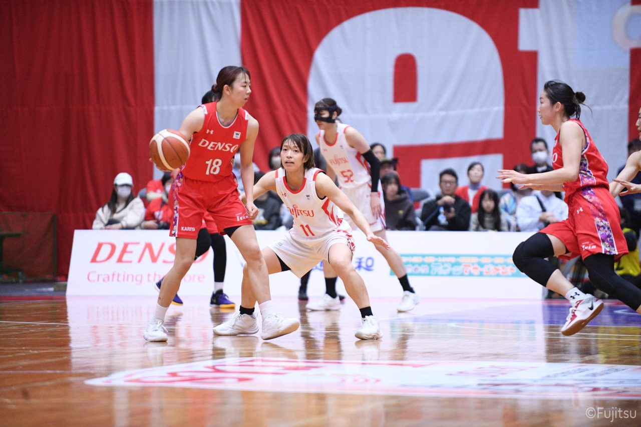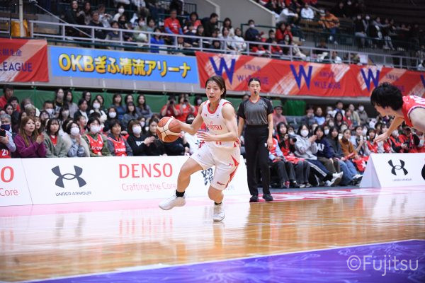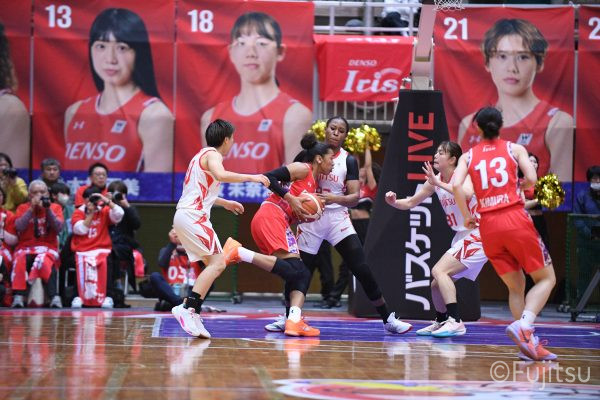 レギュラーシーズンの2周目は岐阜でのデンソー戦から。スタメンは#7林(咲)、#8テミトペ、#9赤木、#10町田、#52宮澤。#10町田から#8テミトペにつながる速攻でゲームをスタートさせると、#7林(咲)が3ポイントシュートと、#18藤本のスクリーンを使ったドライブで得点を重ねる。それでもなかなか得点が伸びていかず、残り2分を切ったところで7-10。#10町田のパスを受けた#81宮下が3ポイントシュートを決めて同点。さらに#11前澤の速攻で一歩抜け出すが、最後に3ポイントシュートを決められ、12-13で第1Qを終える。