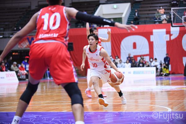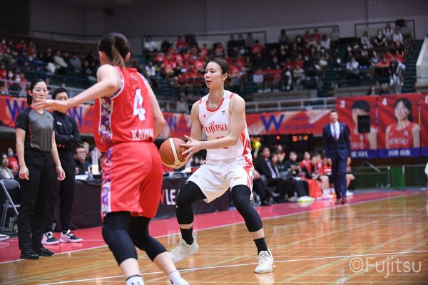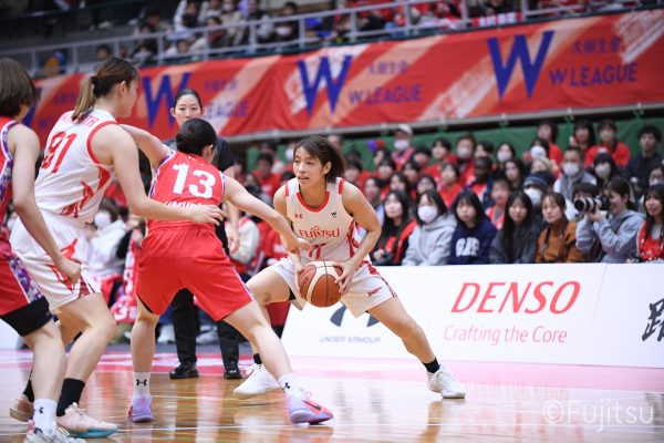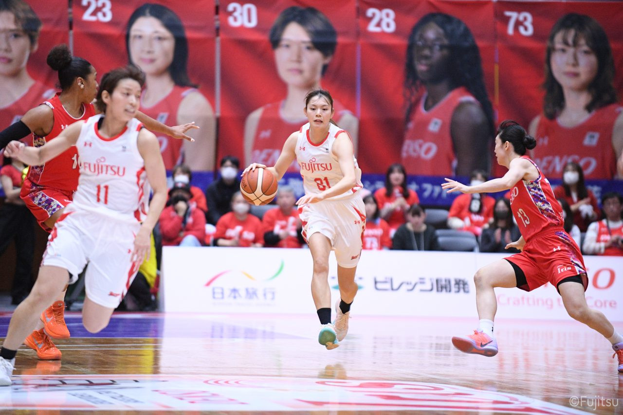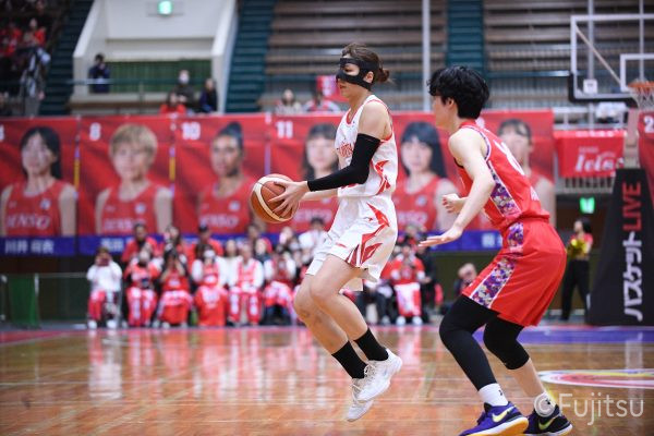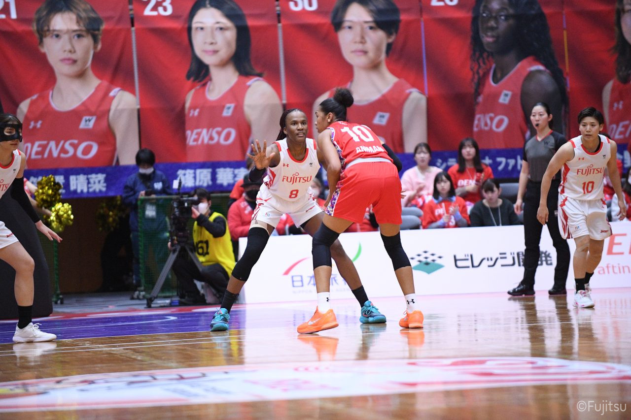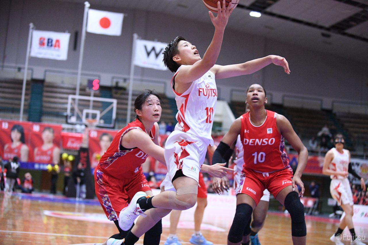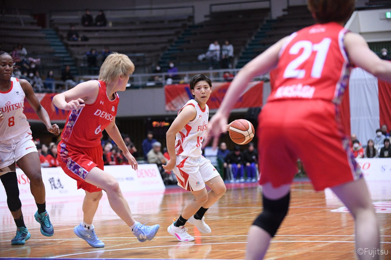 レギュラーシーズンの2周目は岐阜でのデンソー戦から。スタメンは#7林(咲)、#8テミトペ、#9赤木、#10町田、#52宮澤。#10町田から#8テミトペにつながる速攻でゲームをスタートさせると、#7林(咲)が3ポイントシュートと、#18藤本のスクリーンを使ったドライブで得点を重ねる。それでもなかなか得点が伸びていかず、残り2分を切ったところで7-10。#10町田のパスを受けた#81宮下が3ポイントシュートを決めて同点。さらに#11前澤の速攻で一歩抜け出すが、最後に3ポイントシュートを決められ、12-13で第1Qを終える。