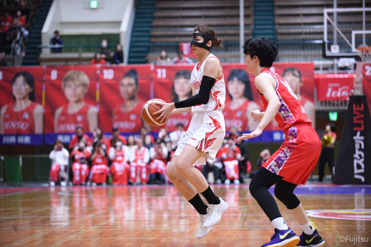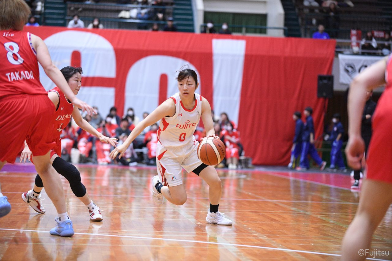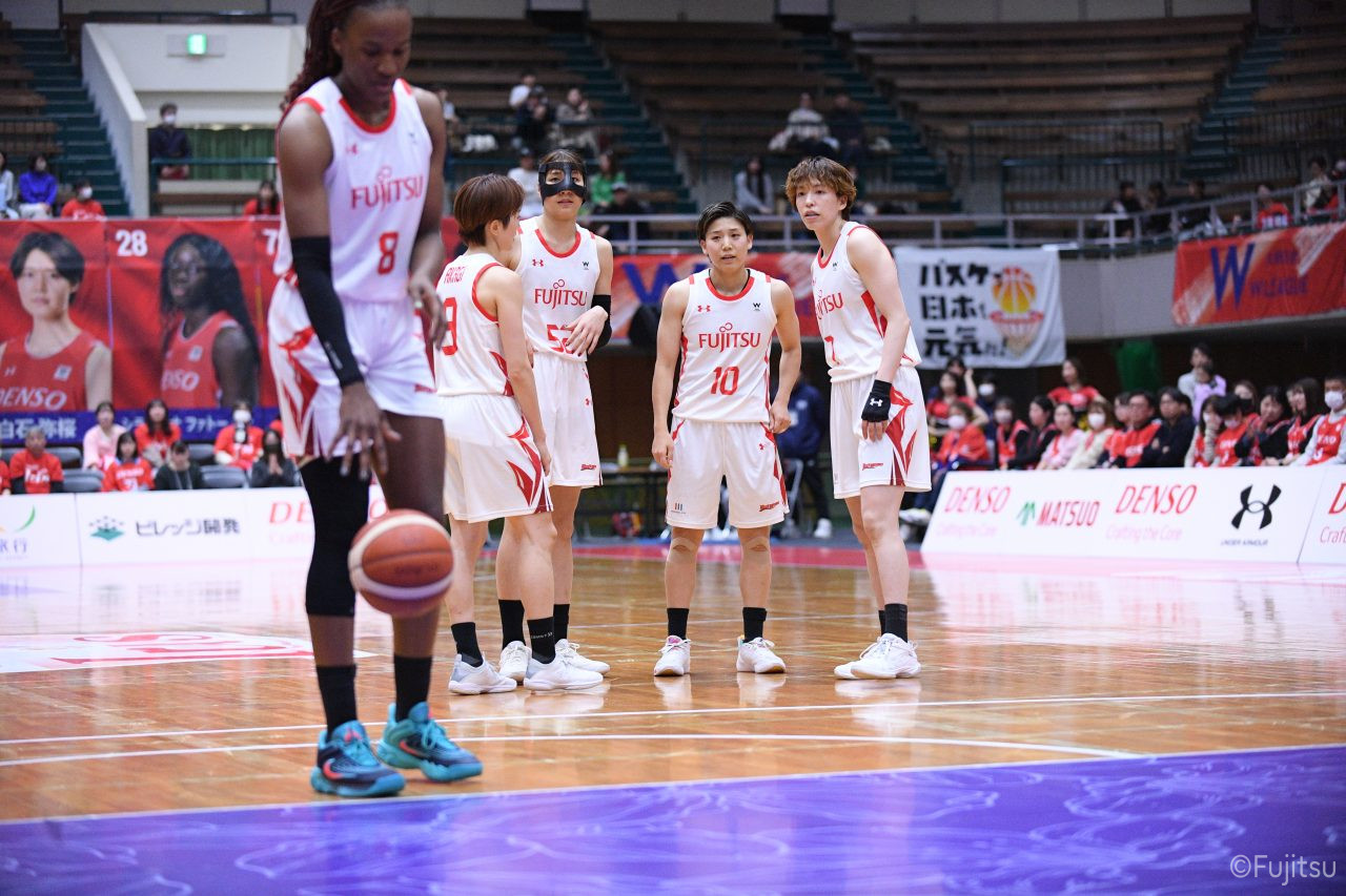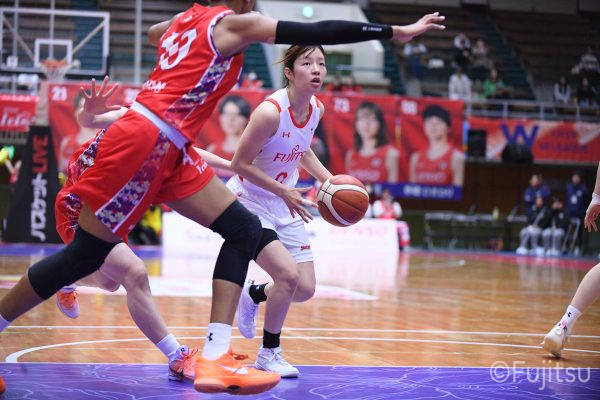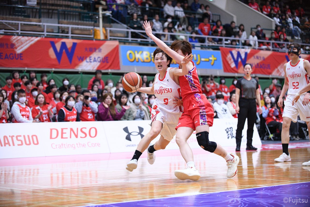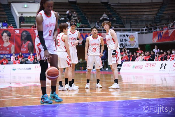 レギュラーシーズンの2周目は岐阜でのデンソー戦から。スタメンは#7林(咲)、#8テミトペ、#9赤木、#10町田、#52宮澤。#10町田から#8テミトペにつながる速攻でゲームをスタートさせると、#7林(咲)が3ポイントシュートと、#18藤本のスクリーンを使ったドライブで得点を重ねる。それでもなかなか得点が伸びていかず、残り2分を切ったところで7-10。#10町田のパスを受けた#81宮下が3ポイントシュートを決めて同点。さらに#11前澤の速攻で一歩抜け出すが、最後に3ポイントシュートを決められ、12-13で第1Qを終える。
