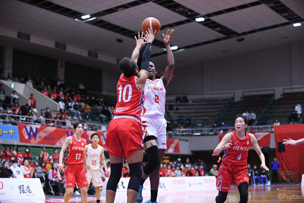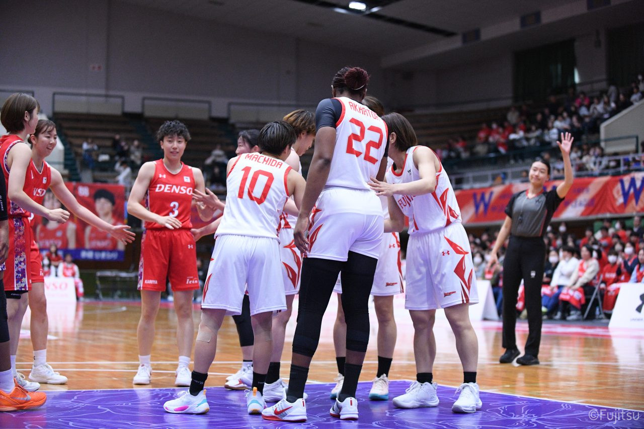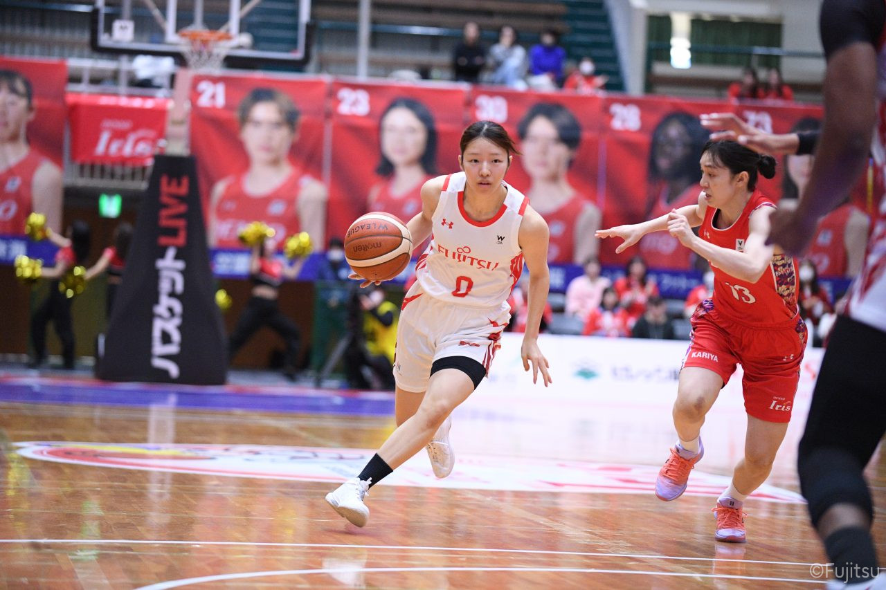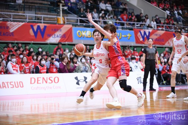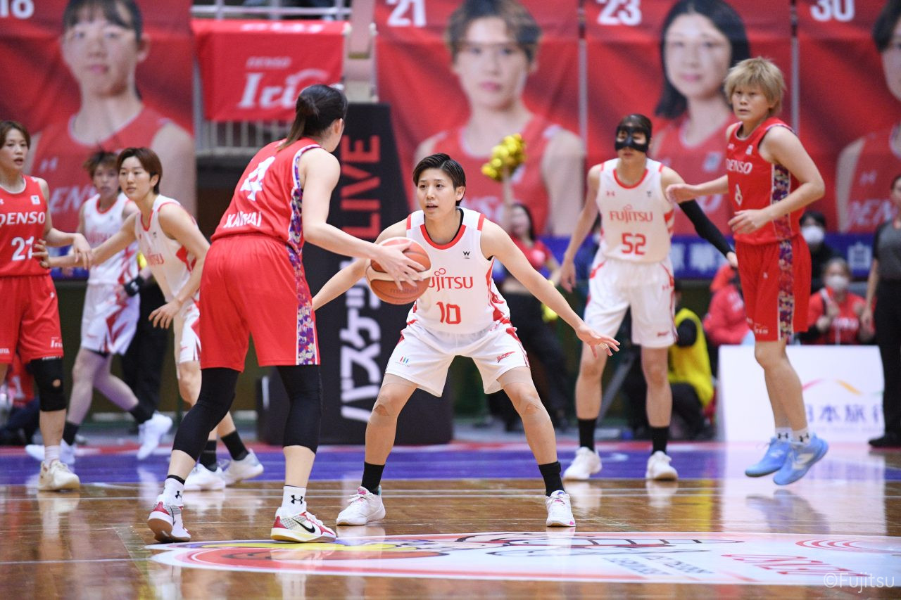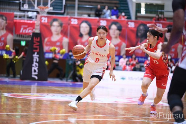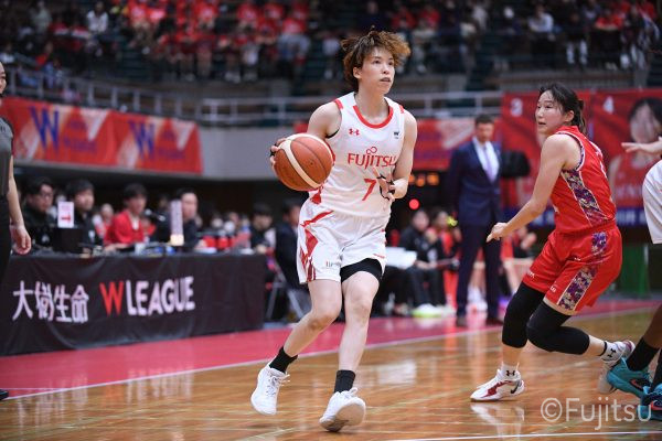 レギュラーシーズンの2周目は岐阜でのデンソー戦から。スタメンは#7林(咲)、#8テミトペ、#9赤木、#10町田、#52宮澤。#10町田から#8テミトペにつながる速攻でゲームをスタートさせると、#7林(咲)が3ポイントシュートと、#18藤本のスクリーンを使ったドライブで得点を重ねる。それでもなかなか得点が伸びていかず、残り2分を切ったところで7-10。#10町田のパスを受けた#81宮下が3ポイントシュートを決めて同点。さらに#11前澤の速攻で一歩抜け出すが、最後に3ポイントシュートを決められ、12-13で第1Qを終える。