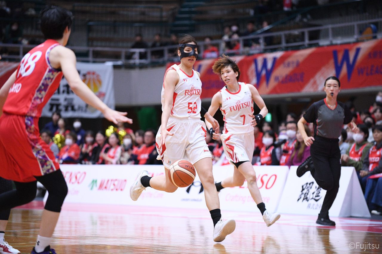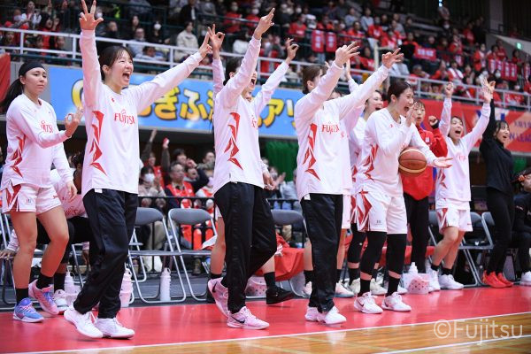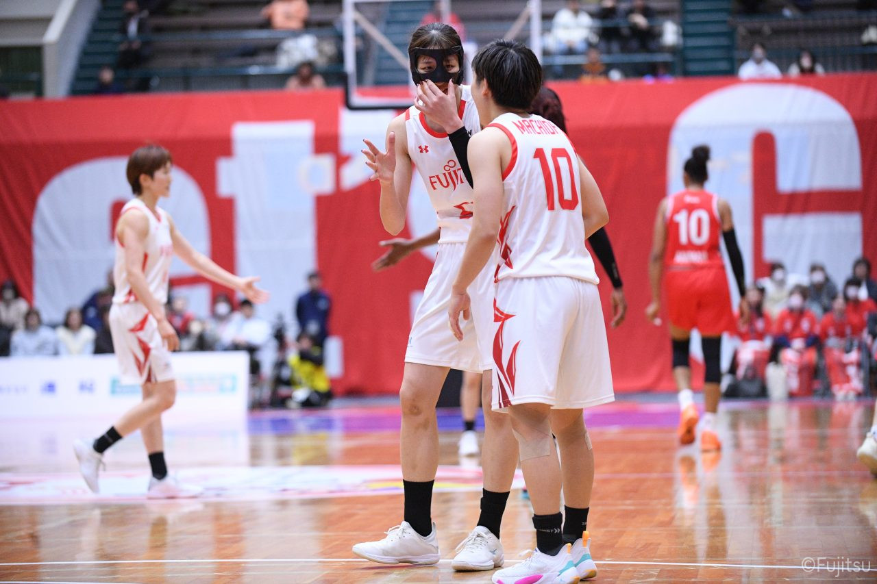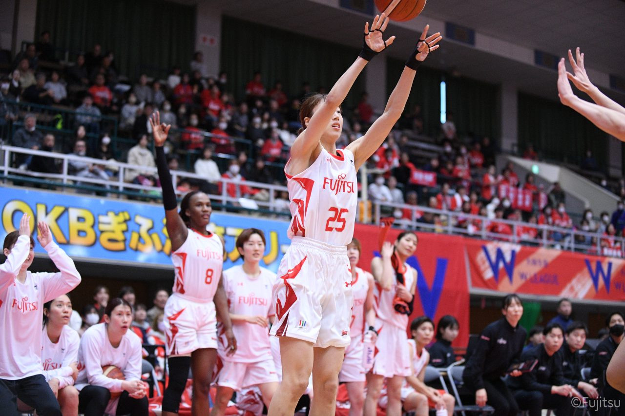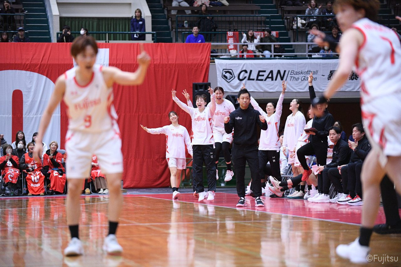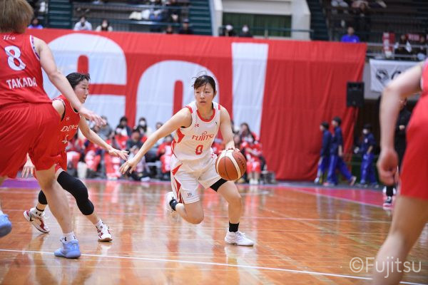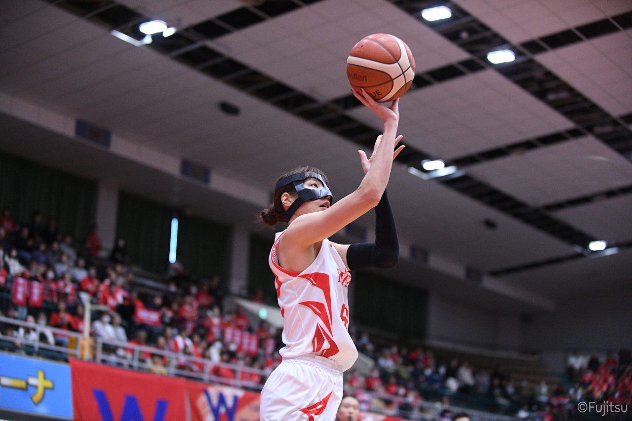 第2Qに入ってもお互いに強度の高いディフェンスを見せ、得点が伸びていかない。そのなかでレッドウェーブは#81宮下の1対1と、#52宮澤のジャンプシュートで得点を積み上げていく。中盤、#9赤木のパスを受けた#52宮澤がジャンプシュートを決めると、#8テミトペはフリースローで続いて、レッドウェーブが一歩抜け出す。さらに#7林(咲)が3ポイントシュートを決め、#11前澤も通算3000得点目となるジャンプシュートを決めて、リードを広げる。最後に失点はしたものの、25-20で前半を折り返す。