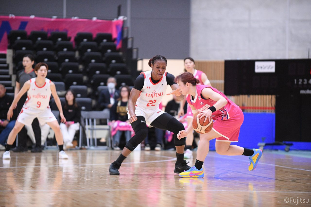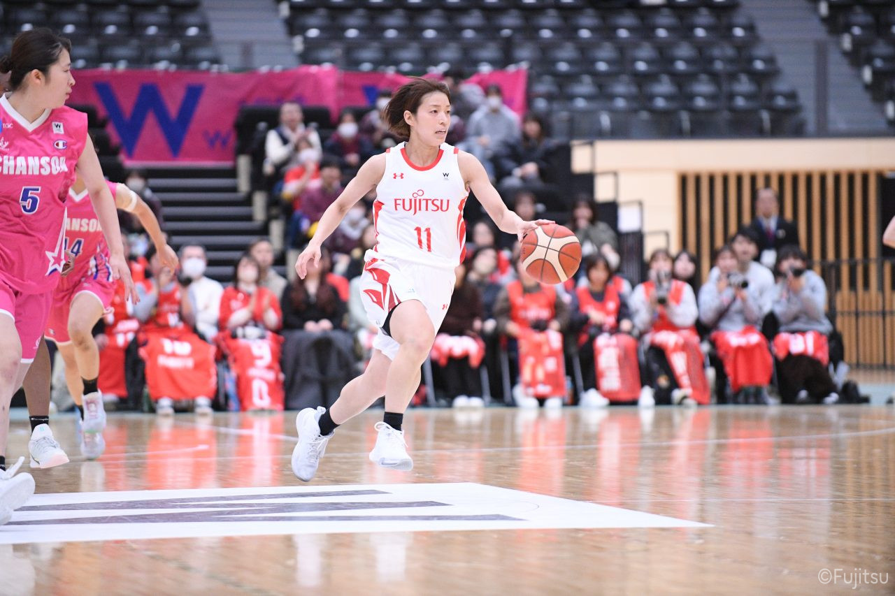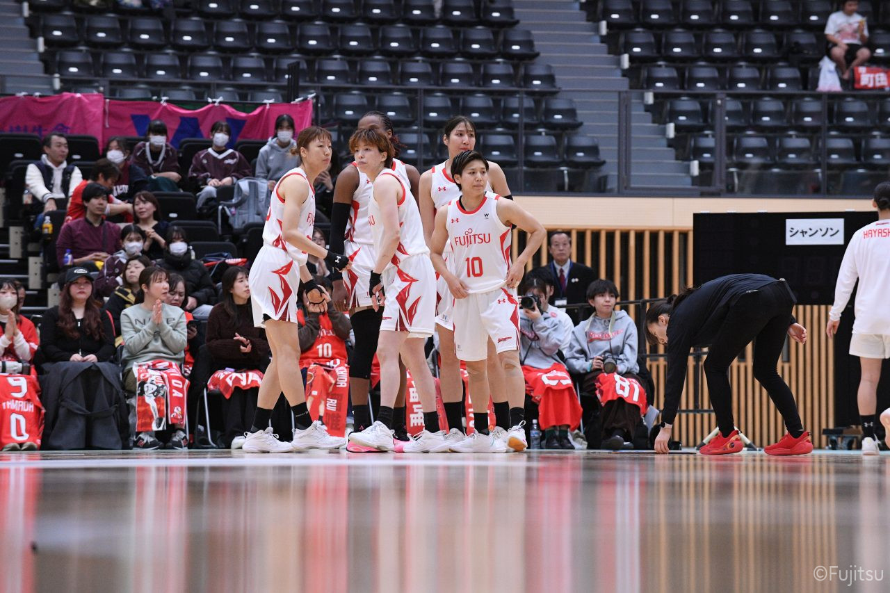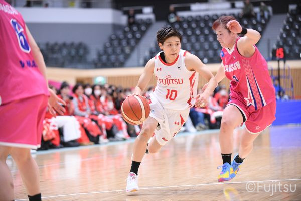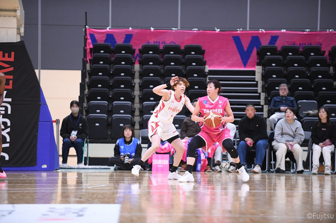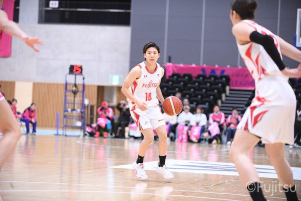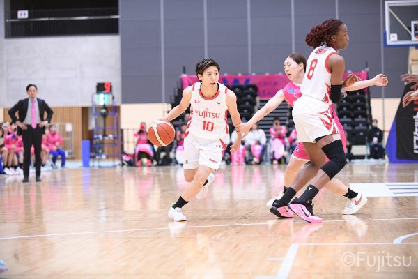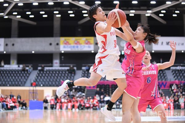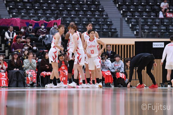 #9赤木のジャンプシュートを皮切りに、#81宮下のWリーグ通算2000得点目となるシュート、#9赤木と\0山田の高速コンビネーションで3連続得点。シャンソン化粧品にタイムアウトを取らせる。その後、両チームともに得点が伸びないなか、#18藤本がフリースローで続いて4連続得点に。ディフェンスは開始から約6分、失点をゼロに抑えていたが、そこから3ポイントシュートを含む3連続失点で2点差とされる。それでも粘り強くプレーし、終盤には#10町田がジャンプシュートを決め、最後は#11前澤が3ポイントシュート。32-27で前半を折り返す。